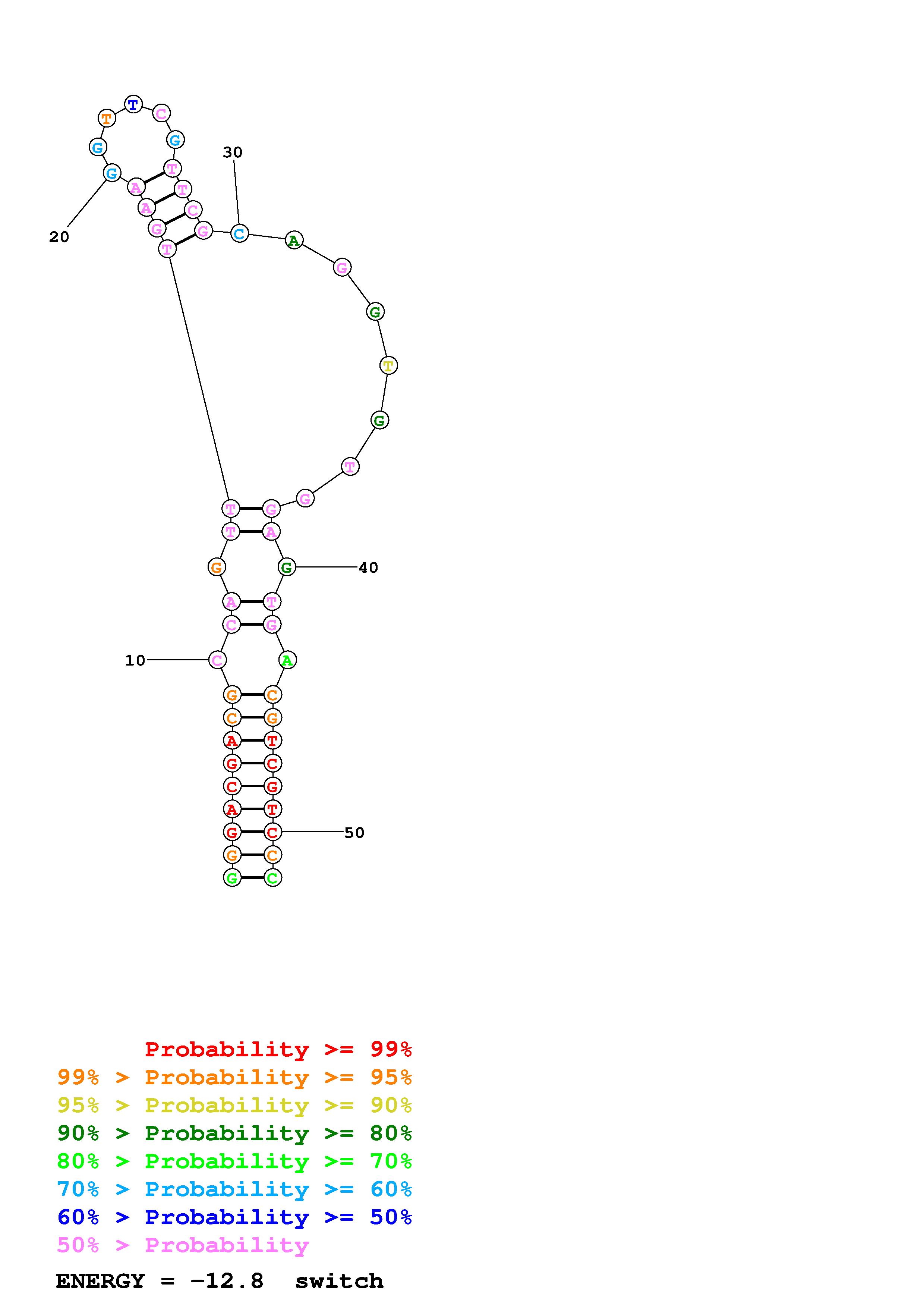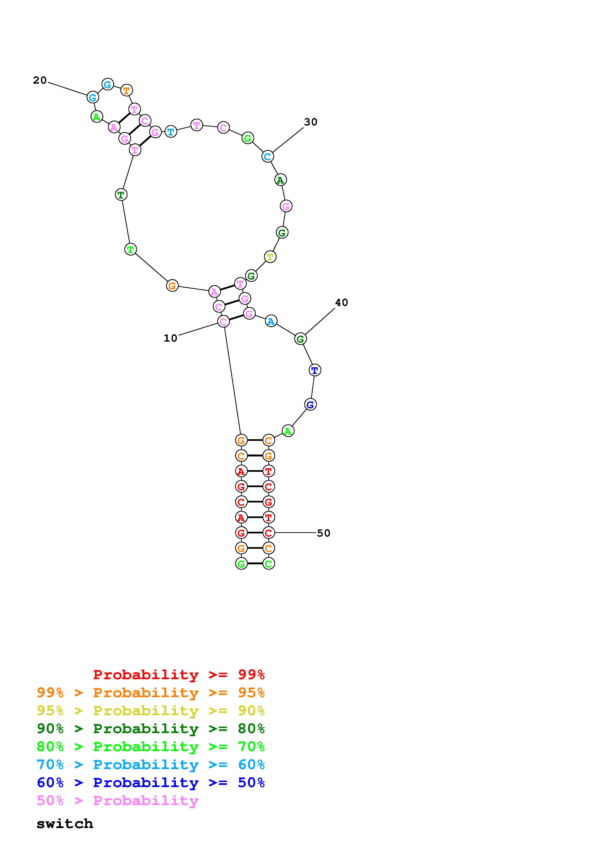 Fold Predict1.fasta Fold.ct --DNA --loop 30 --maximum 20 --percent 10 --temperature 298.15 --window 3