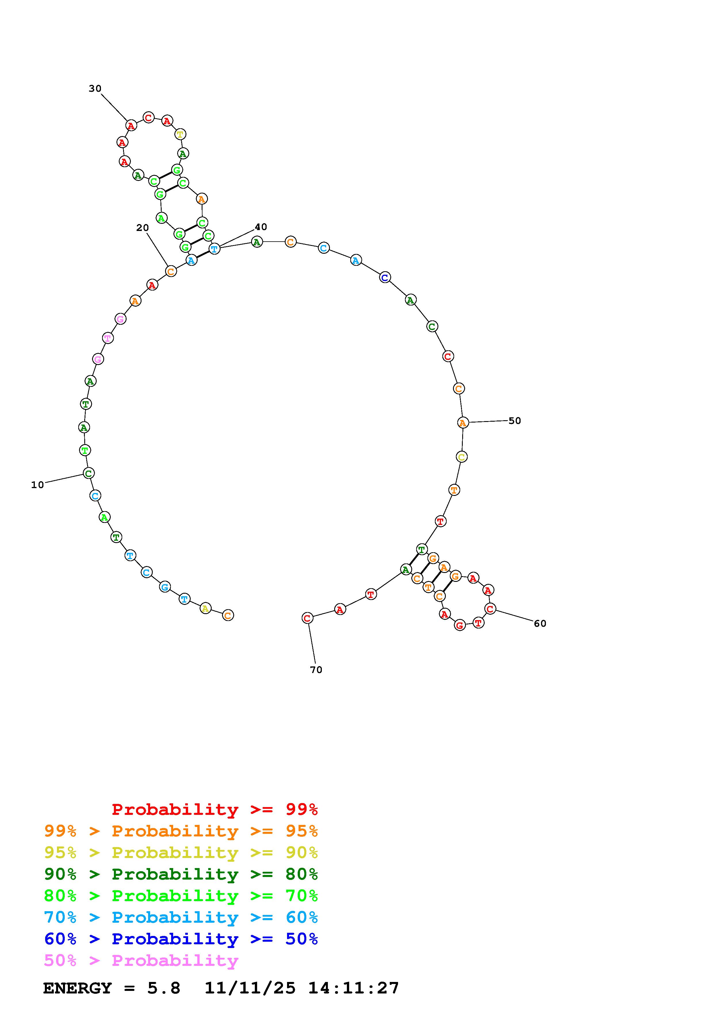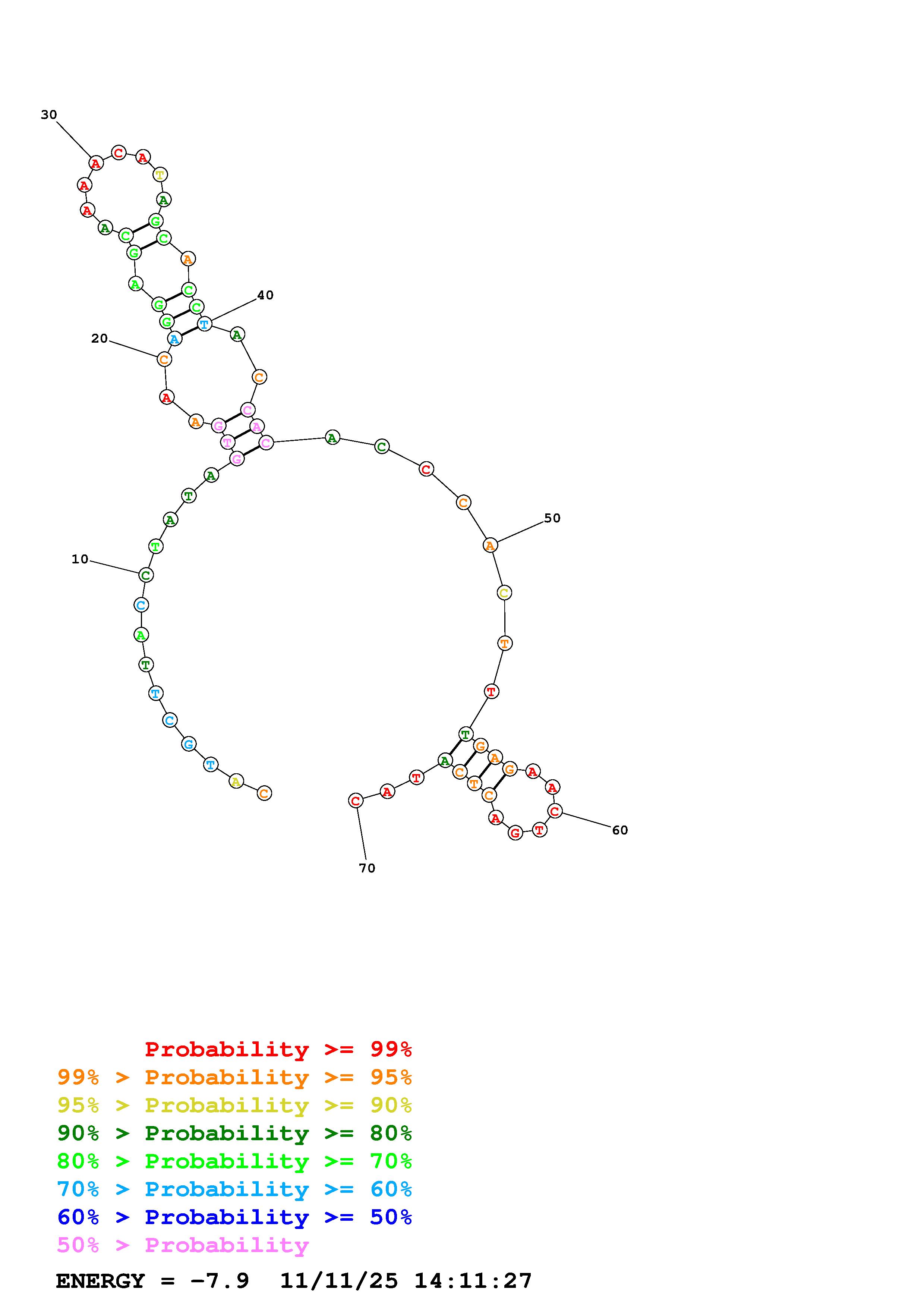 Fold Predict1.fasta Fold.ct --DNA --loop 30 --maximum 20 --percent 10 --temperature 298.15 --window 3