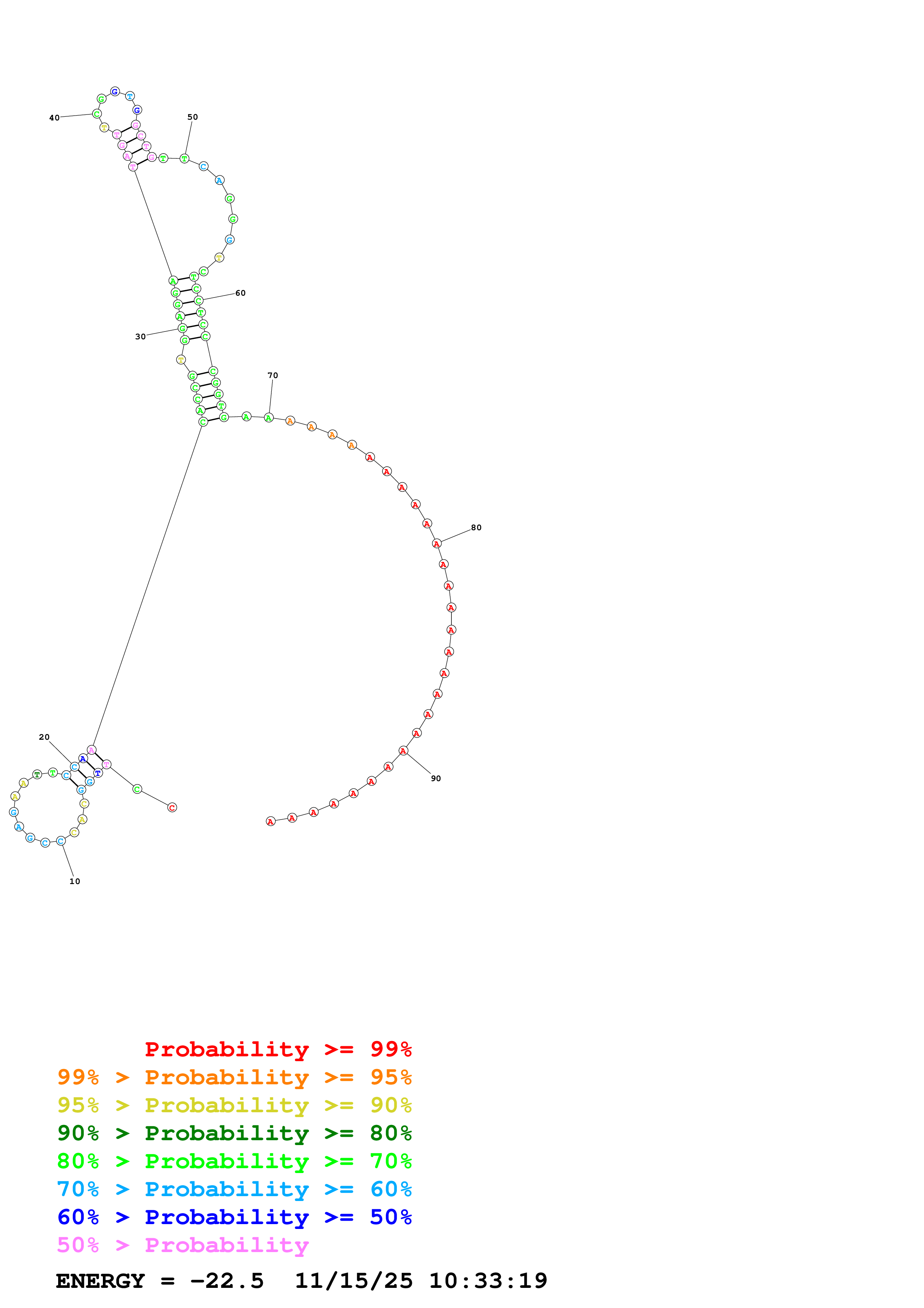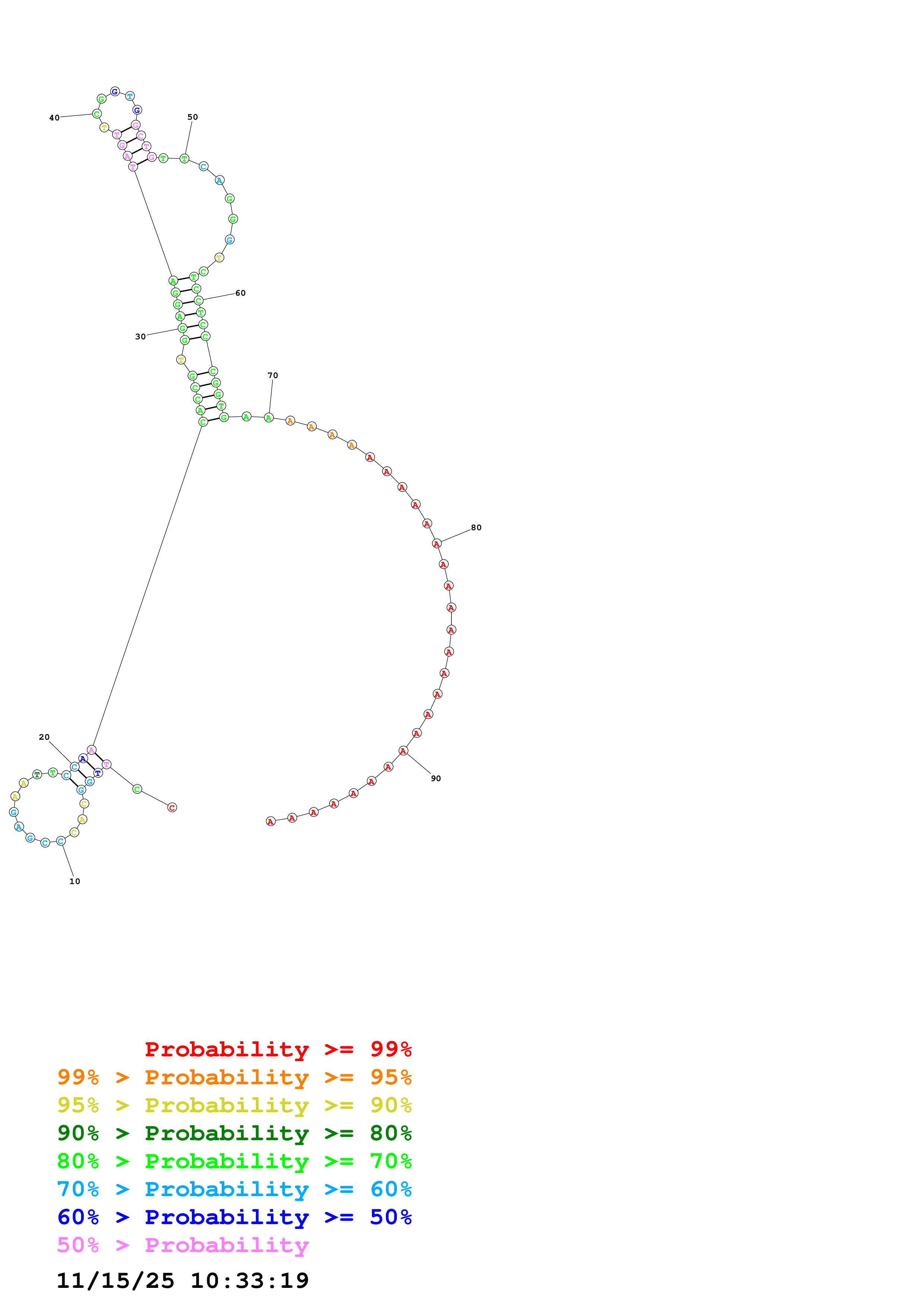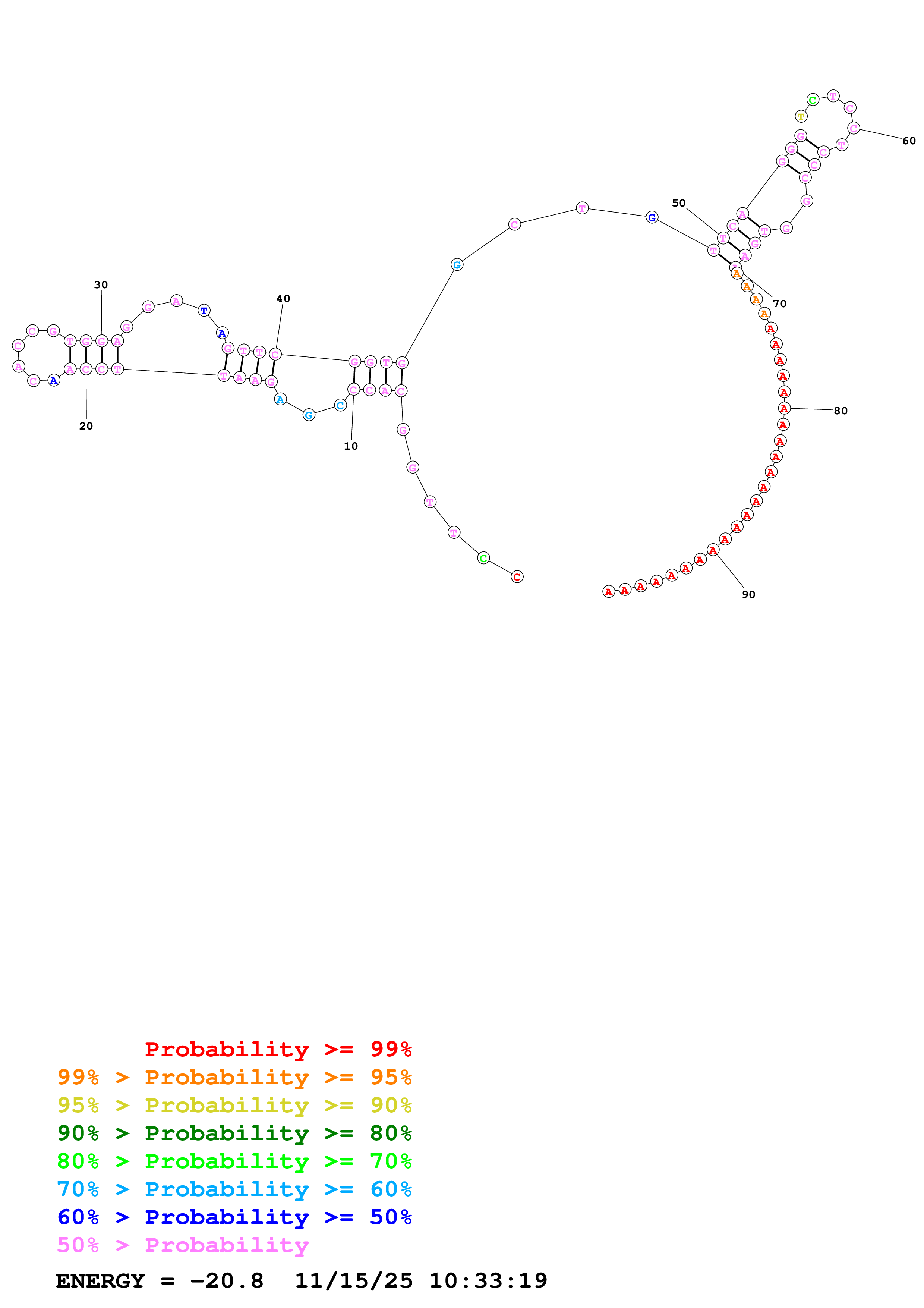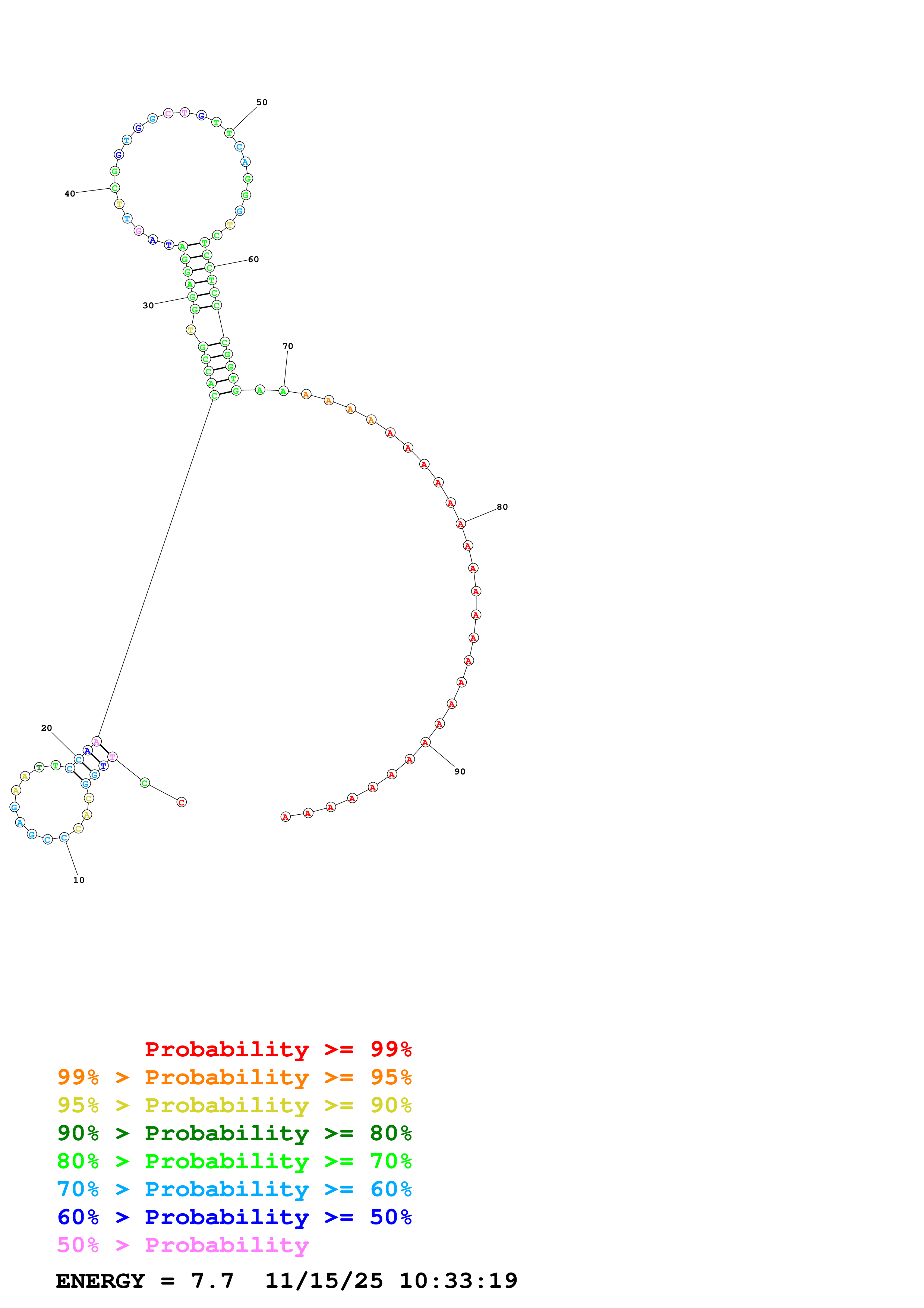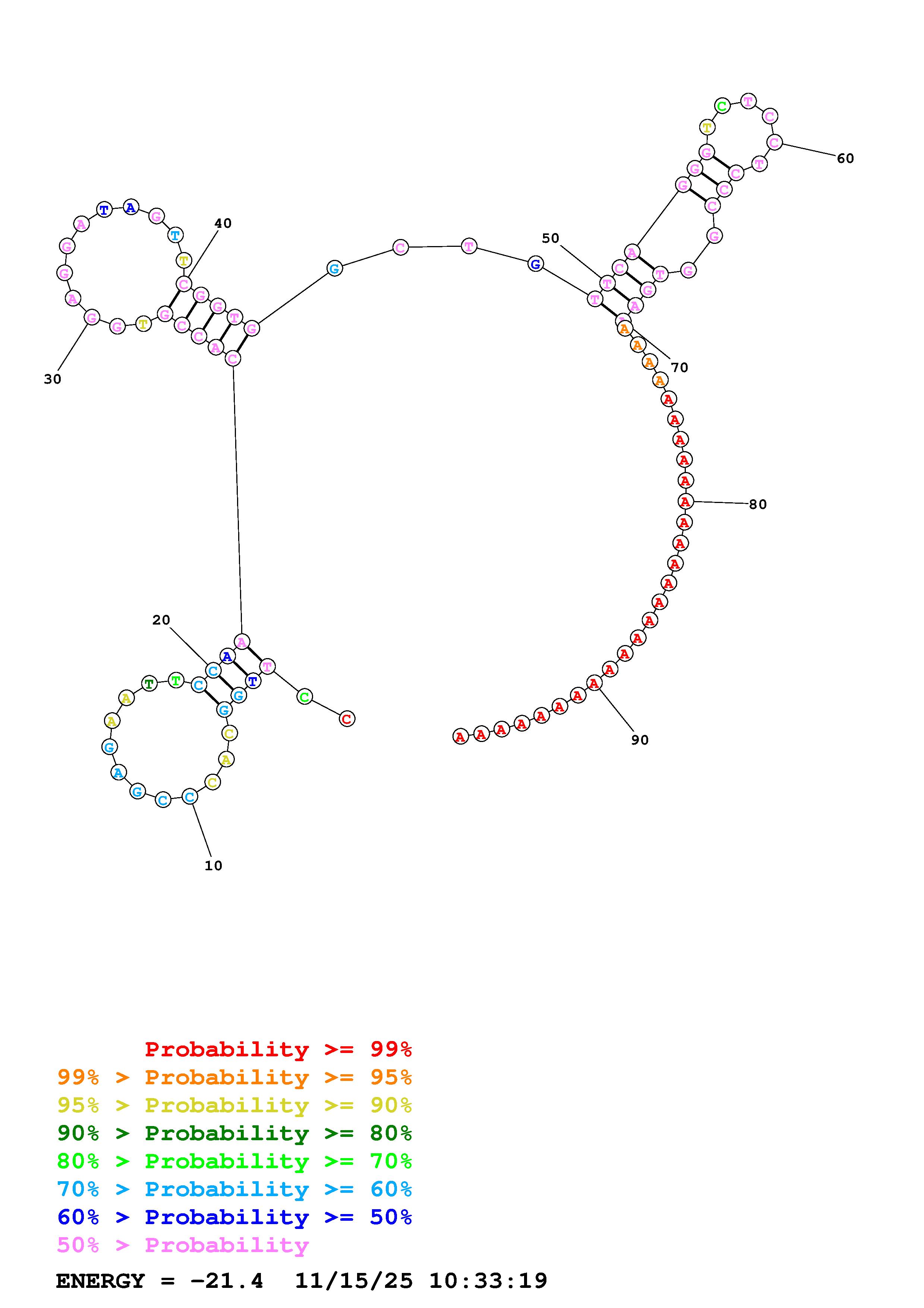 Fold Predict1.fasta Fold.ct --DNA --loop 30 --maximum 20 --percent 10 --temperature 277.15 --window 3