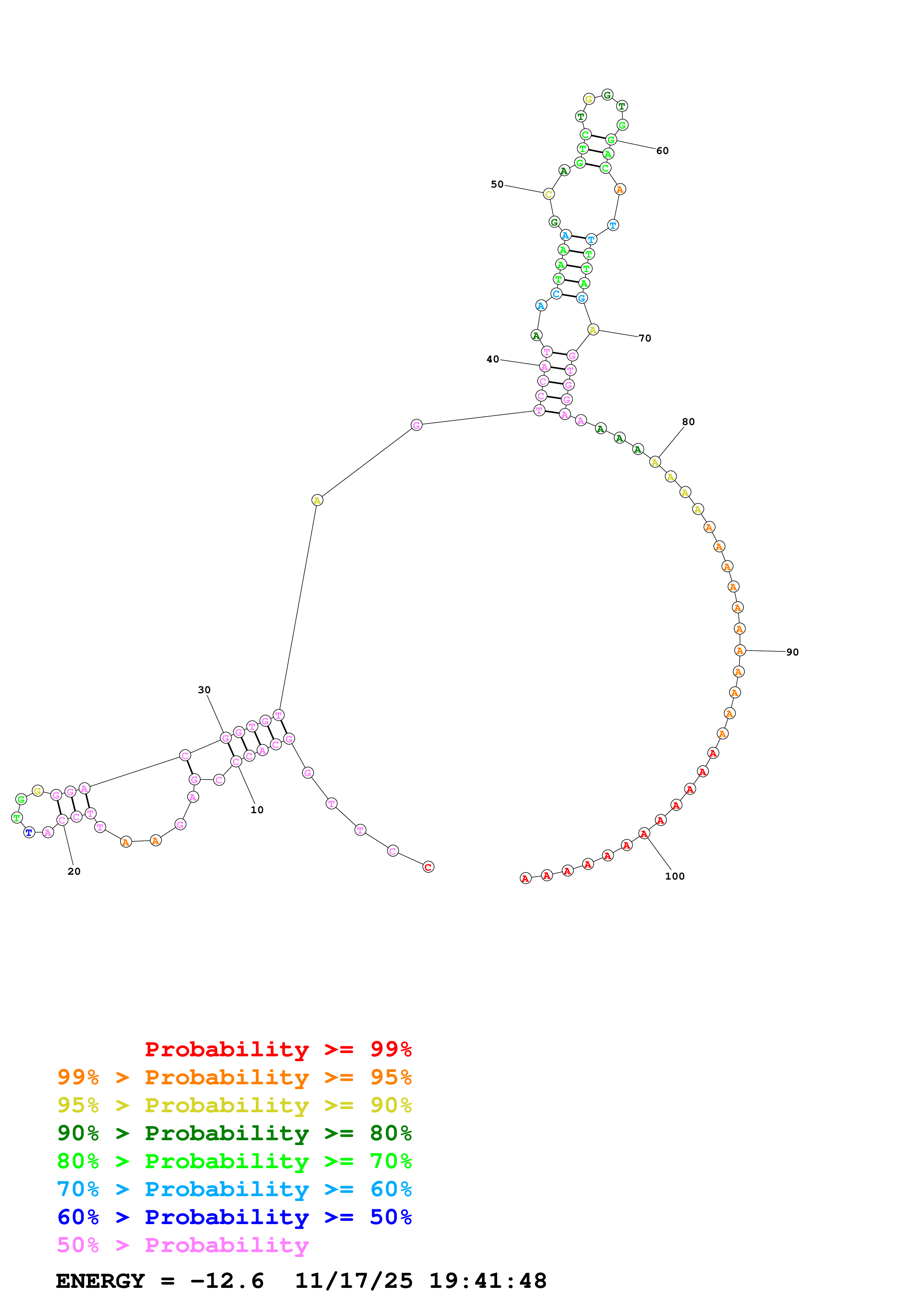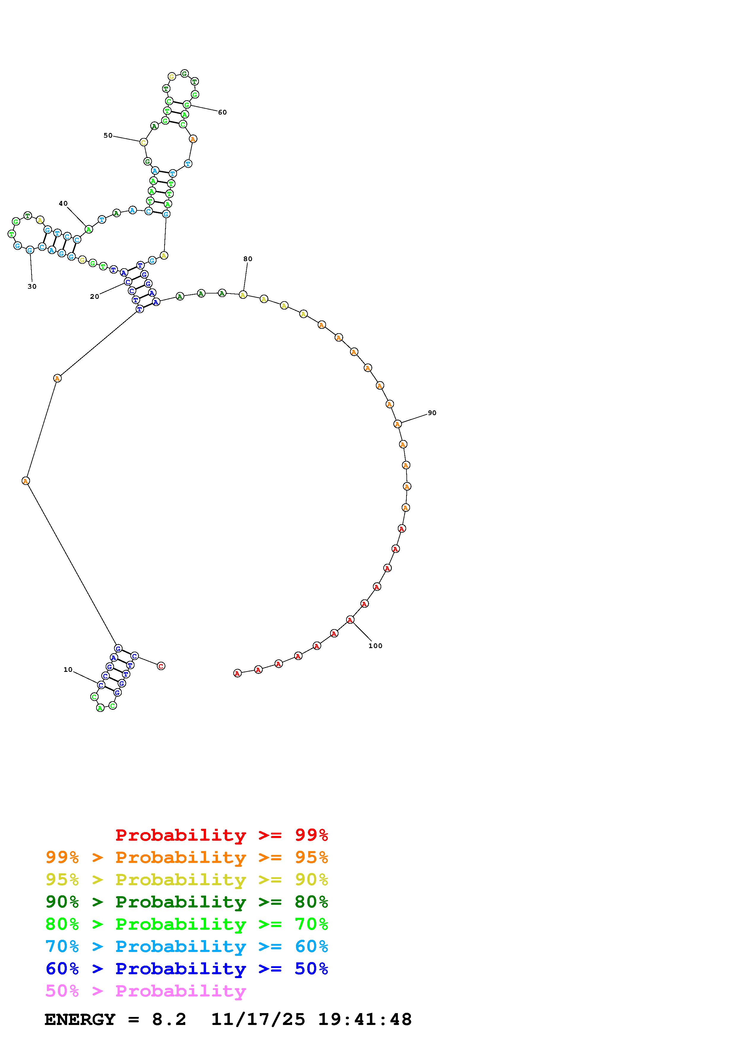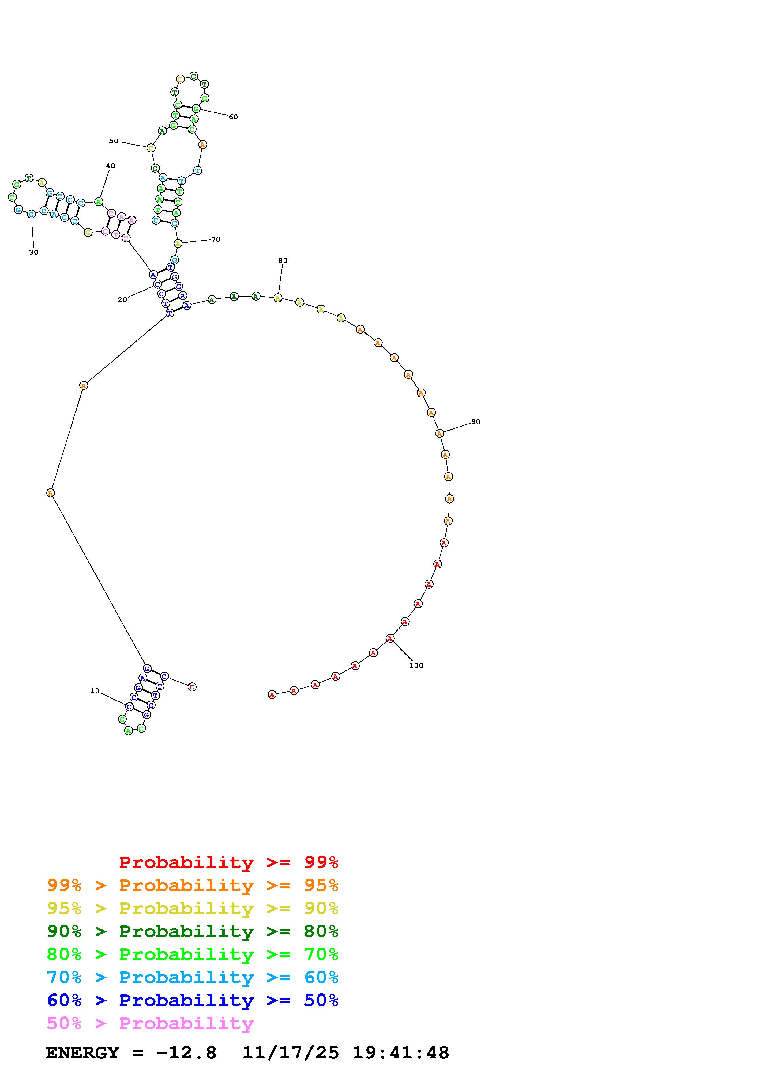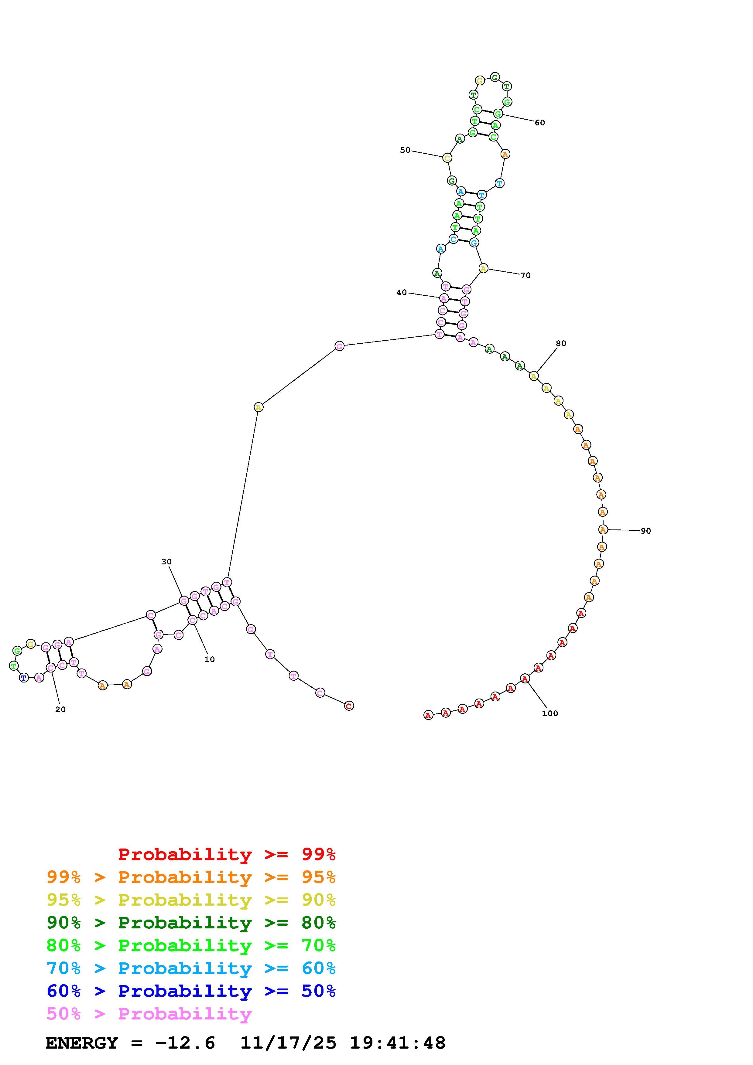 Fold Predict1.fasta Fold.ct --DNA --loop 30 --maximum 20 --percent 10 --temperature 298.15 --window 3