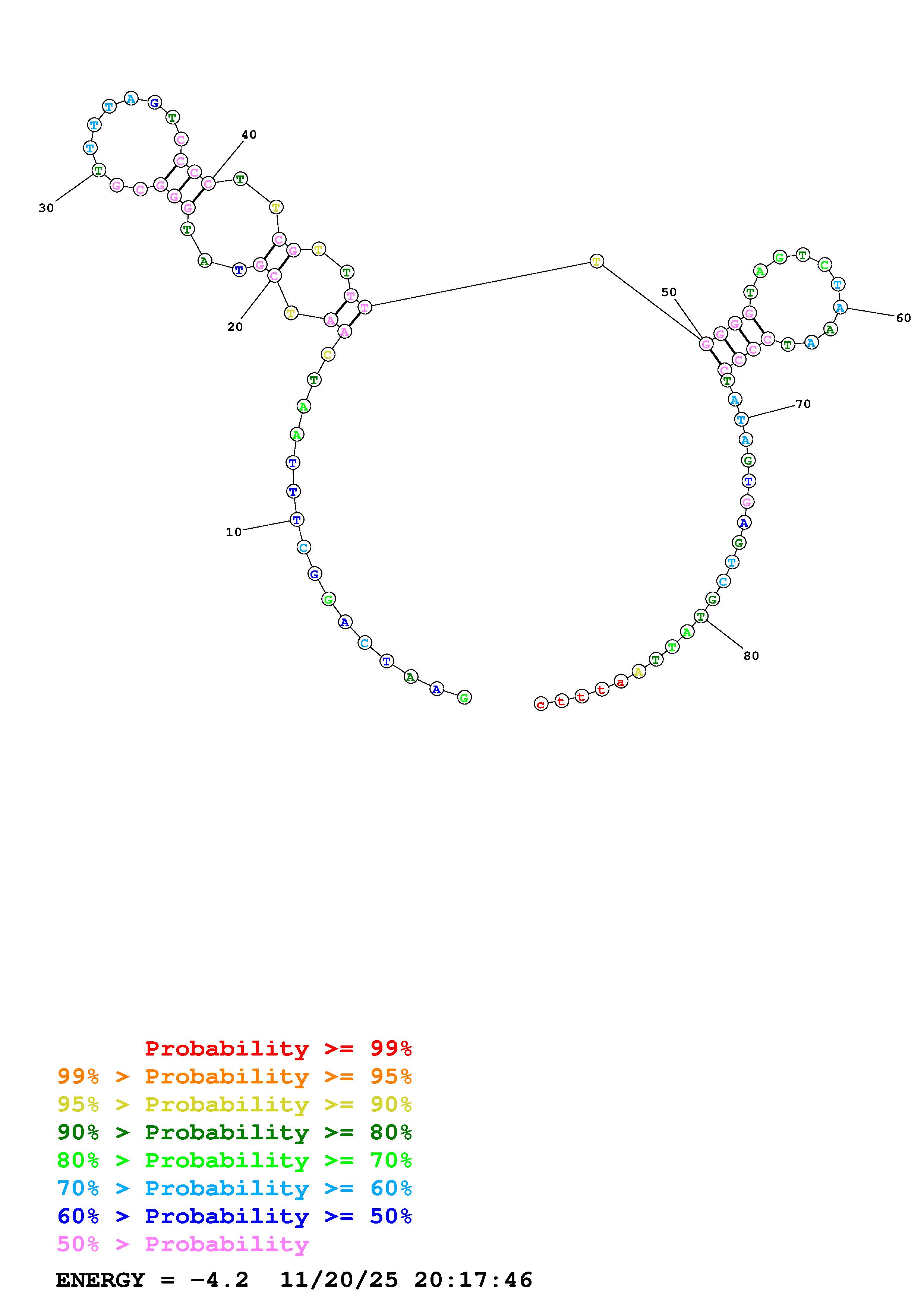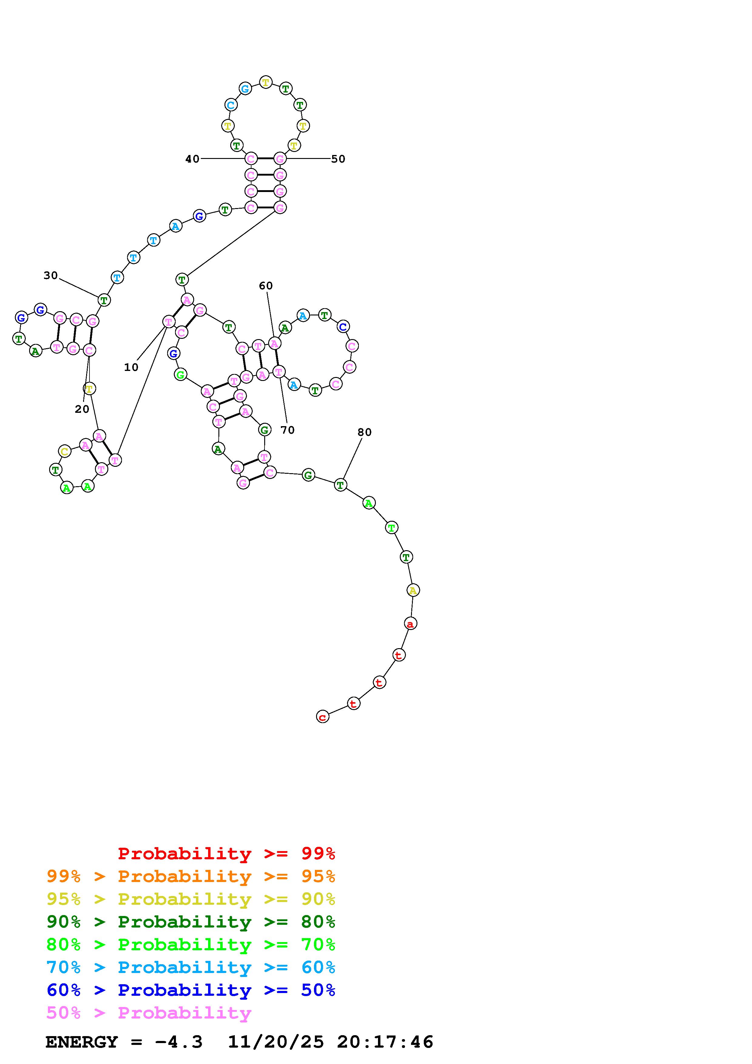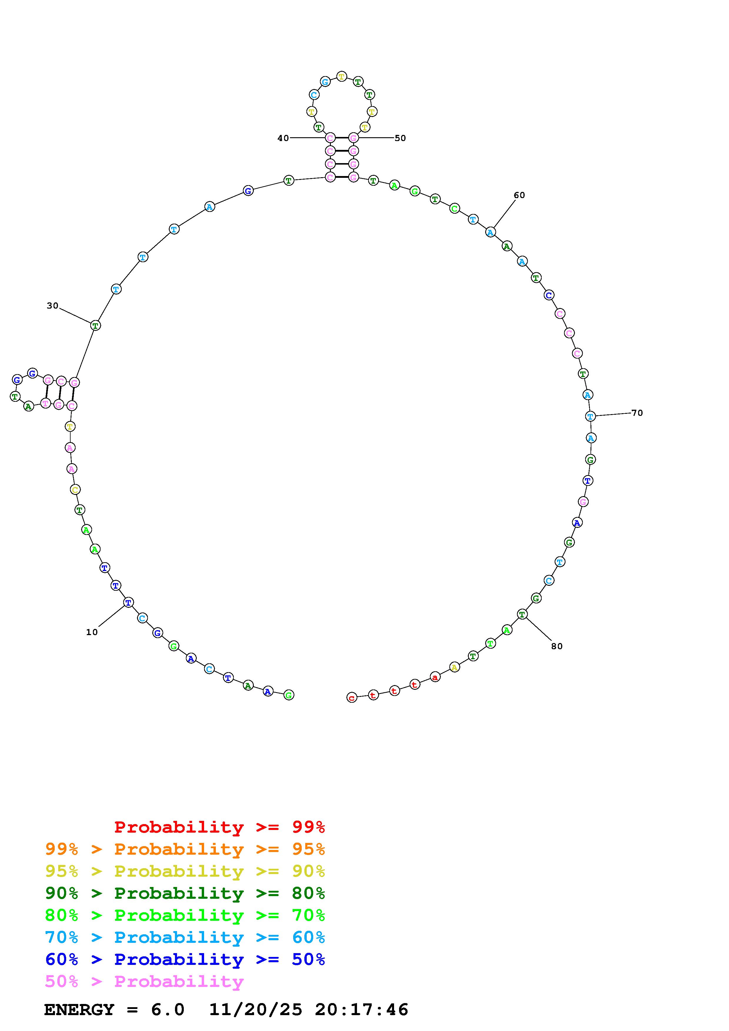 Fold Predict1.fasta Fold.ct --DNA --loop 30 --maximum 20 --percent 10 --temperature 310.15 --window 3