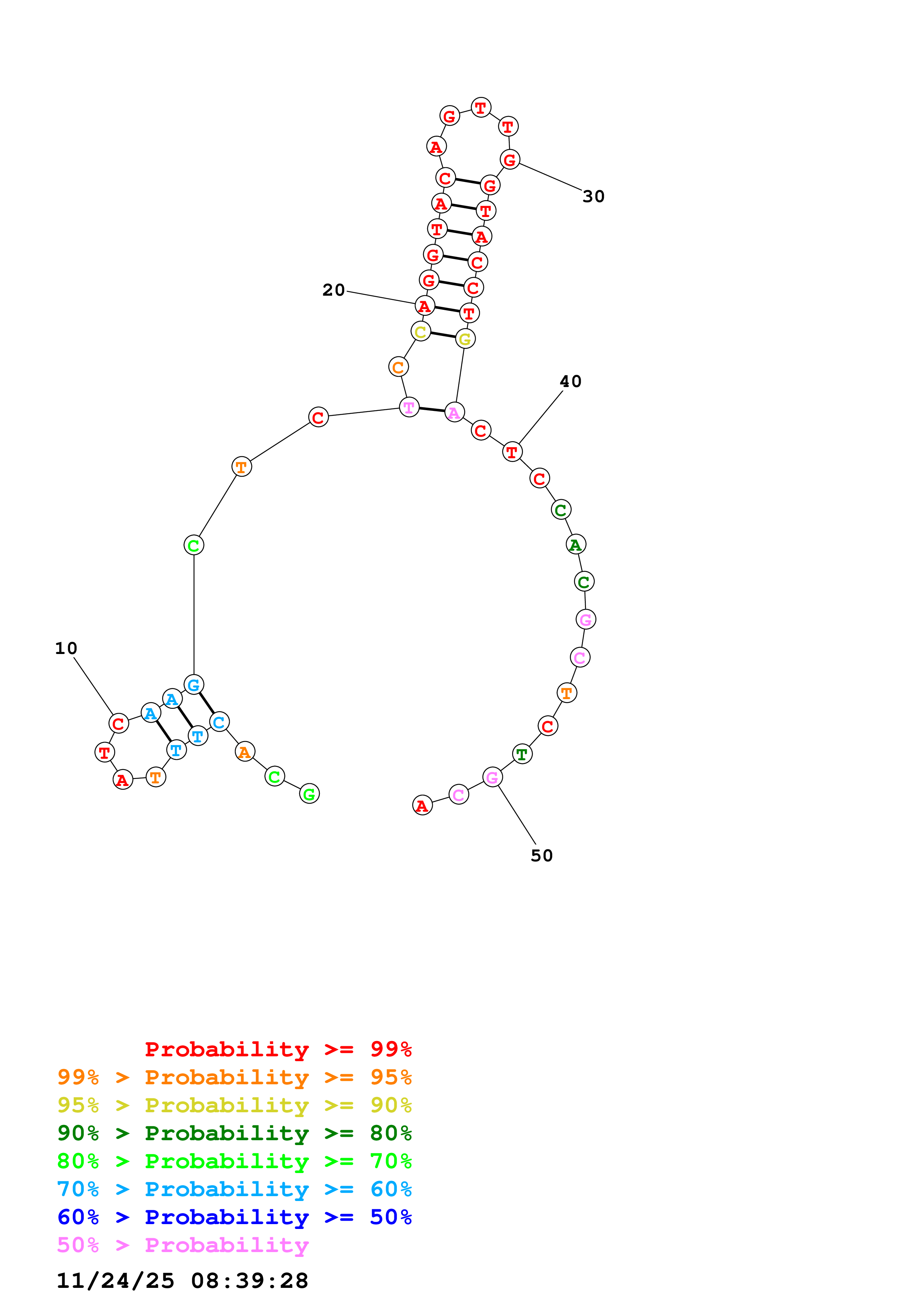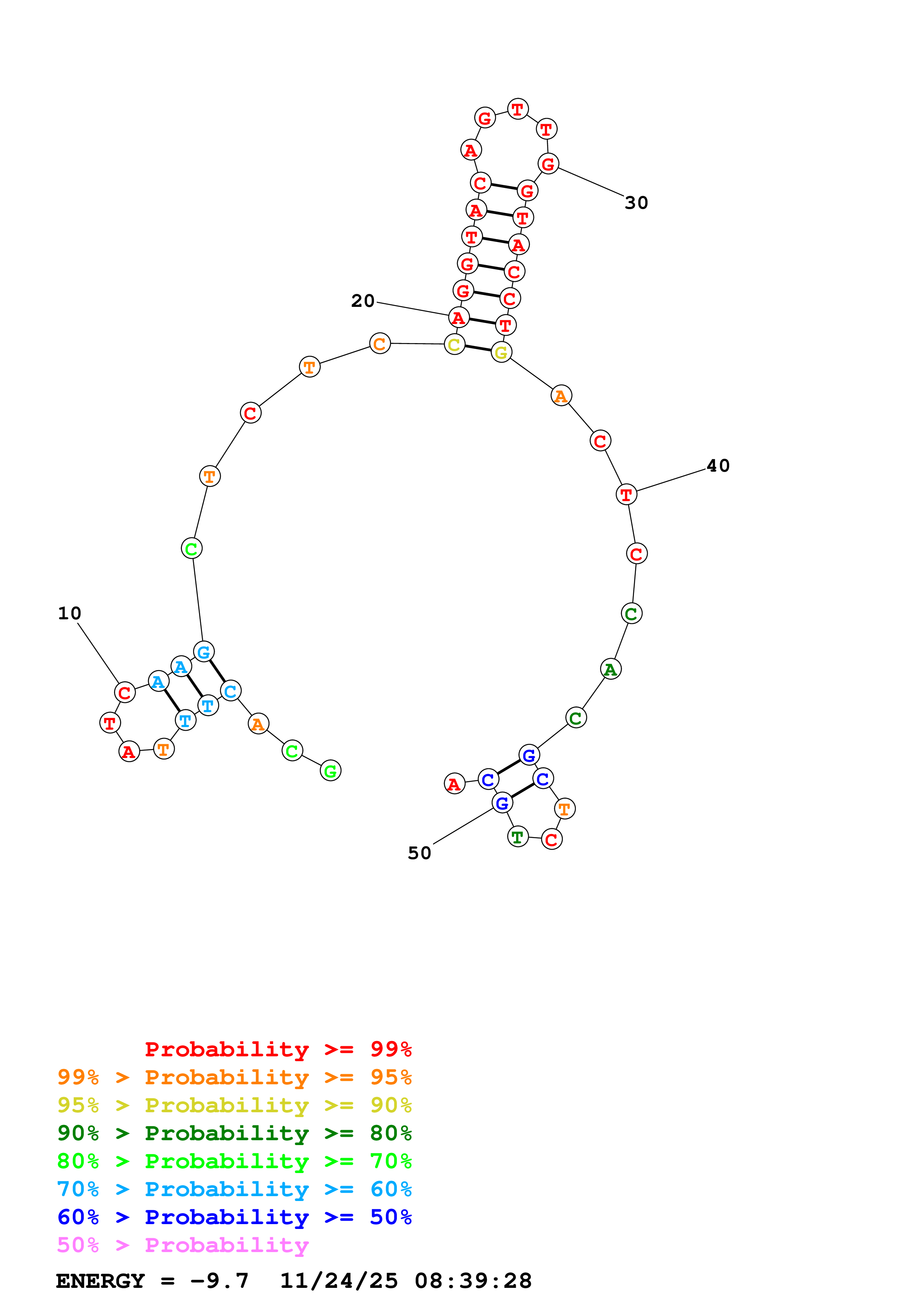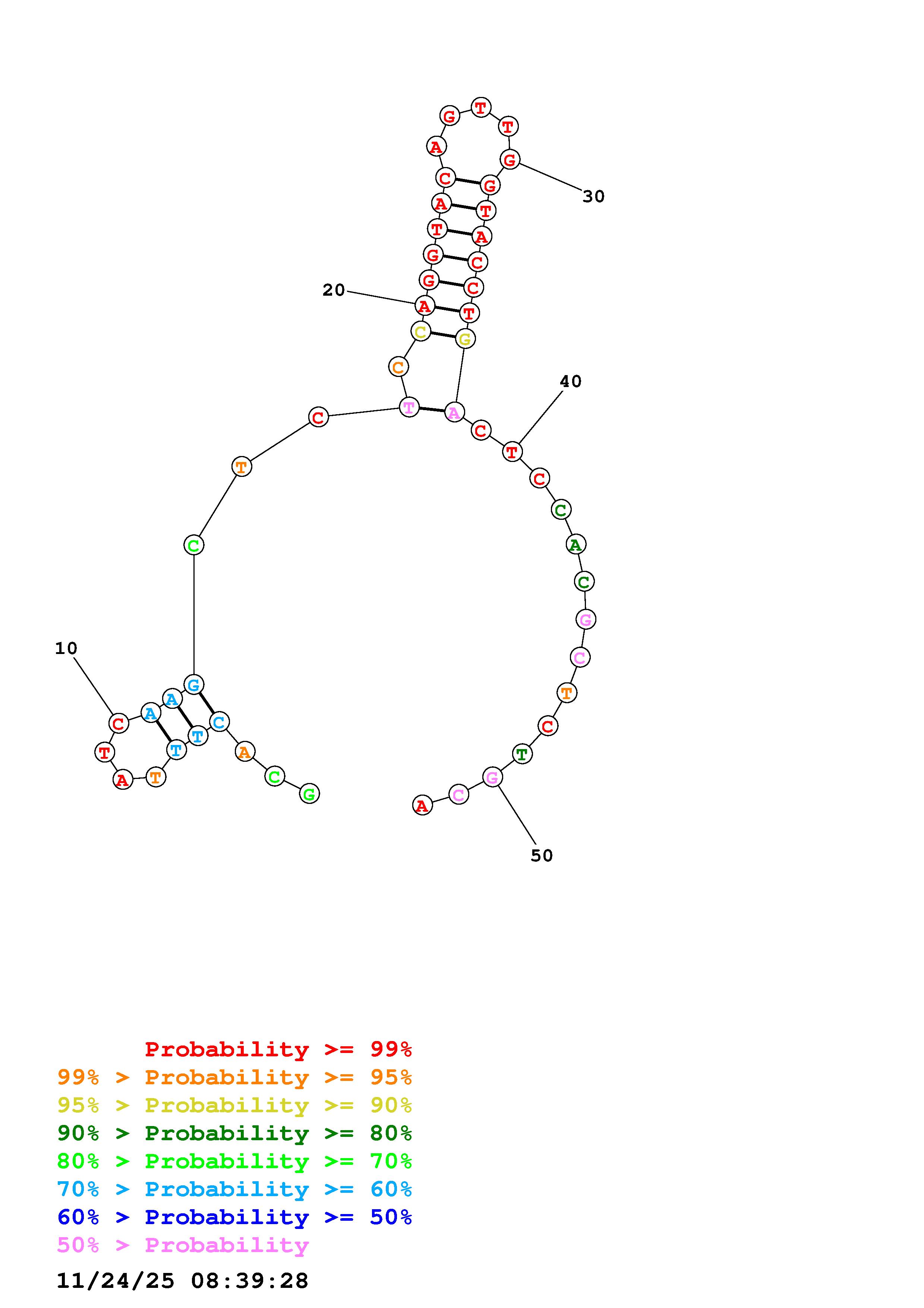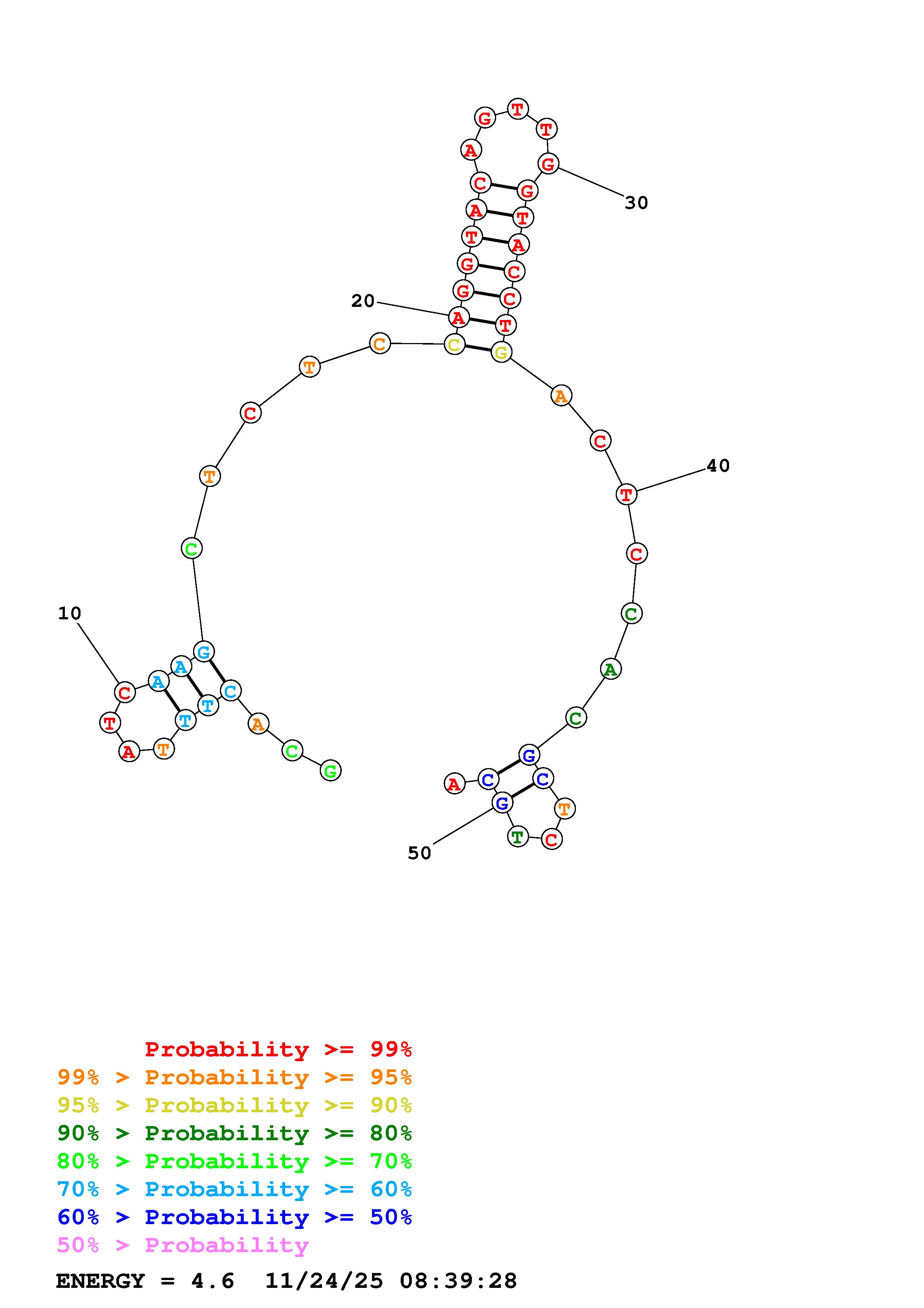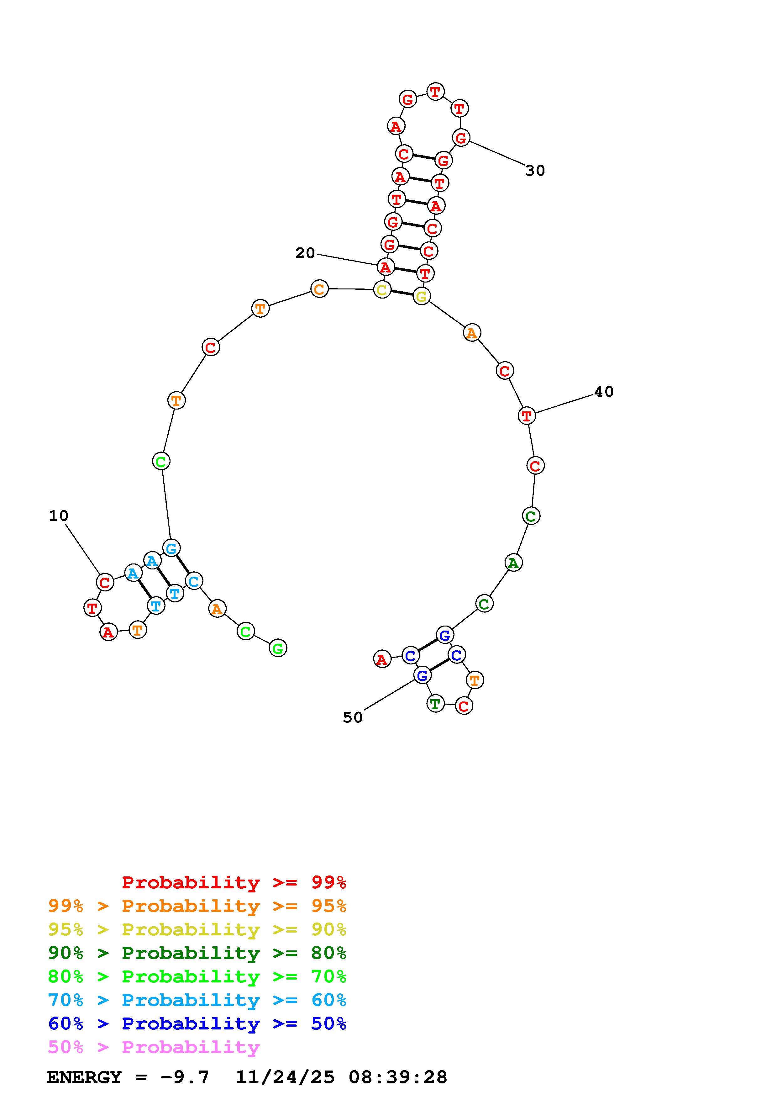 Fold Predict1.fasta Fold.ct --DNA --loop 30 --maximum 20 --percent 10 --temperature 298.15 --window 3