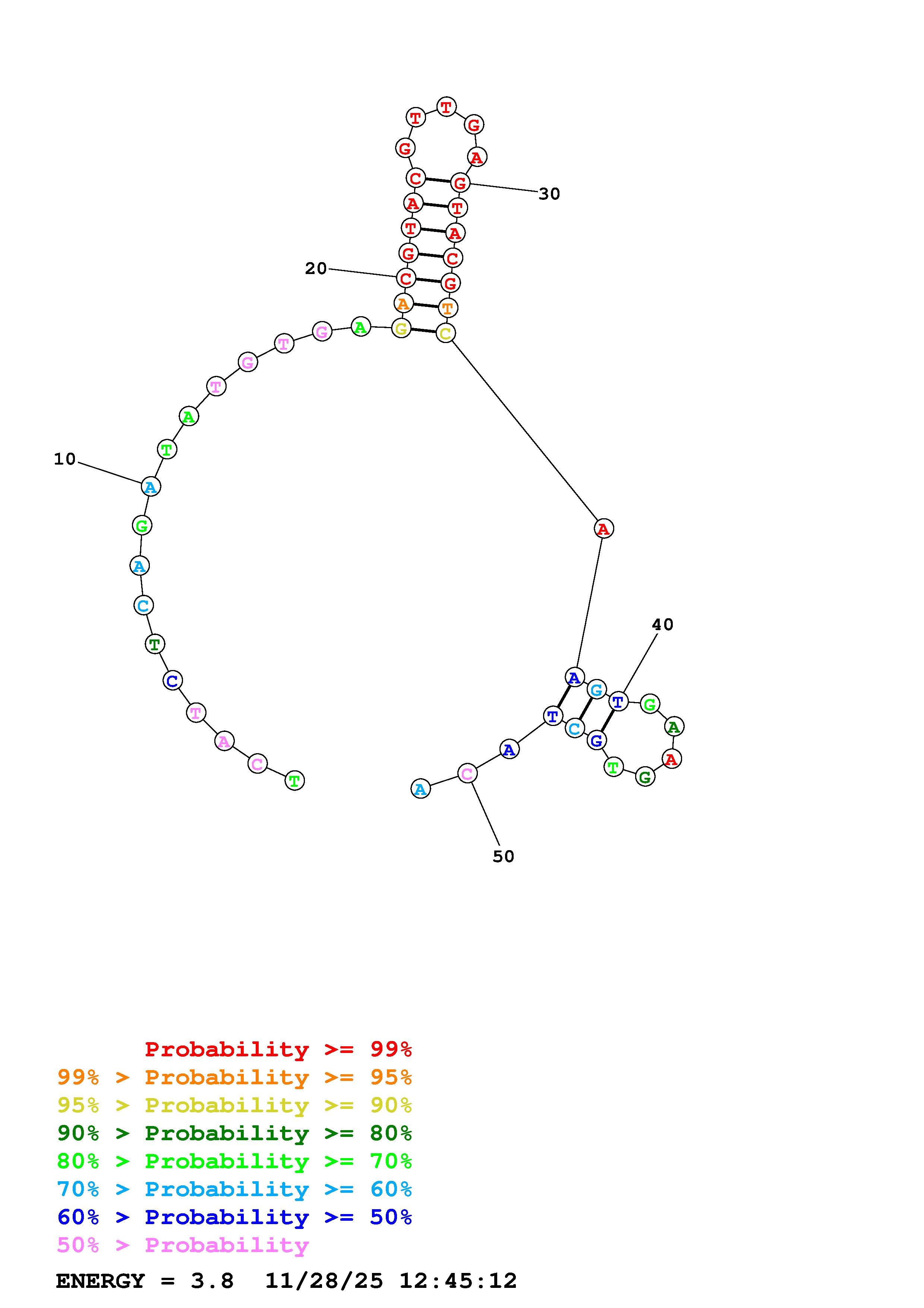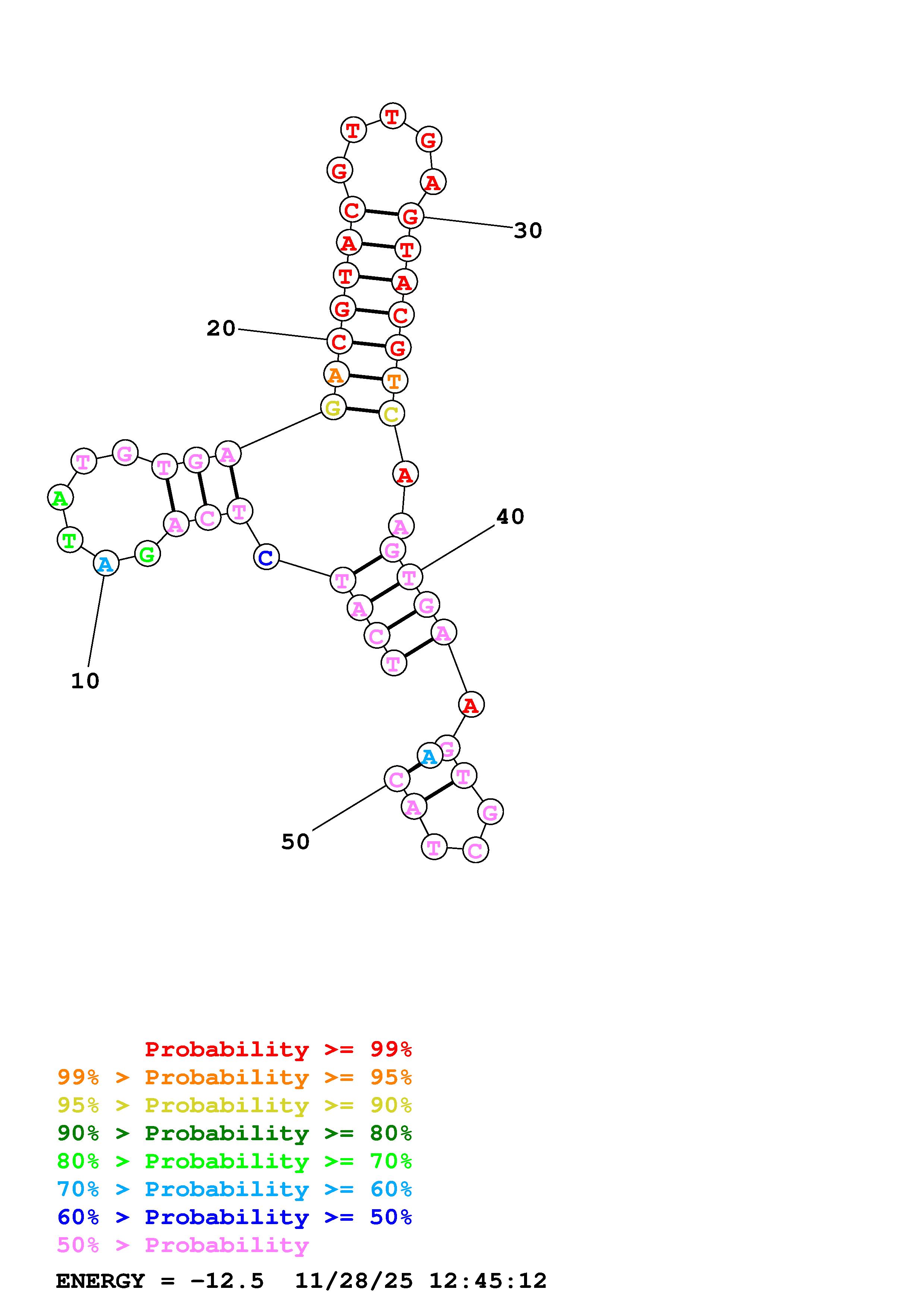 Fold Predict1.fasta Fold.ct --DNA --loop 30 --maximum 20 --percent 10 --temperature 298.15 --window 3