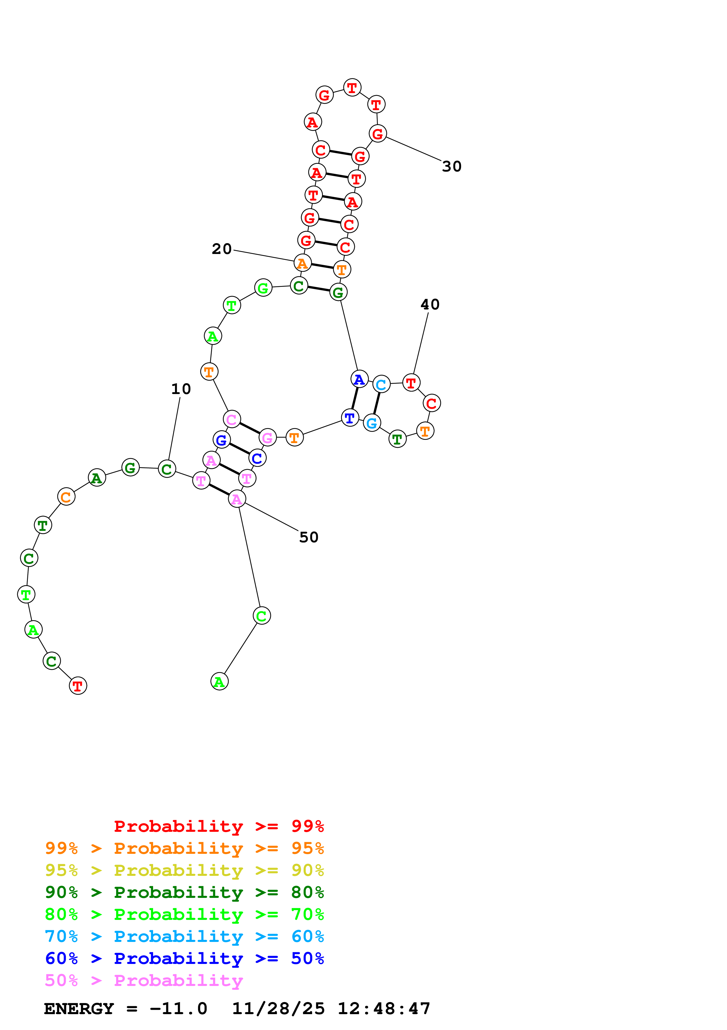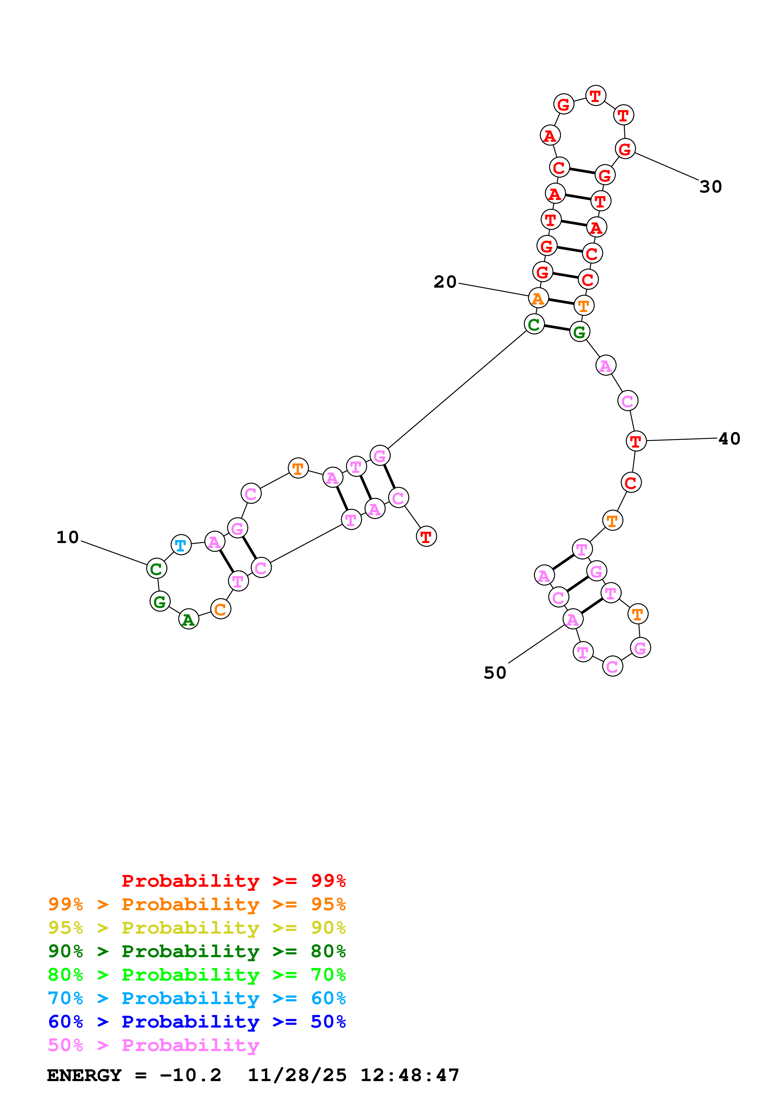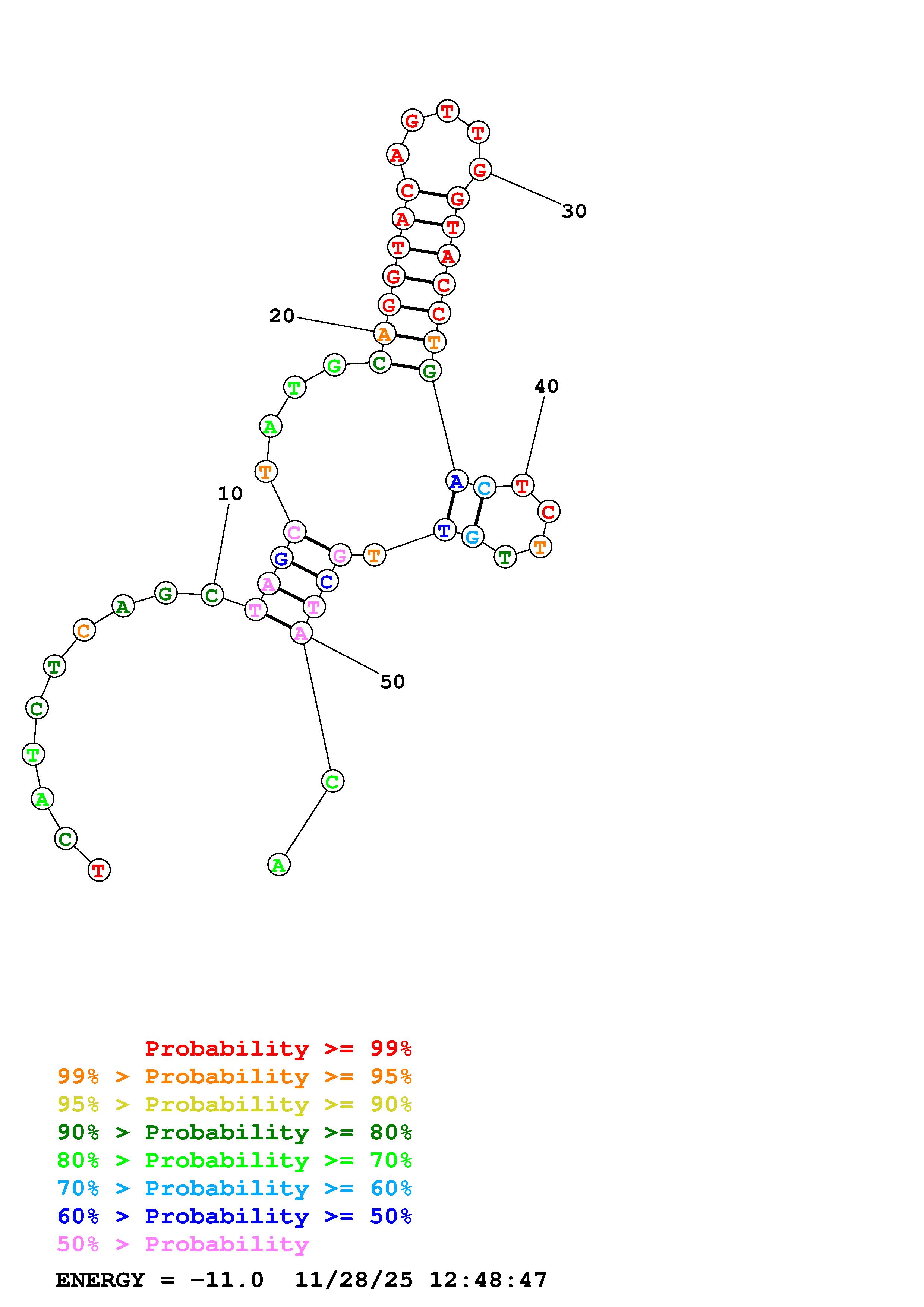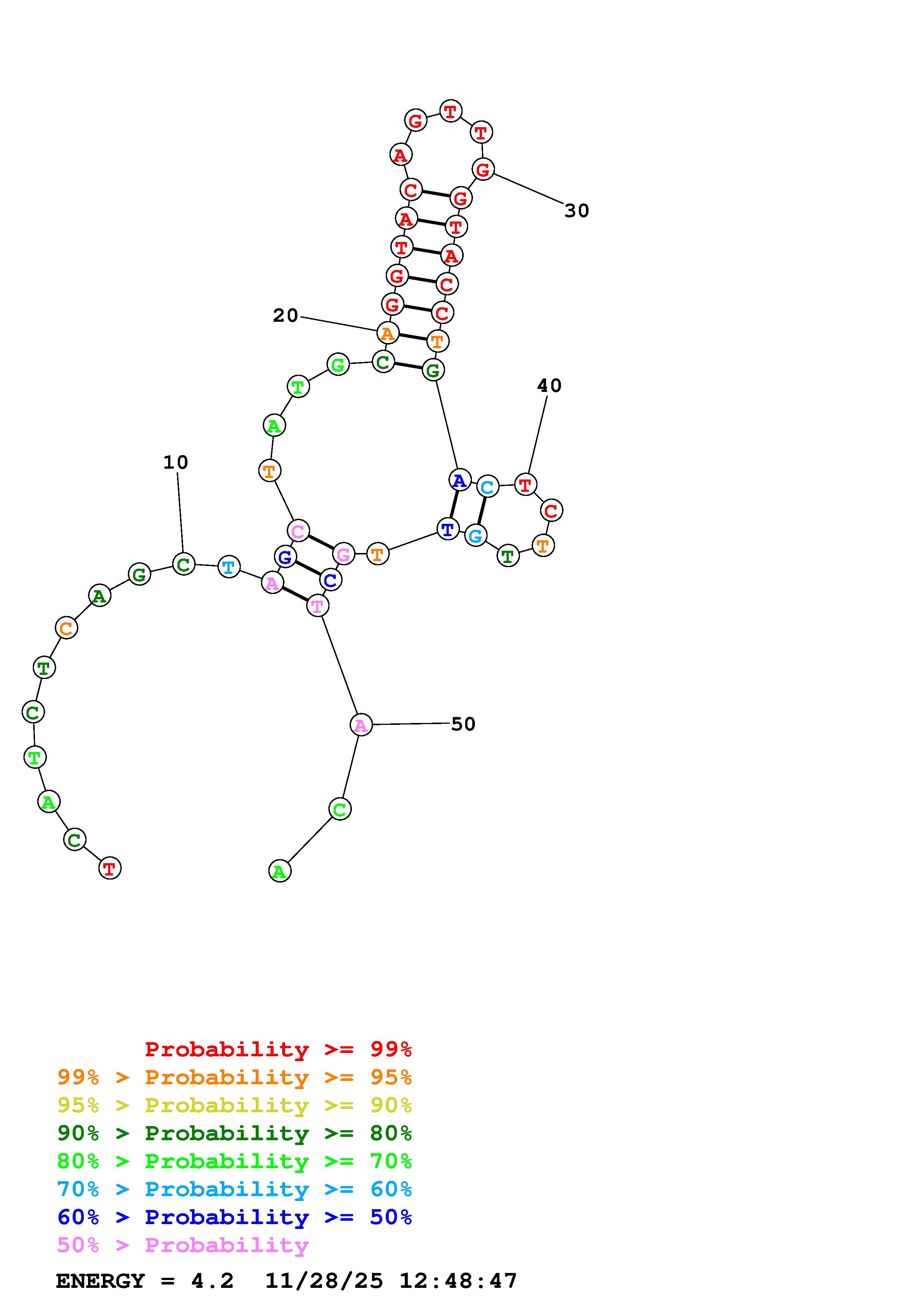 Fold Predict1.fasta Fold.ct --DNA --loop 30 --maximum 20 --percent 10 --temperature 298.15 --window 3