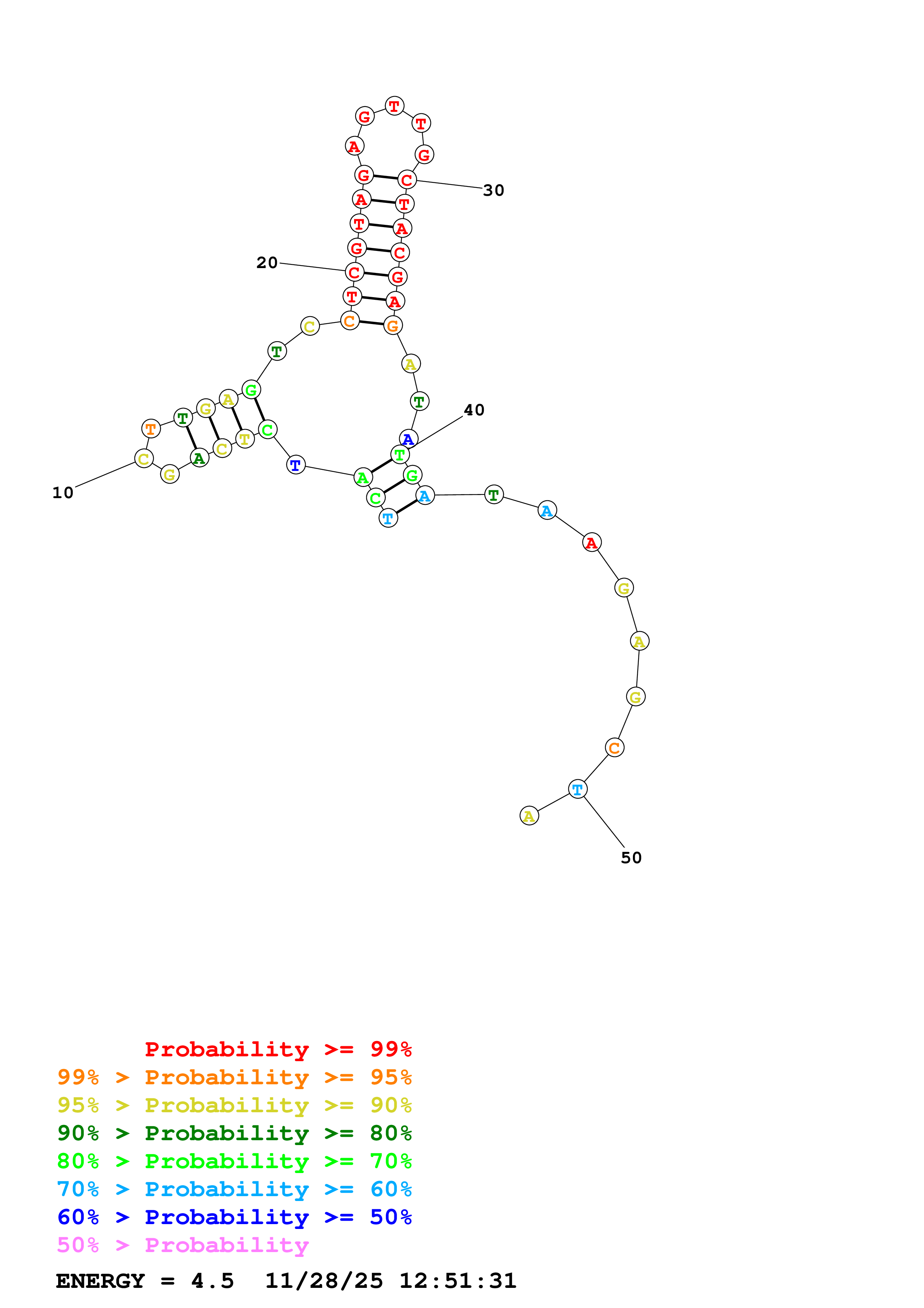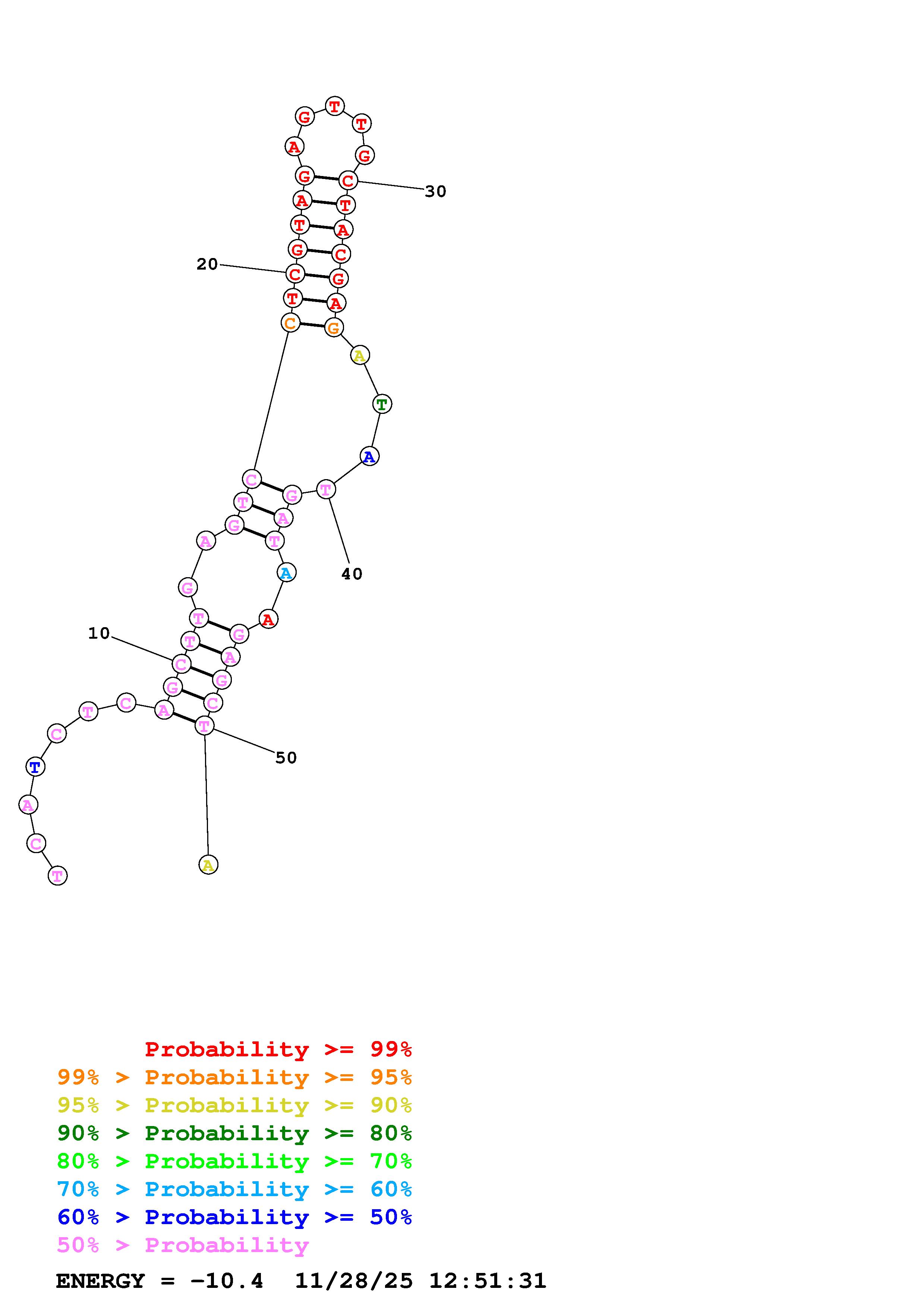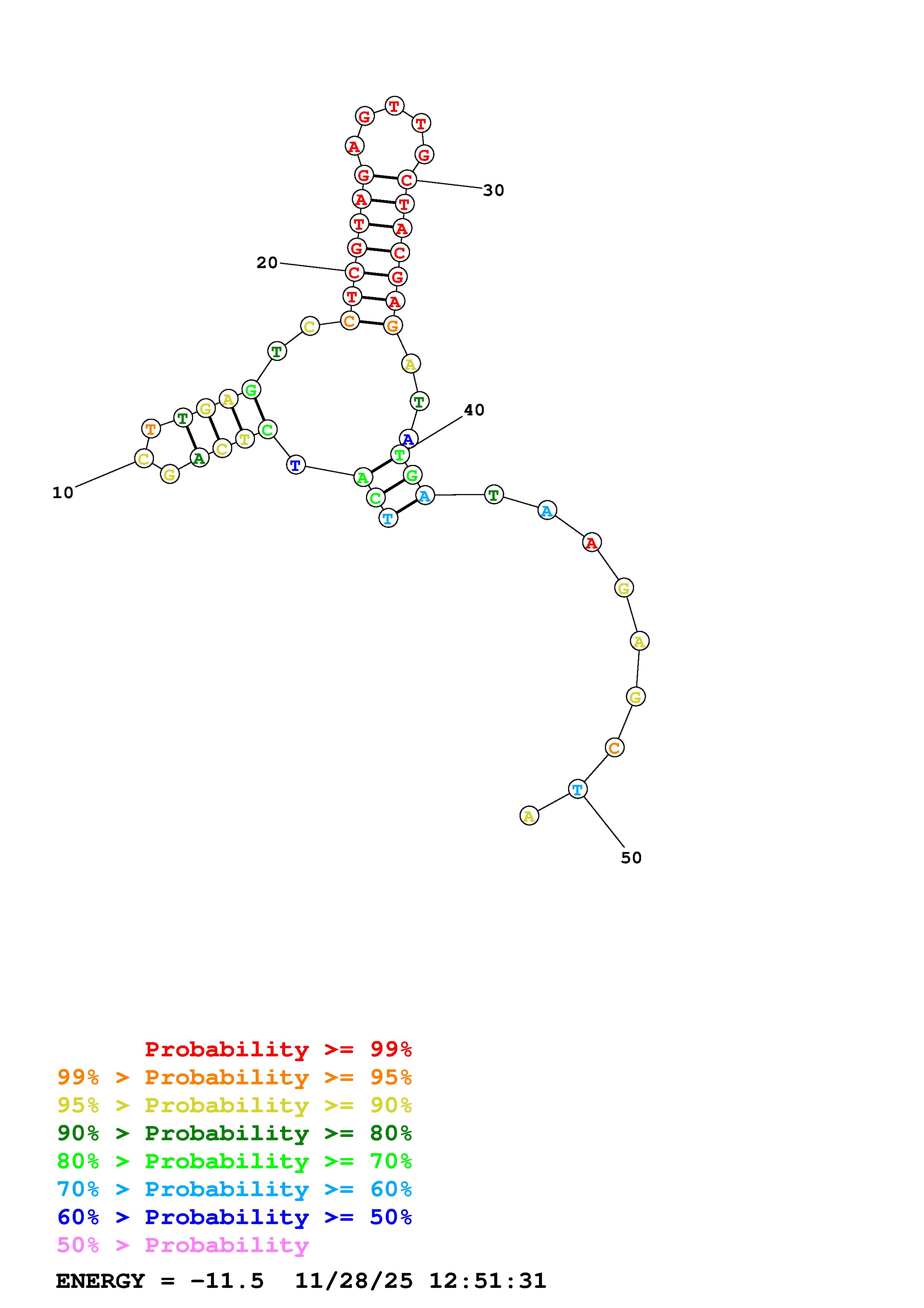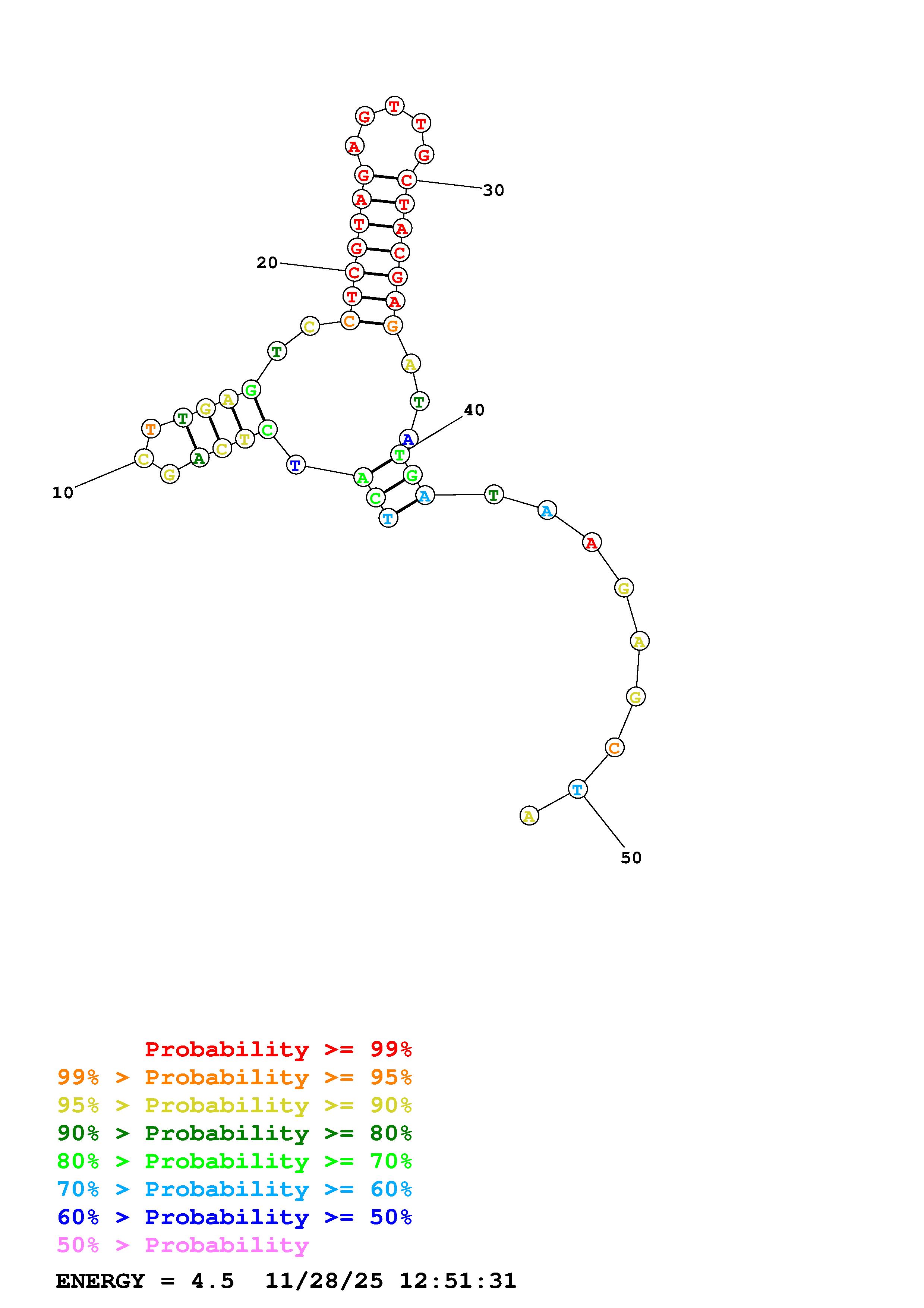 Fold Predict1.fasta Fold.ct --DNA --loop 30 --maximum 20 --percent 10 --temperature 298.15 --window 3
