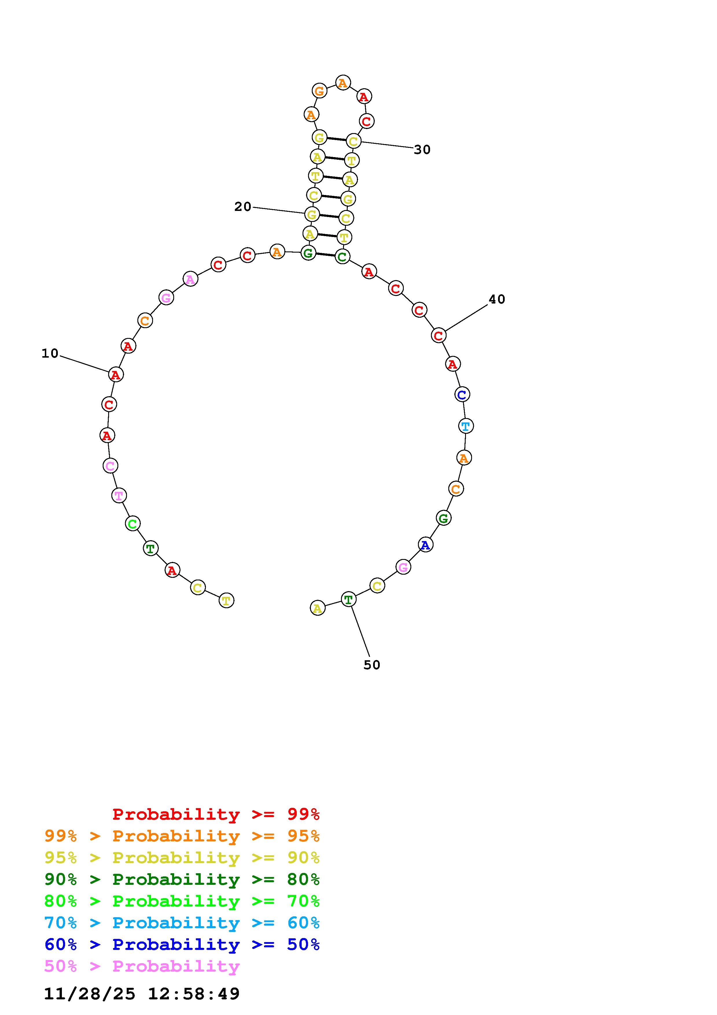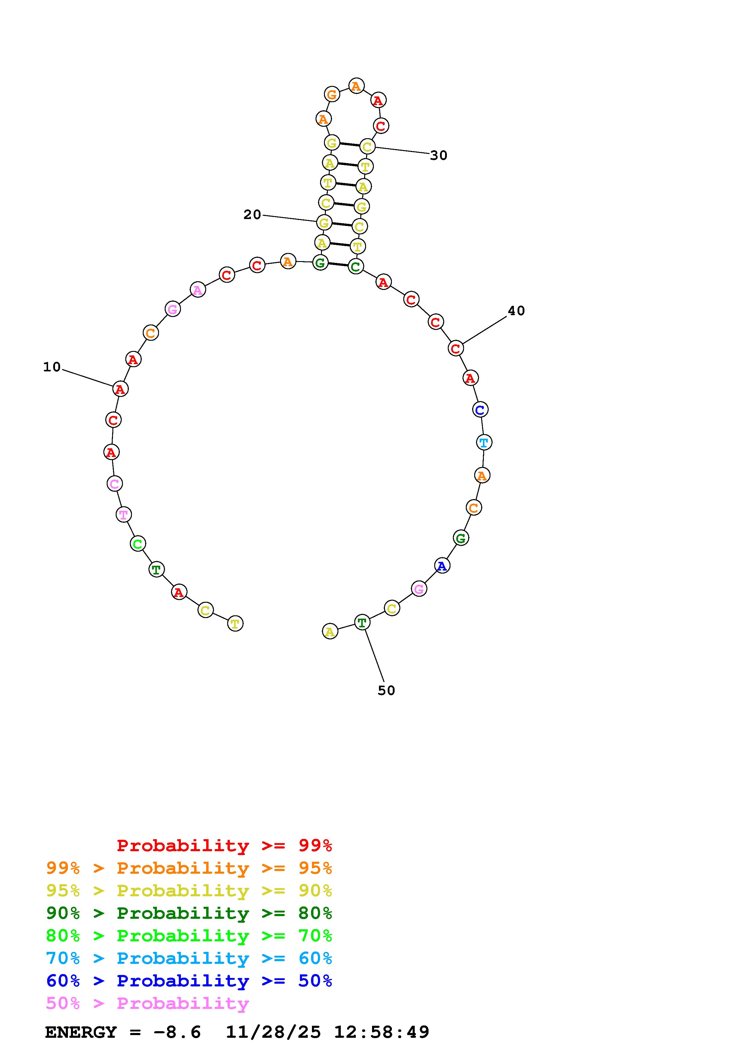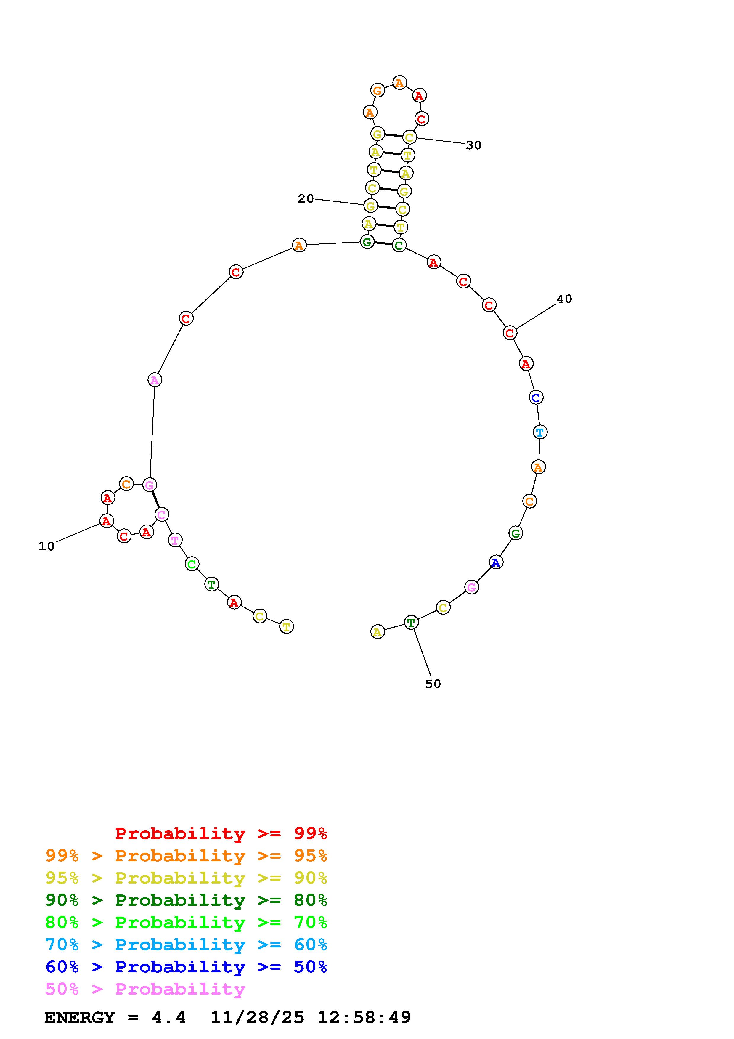 Fold Predict1.fasta Fold.ct --DNA --loop 30 --maximum 20 --percent 10 --temperature 298.15 --window 3