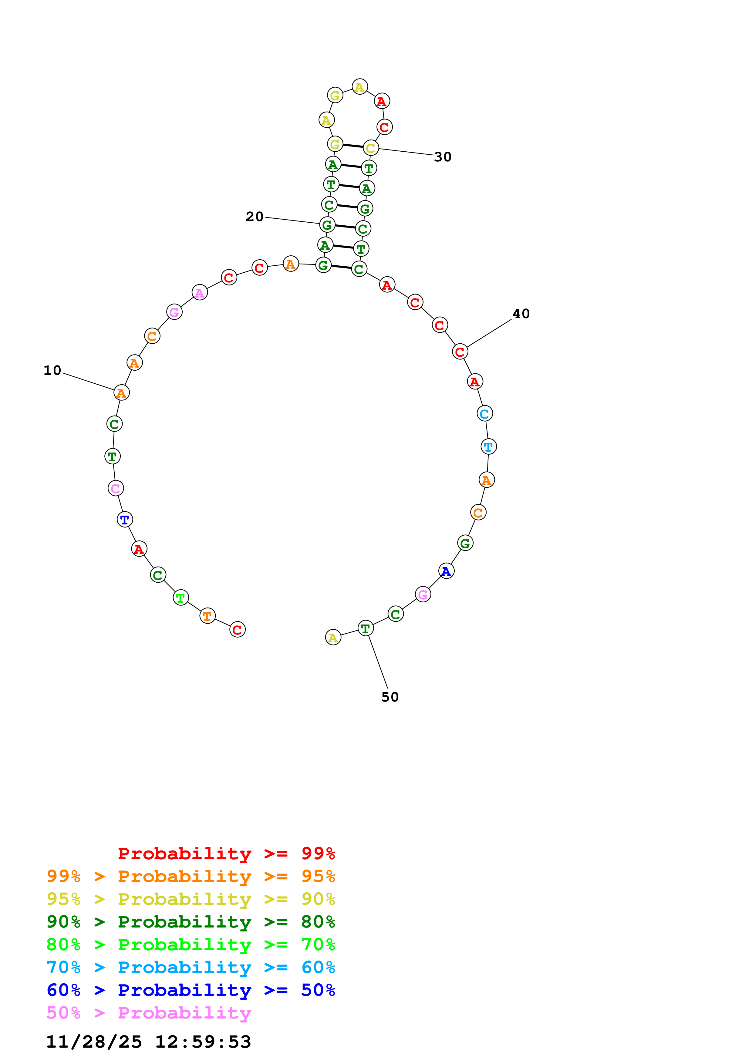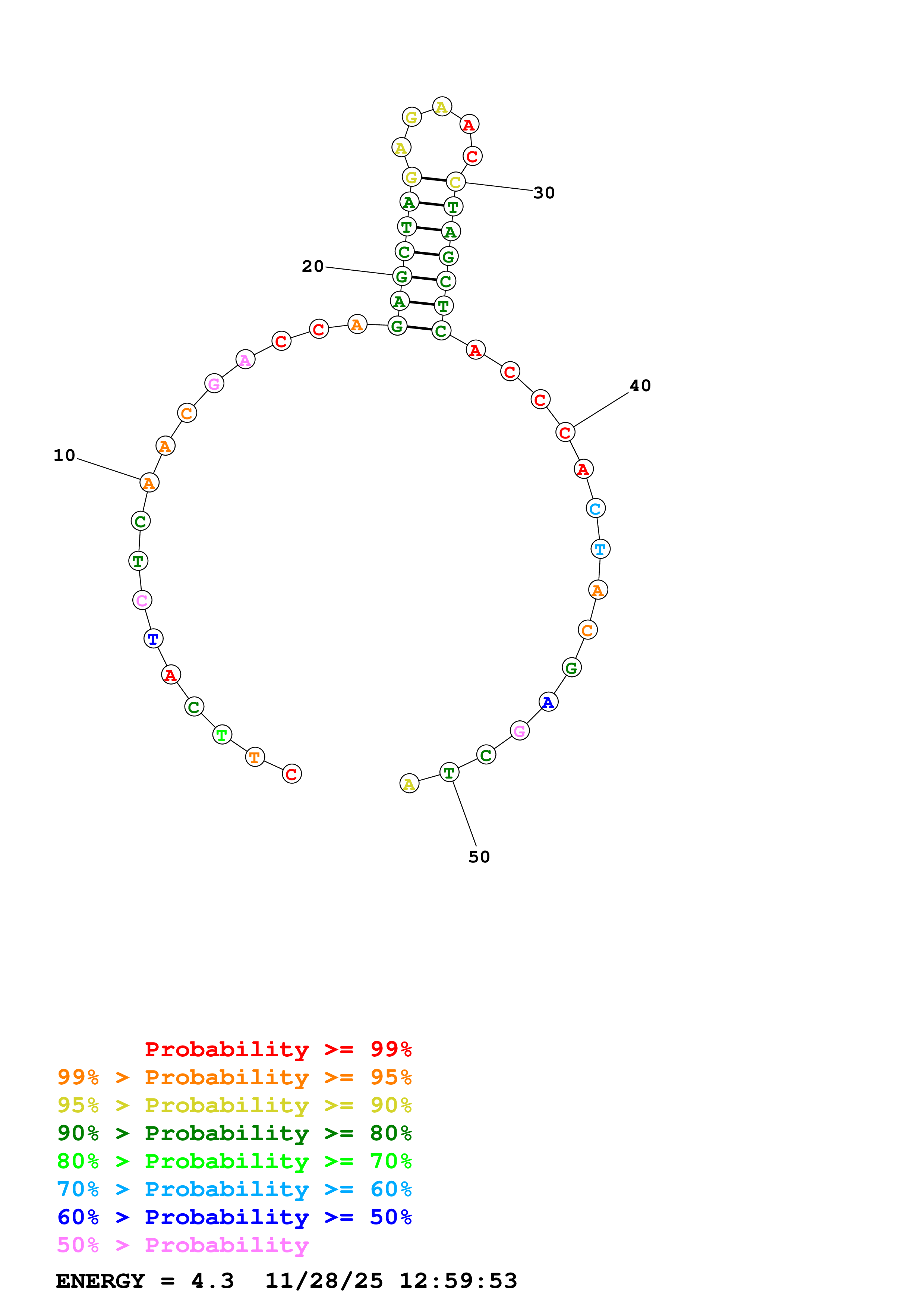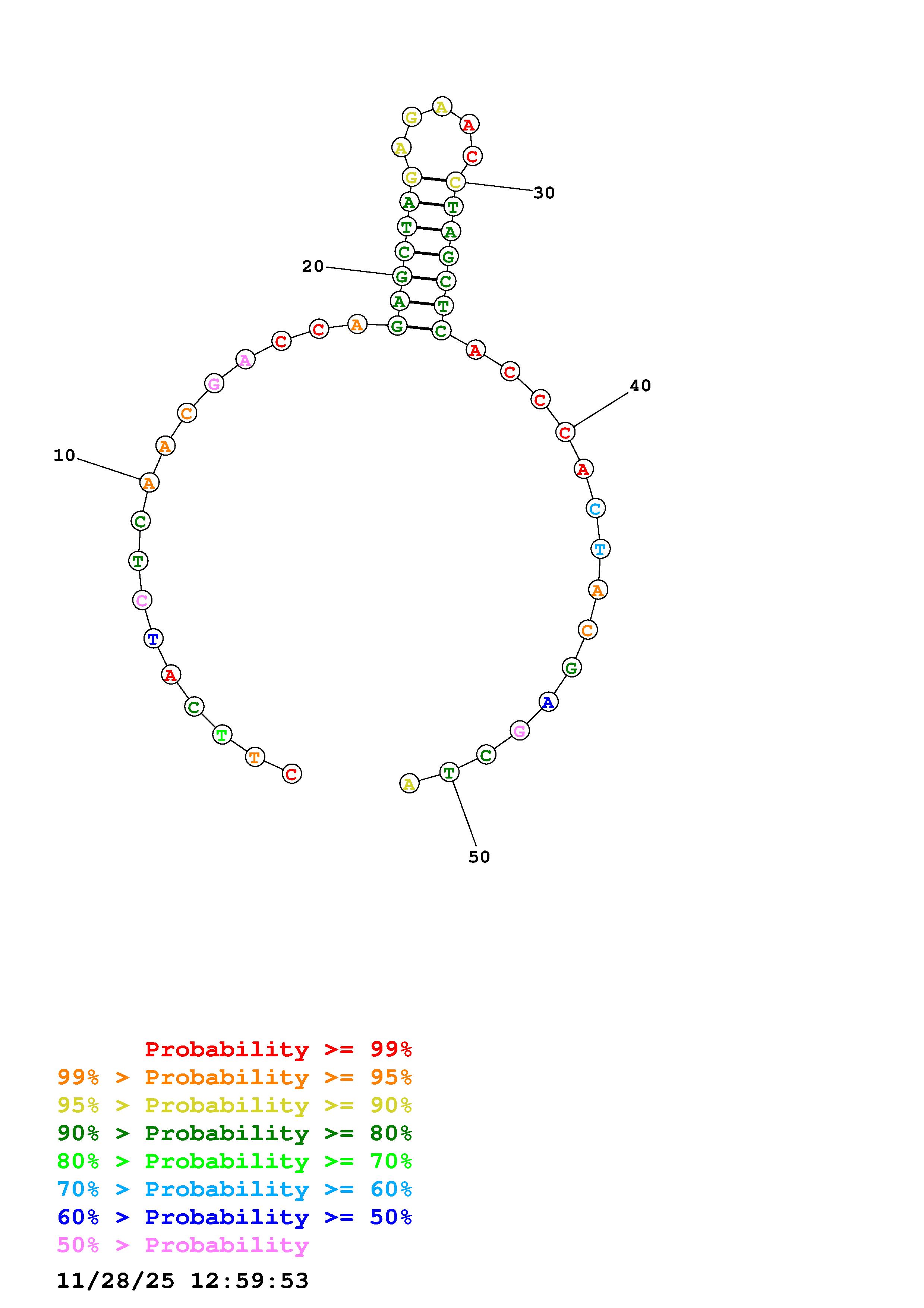 Fold Predict1.fasta Fold.ct --DNA --loop 30 --maximum 20 --percent 10 --temperature 298.15 --window 3