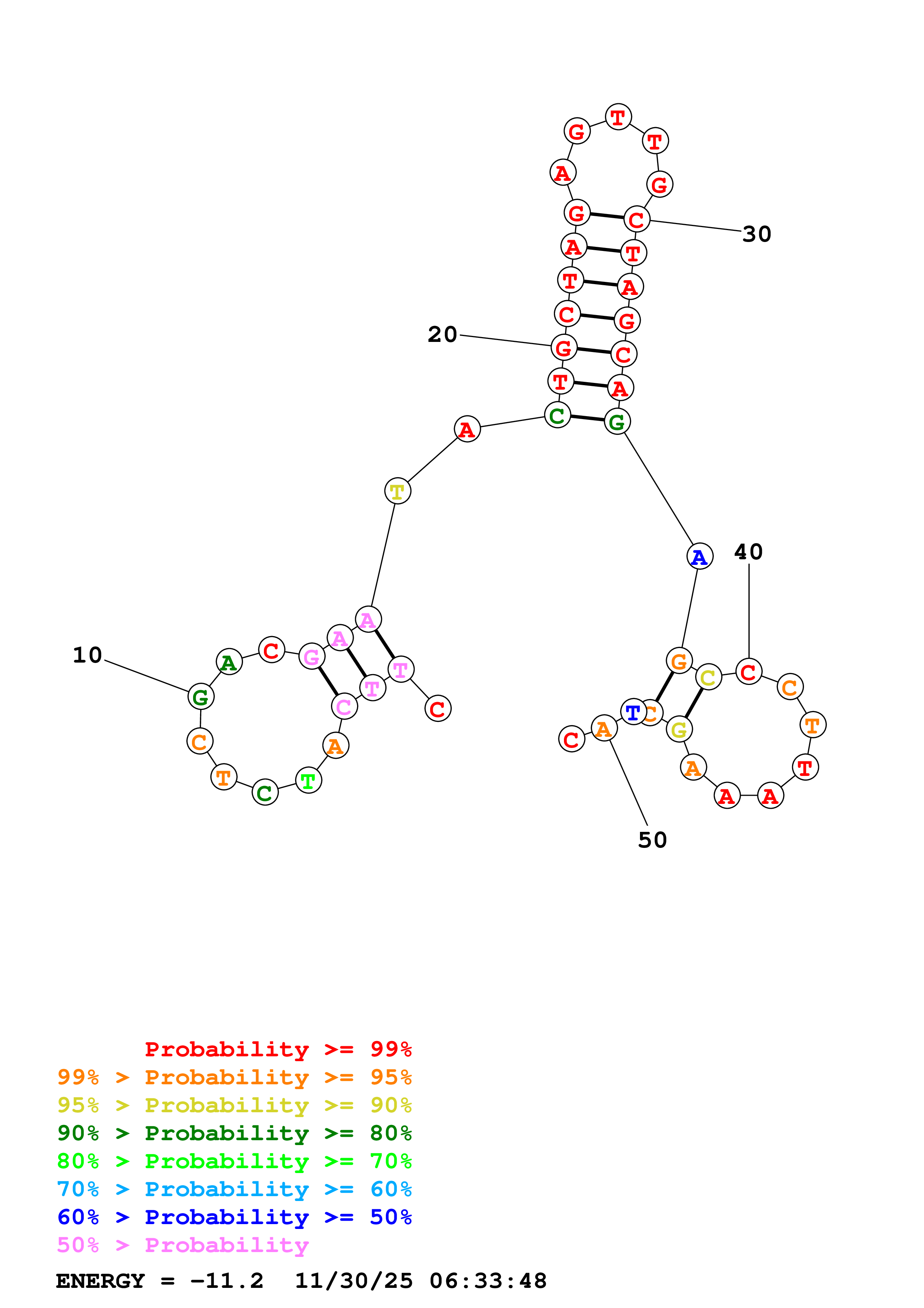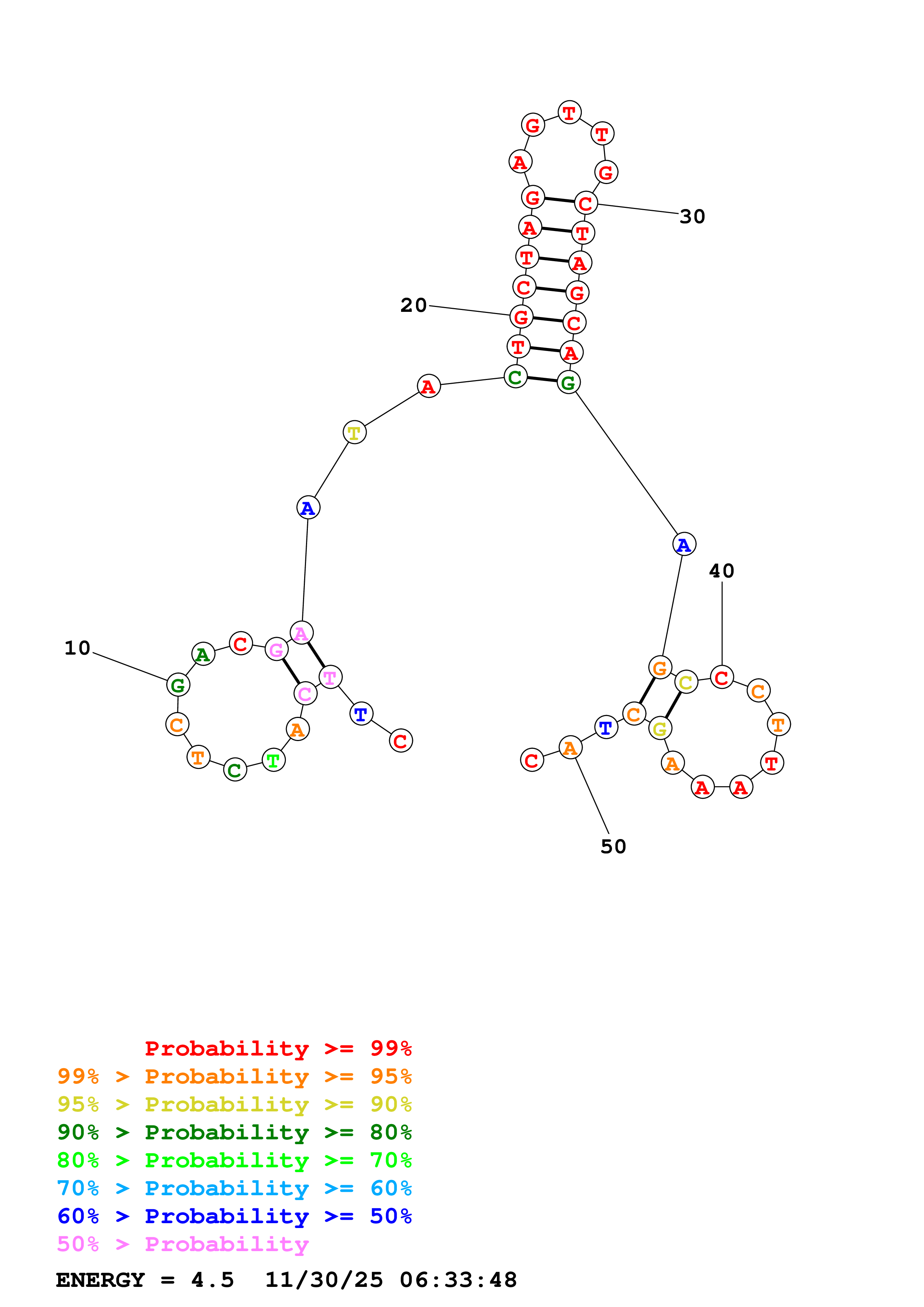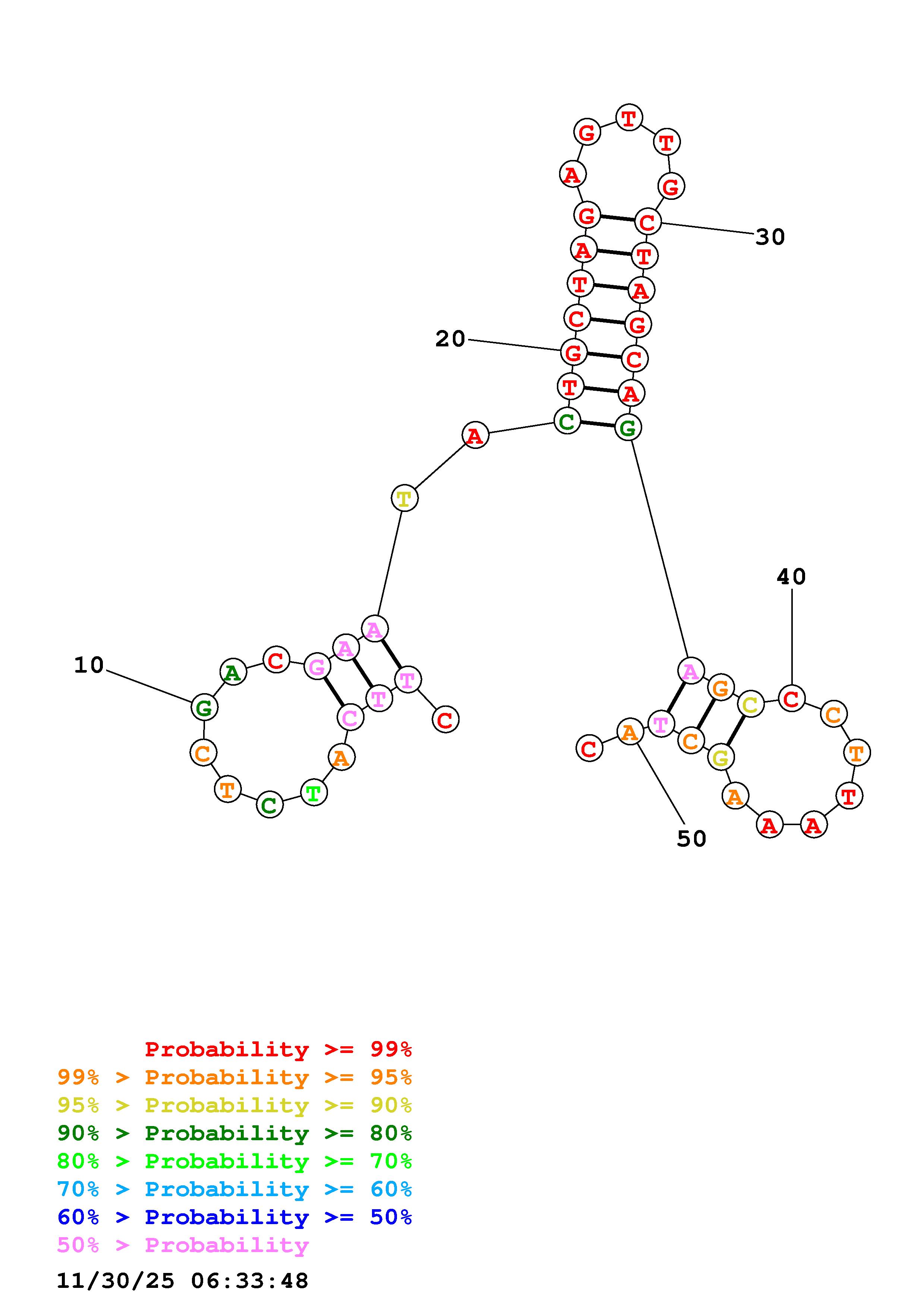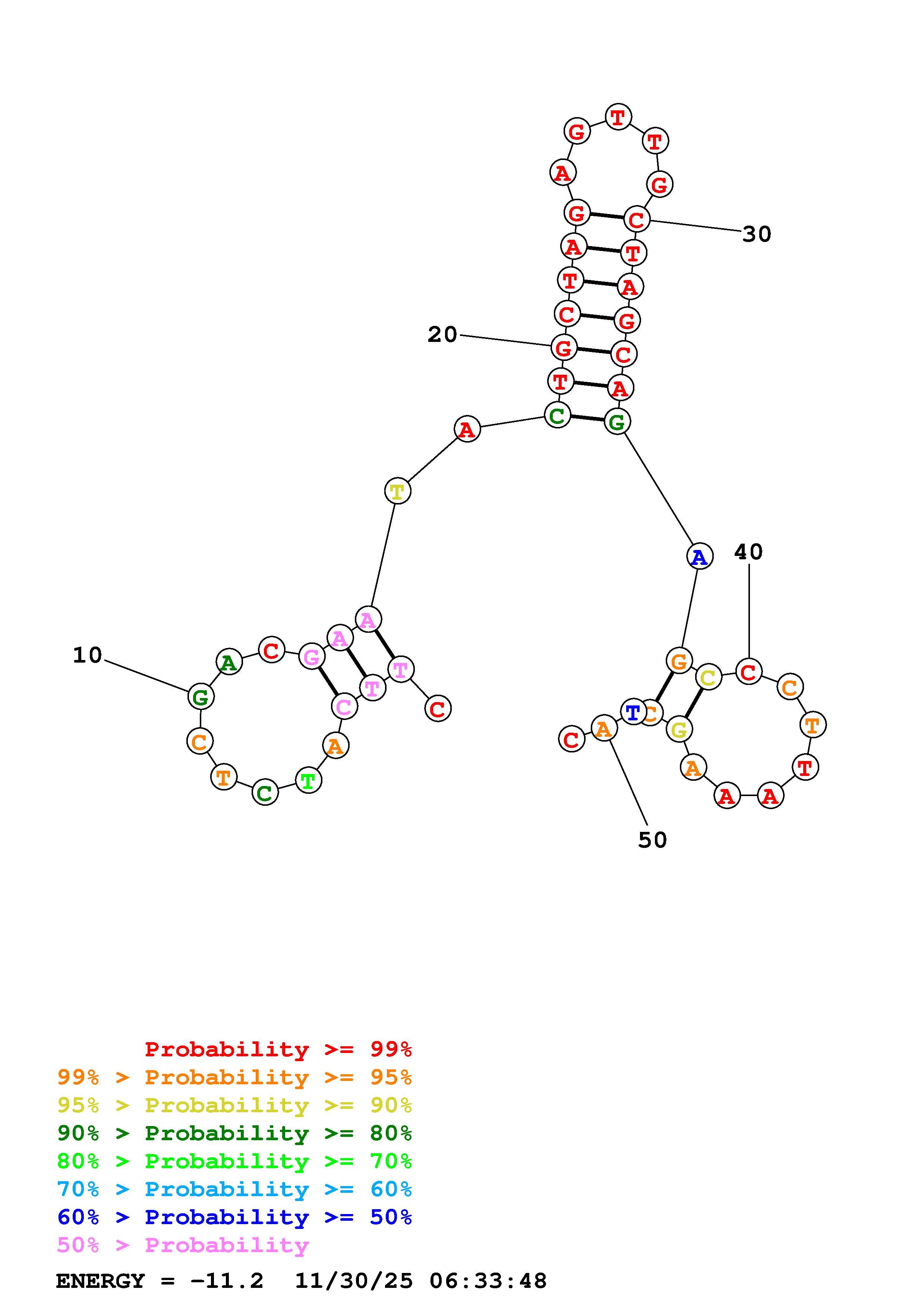 Fold Predict1.fasta Fold.ct --DNA --loop 30 --maximum 20 --percent 10 --temperature 298.15 --window 3