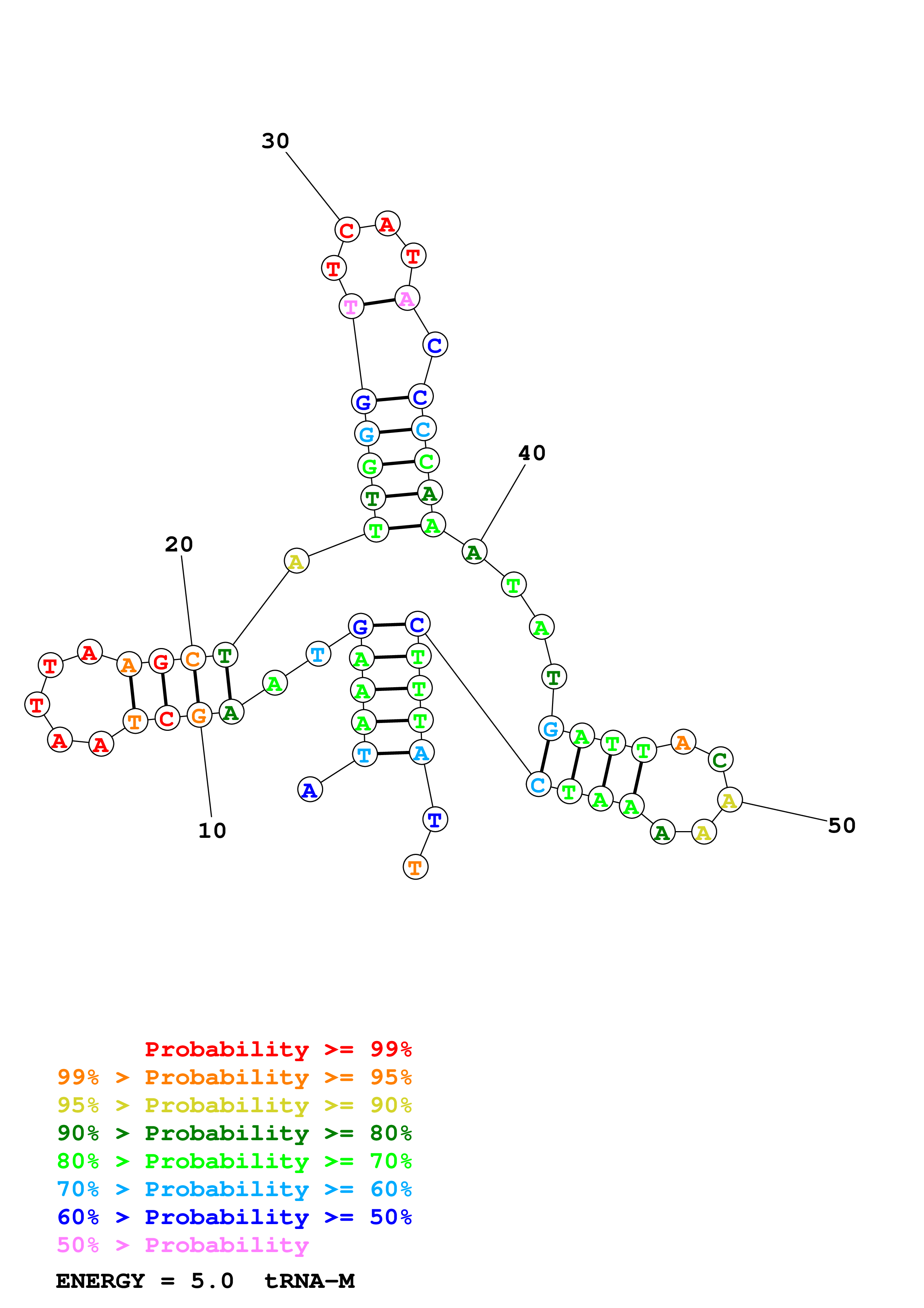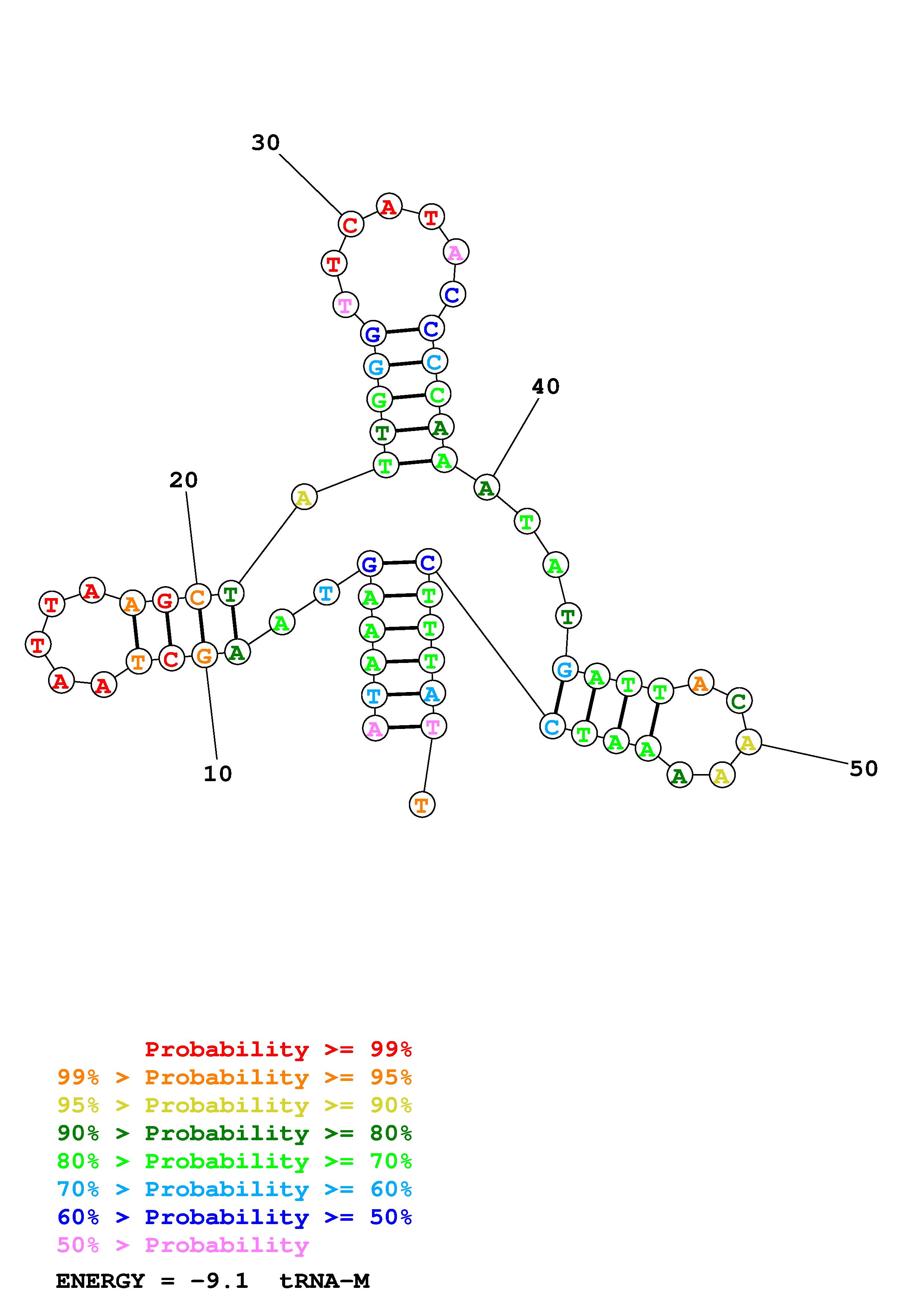 Fold tRNA_M.fasta Fold.ct --DNA --loop 30 --maximum 20 --percent 10 --temperature 310.15 --window 3