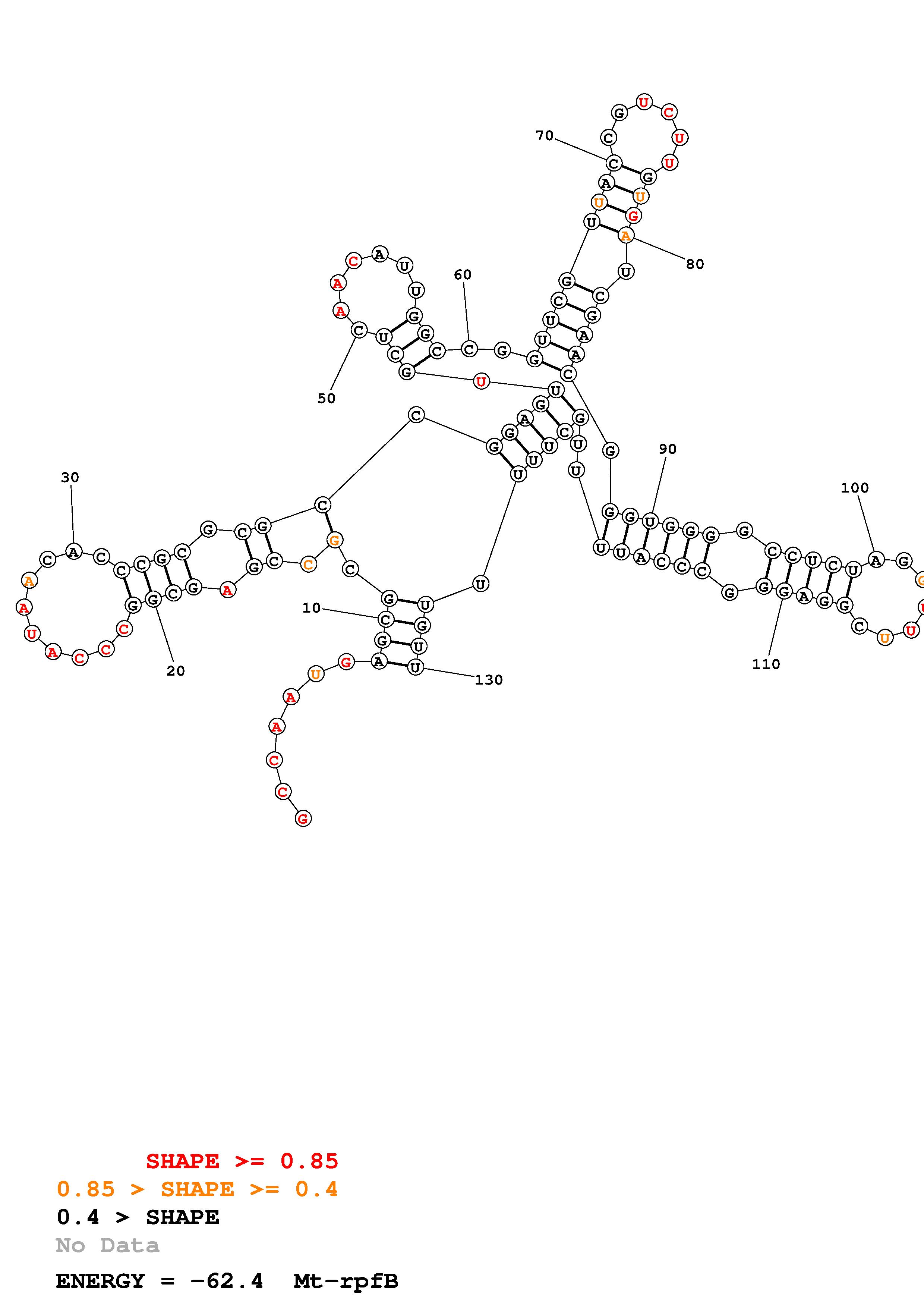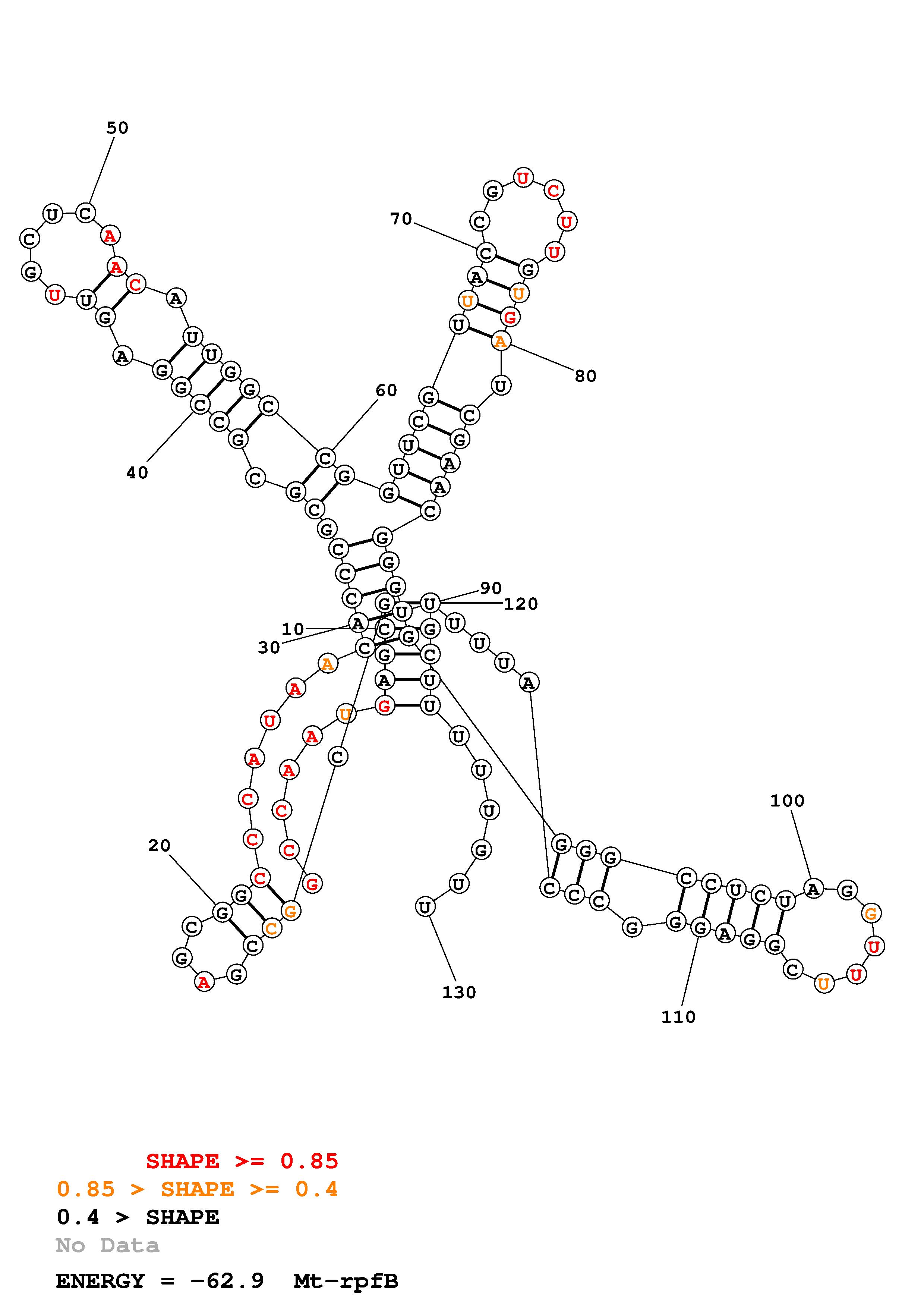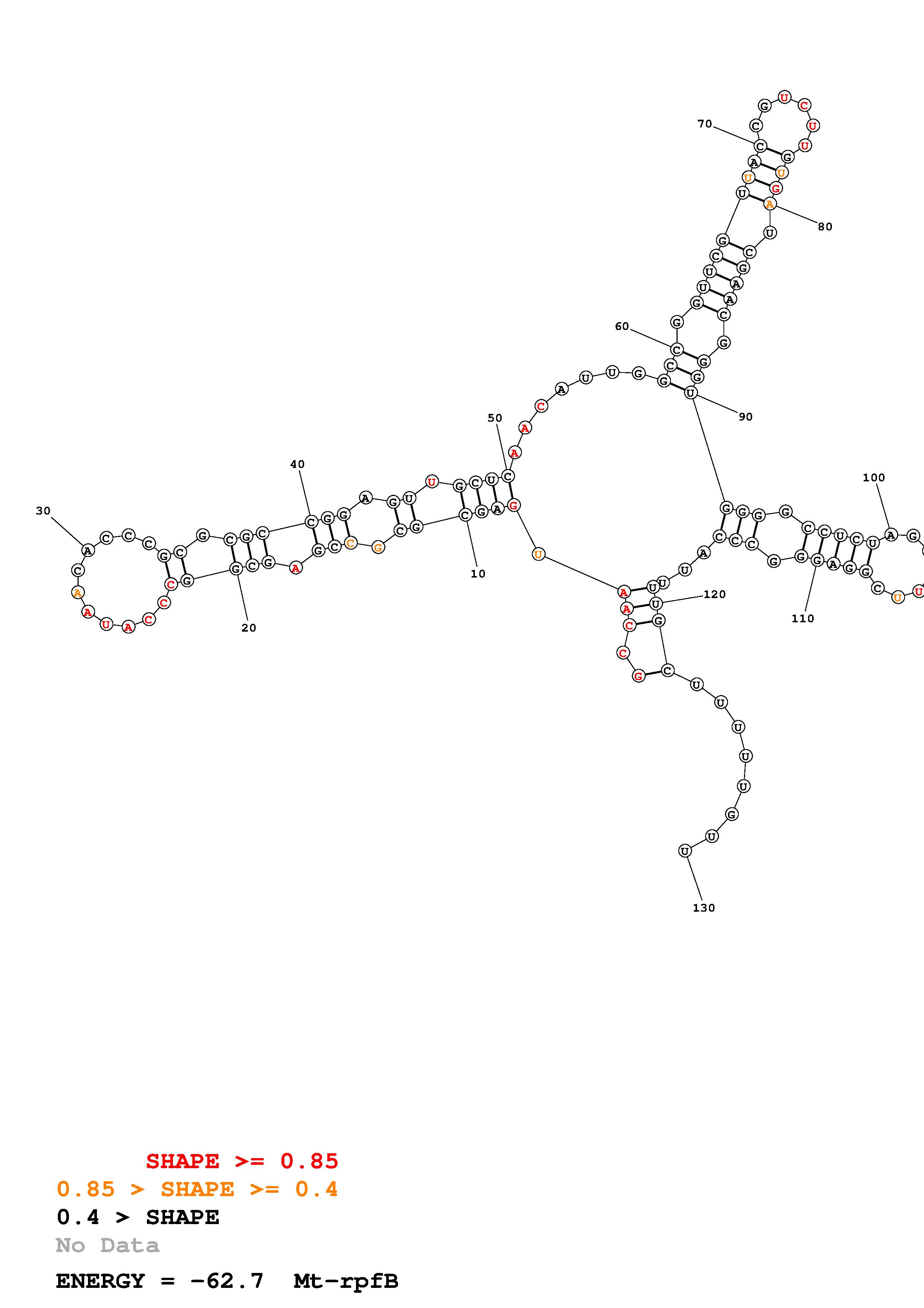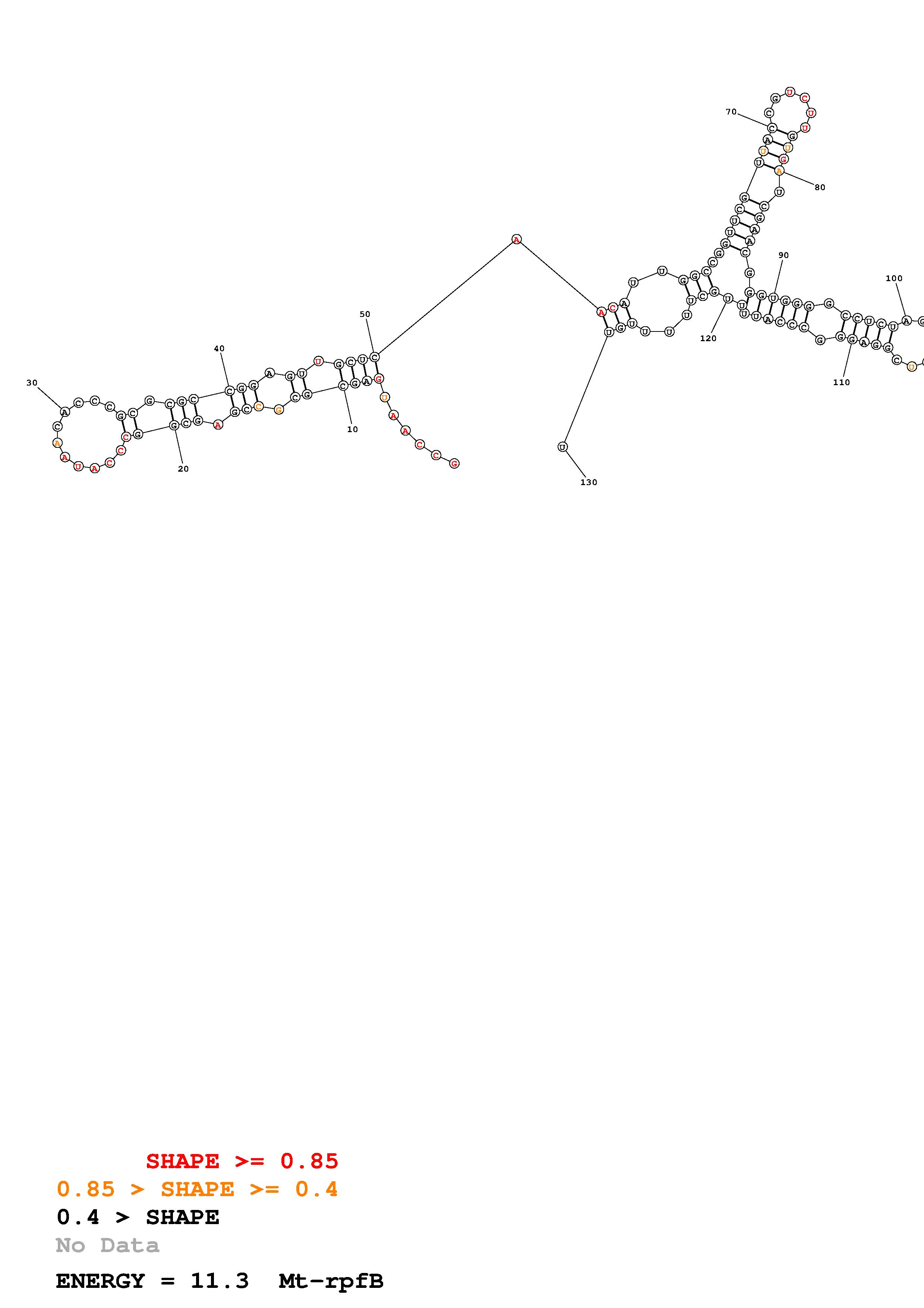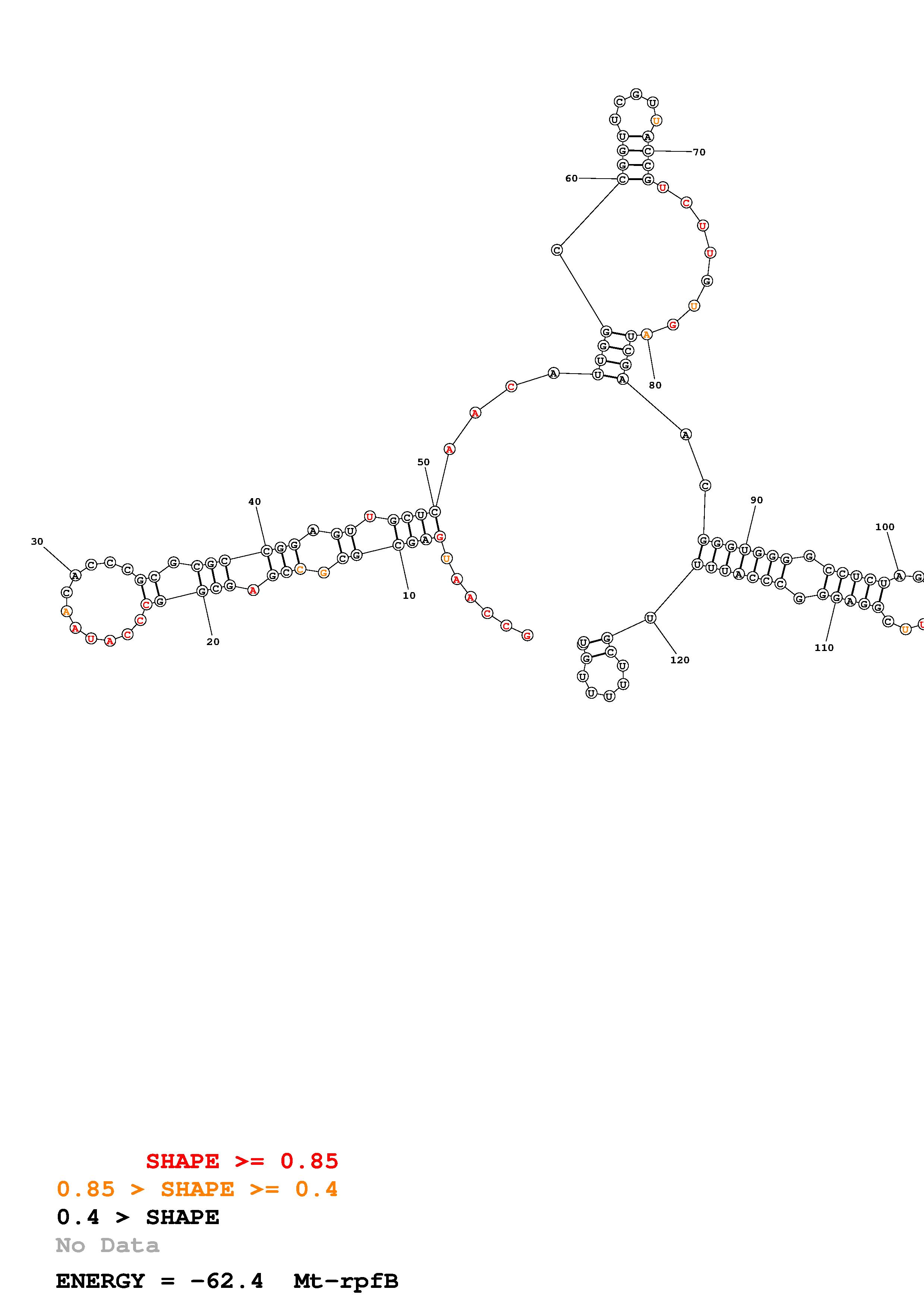 Fold Mt_rpfB_noLinker.fa Fold.ct --loop 30 --maximum 20 --percent 10 --SHAPE Mt_rpfB_L130.shape --SHAPEintercept -0.3 --SHAPEslope 1.1 --temperature 310.15 --window 3