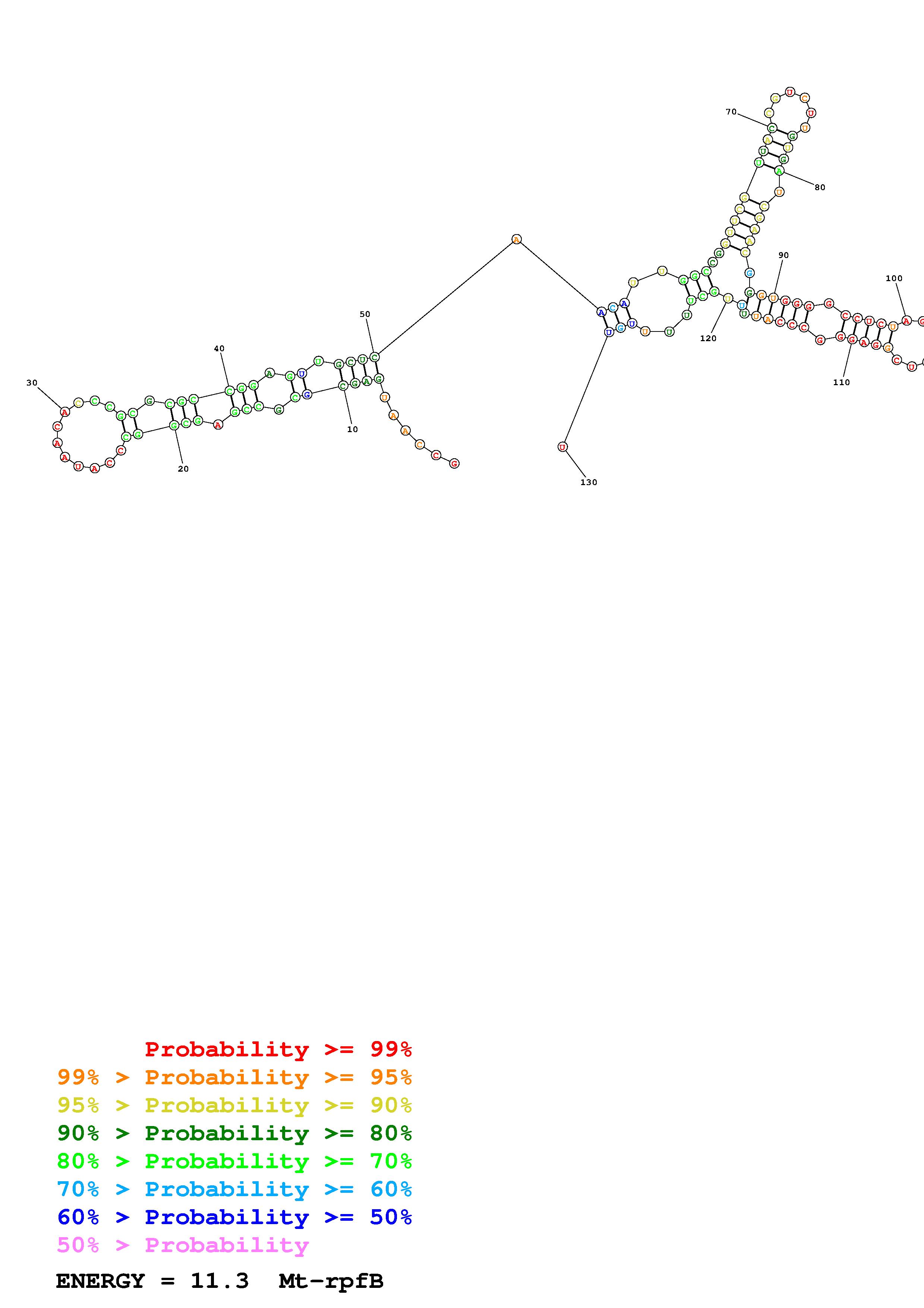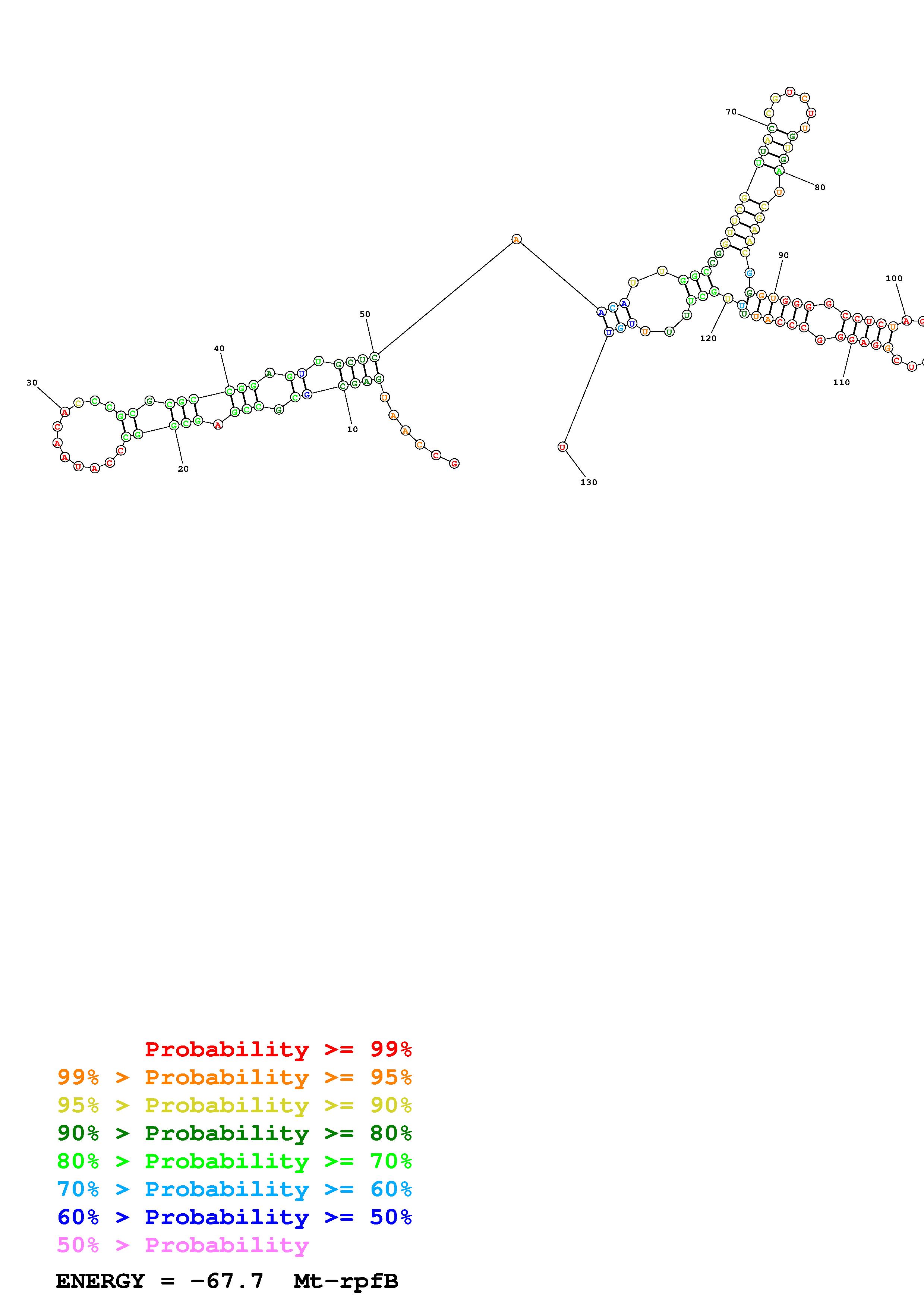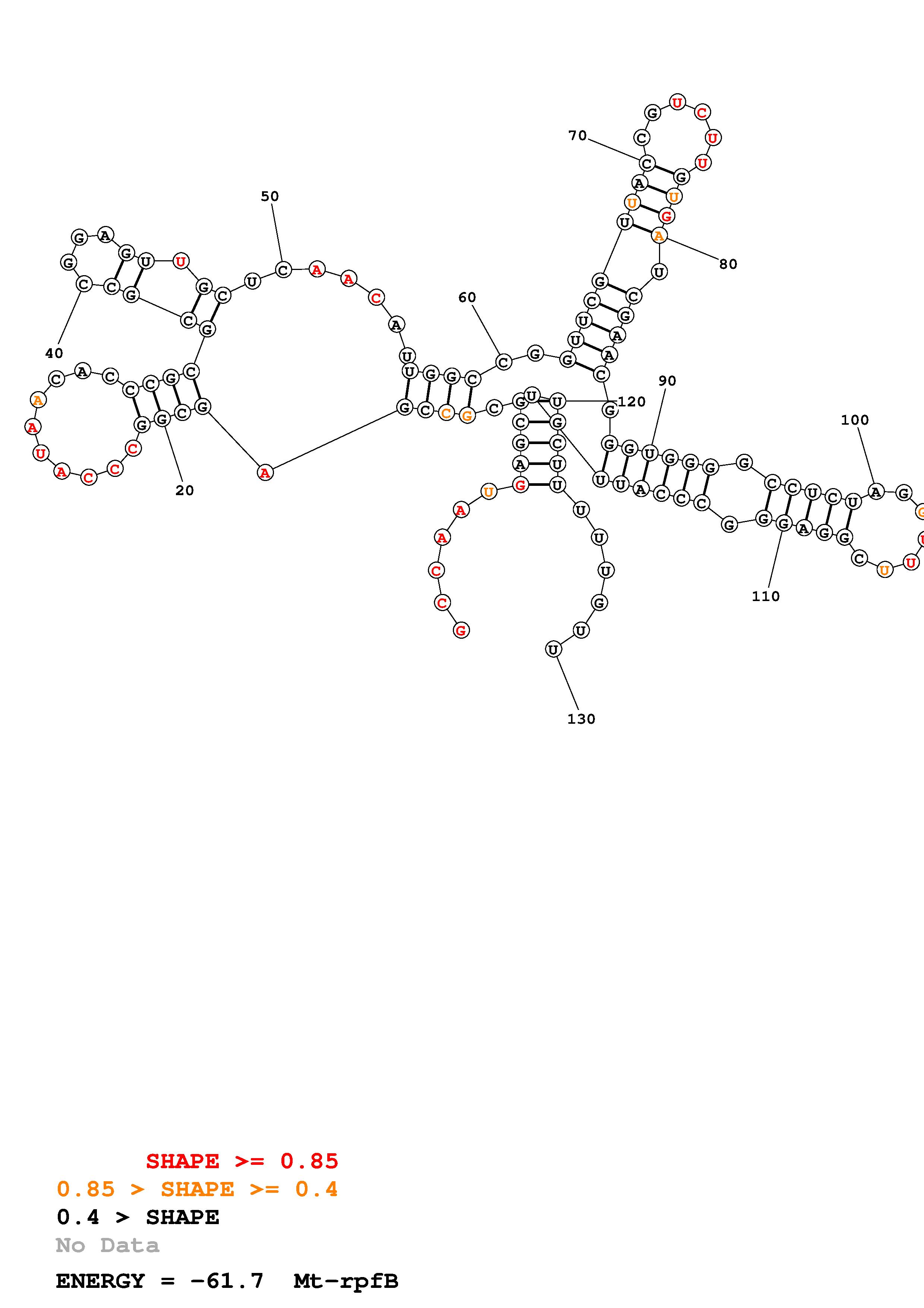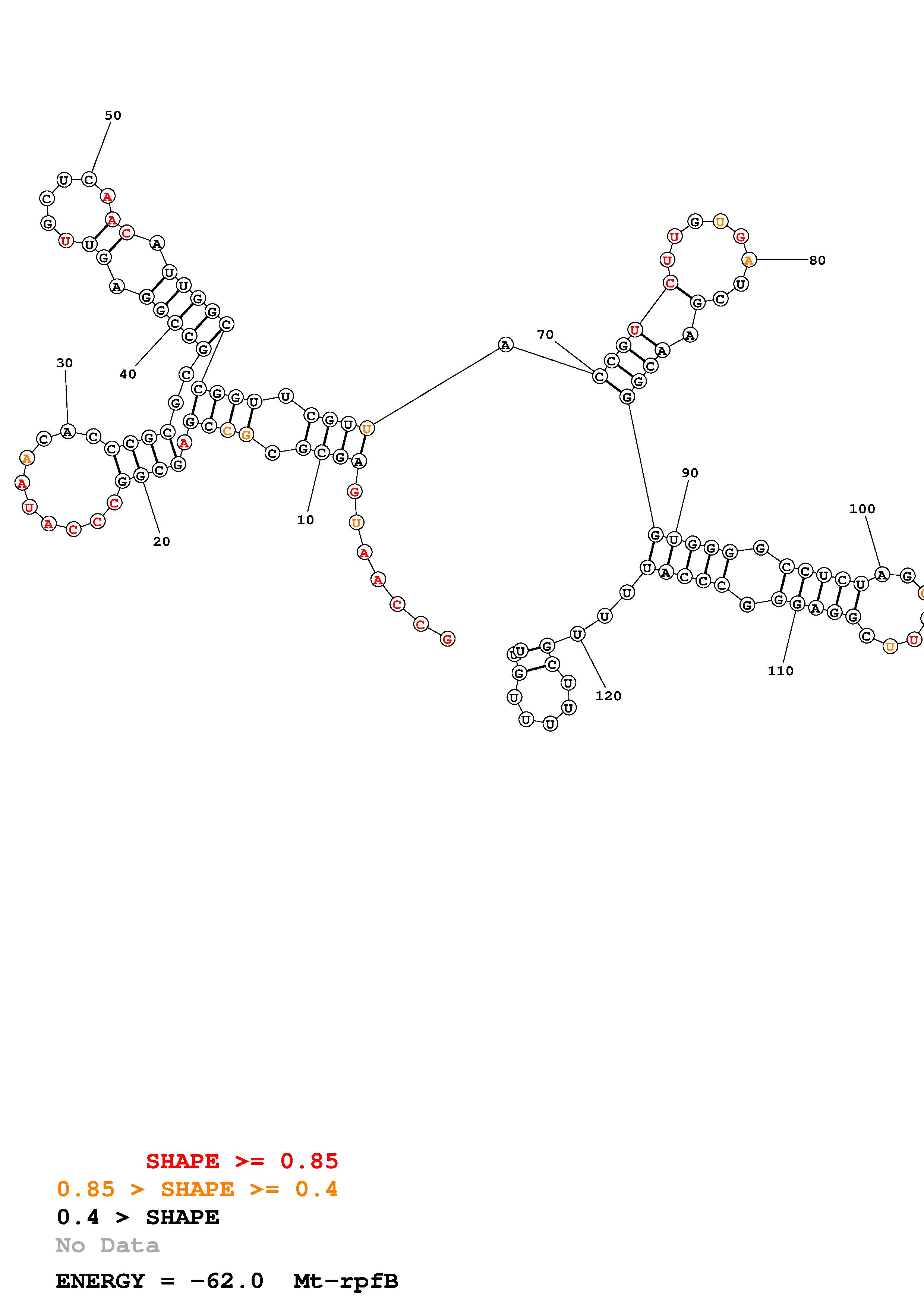 Fold Mt_rpfB_noLinker.fa Fold.ct --loop 30 --maximum 20 --percent 10 --SHAPE Mt_rpfB_L130.shape --SHAPEintercept -0.3 --SHAPEslope 1.1 --temperature 310.15 --window 3