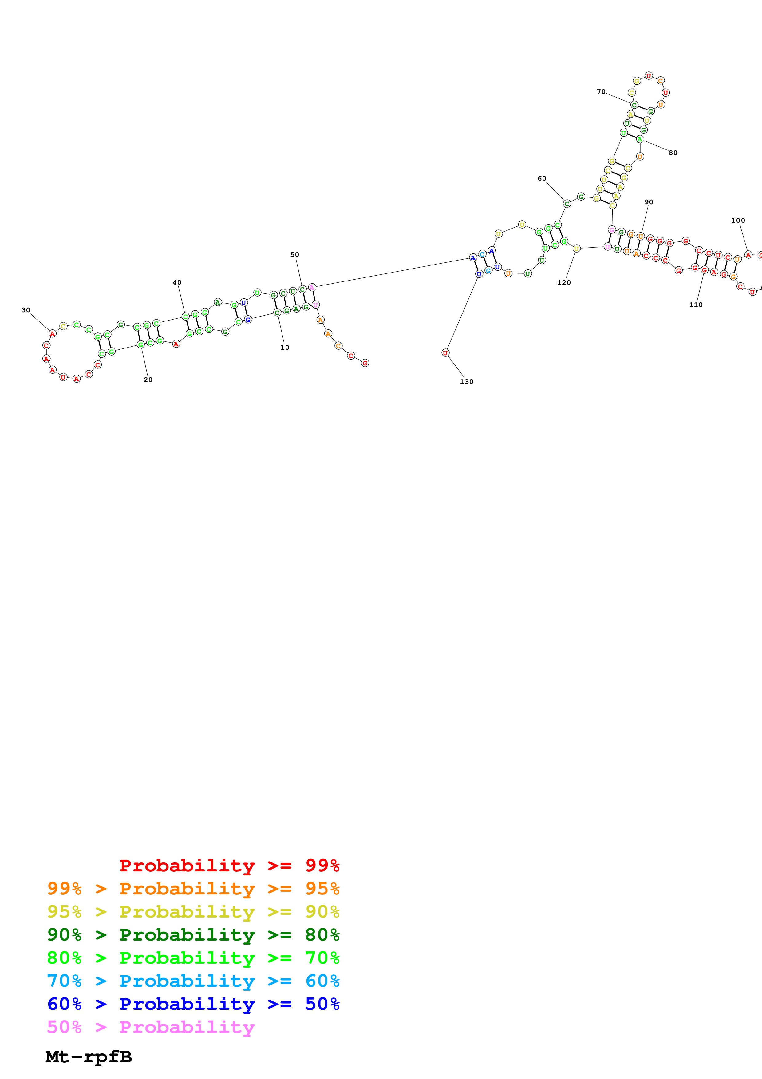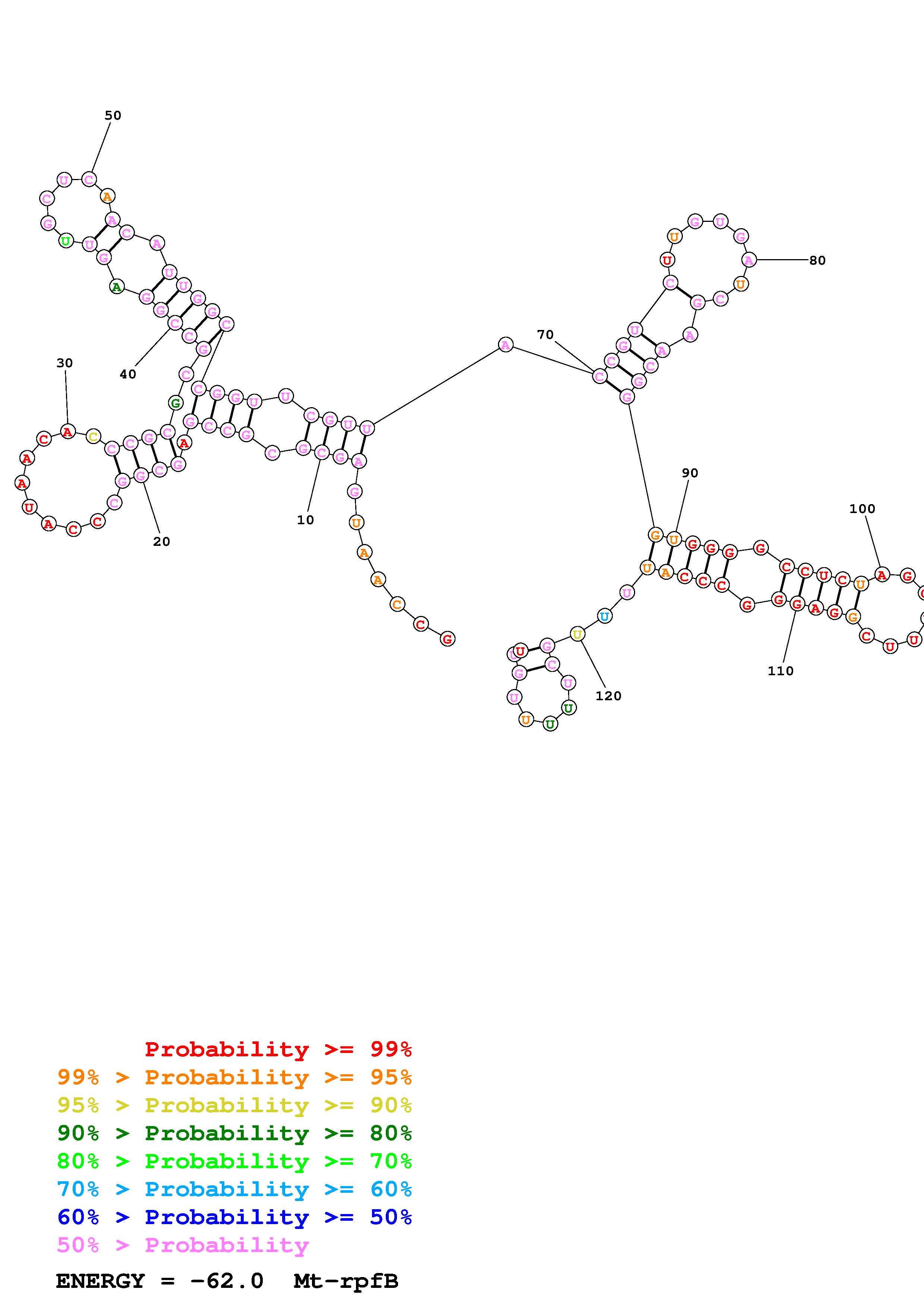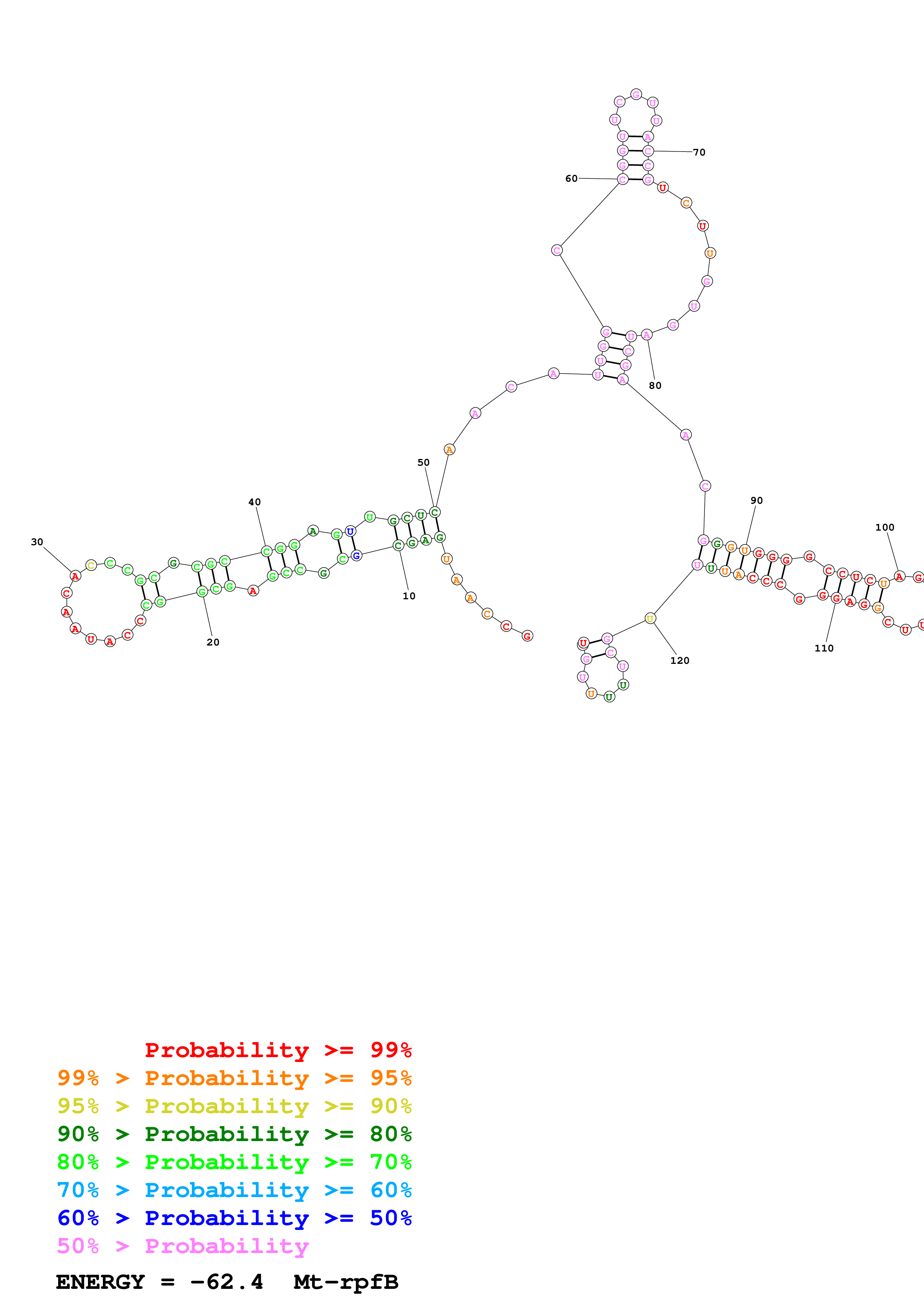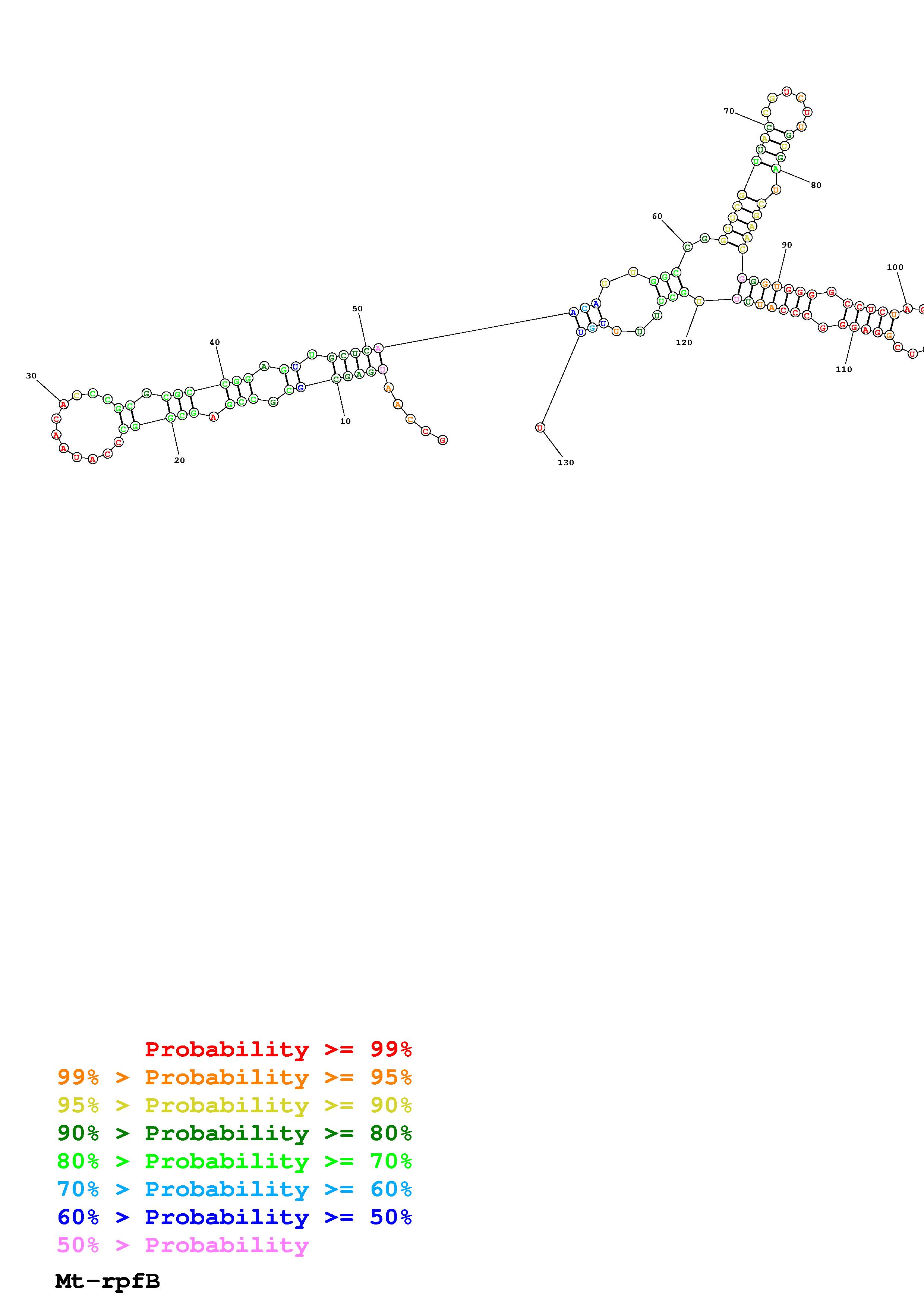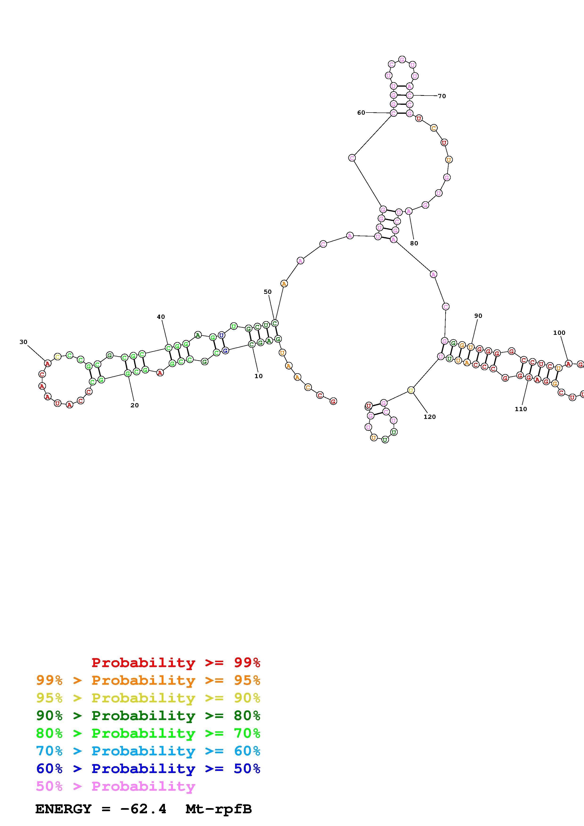 Fold Mt_rpfB_noLinker.fa Fold.ct --loop 30 --maximum 20 --percent 10 --SHAPE Mt_rpfB_L130.shape --SHAPEintercept -0.3 --SHAPEslope 1.1 --temperature 310.15 --window 3