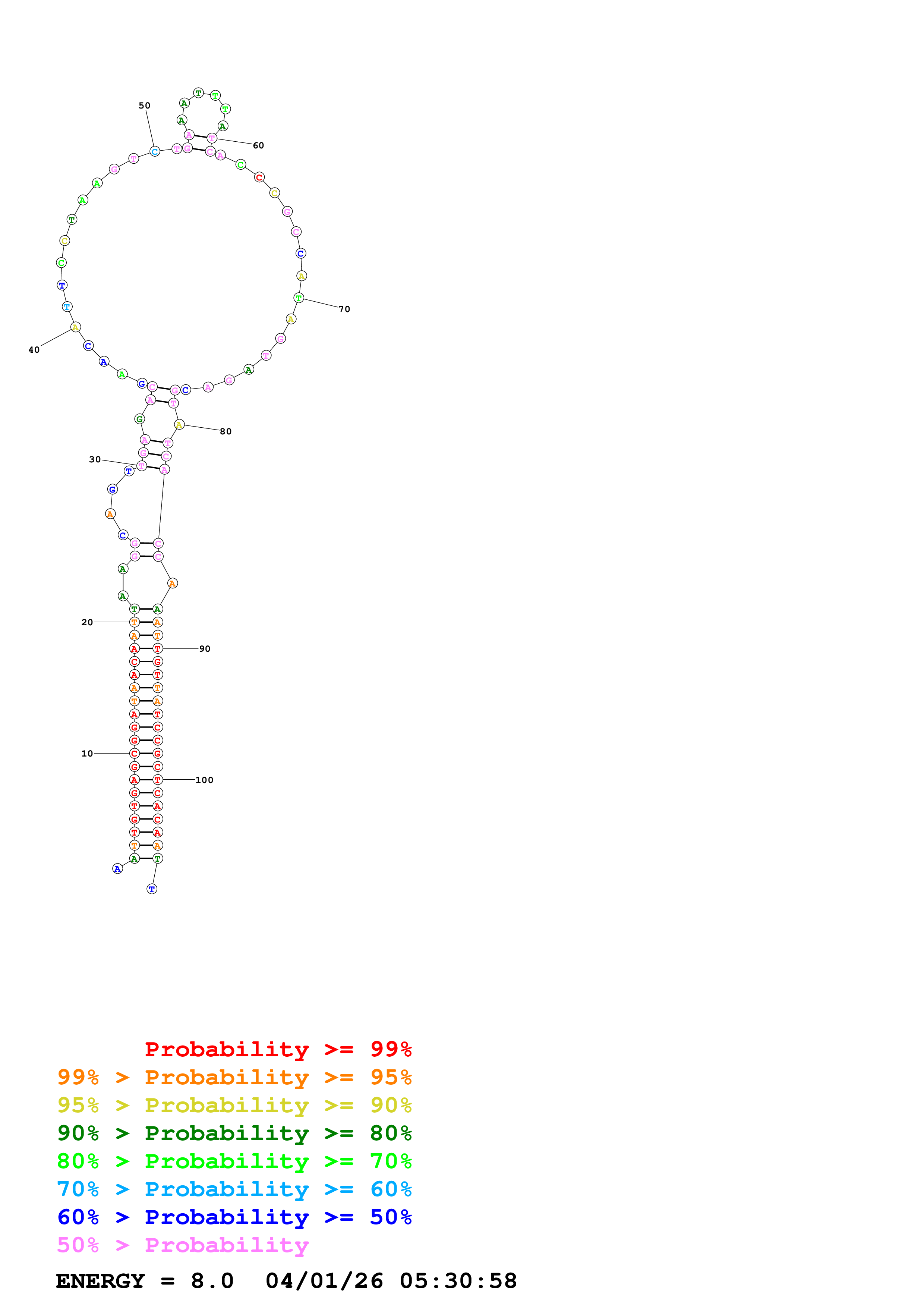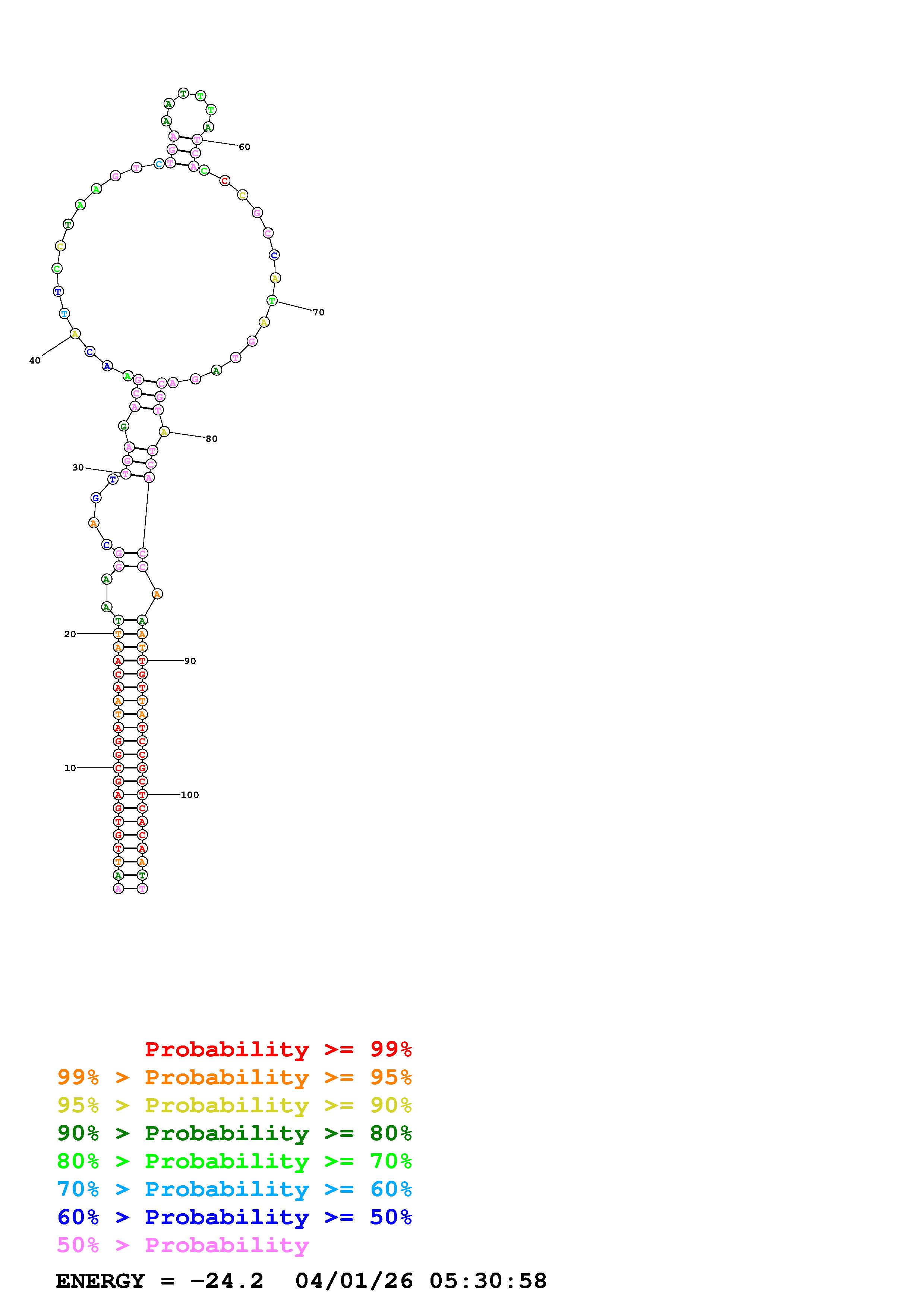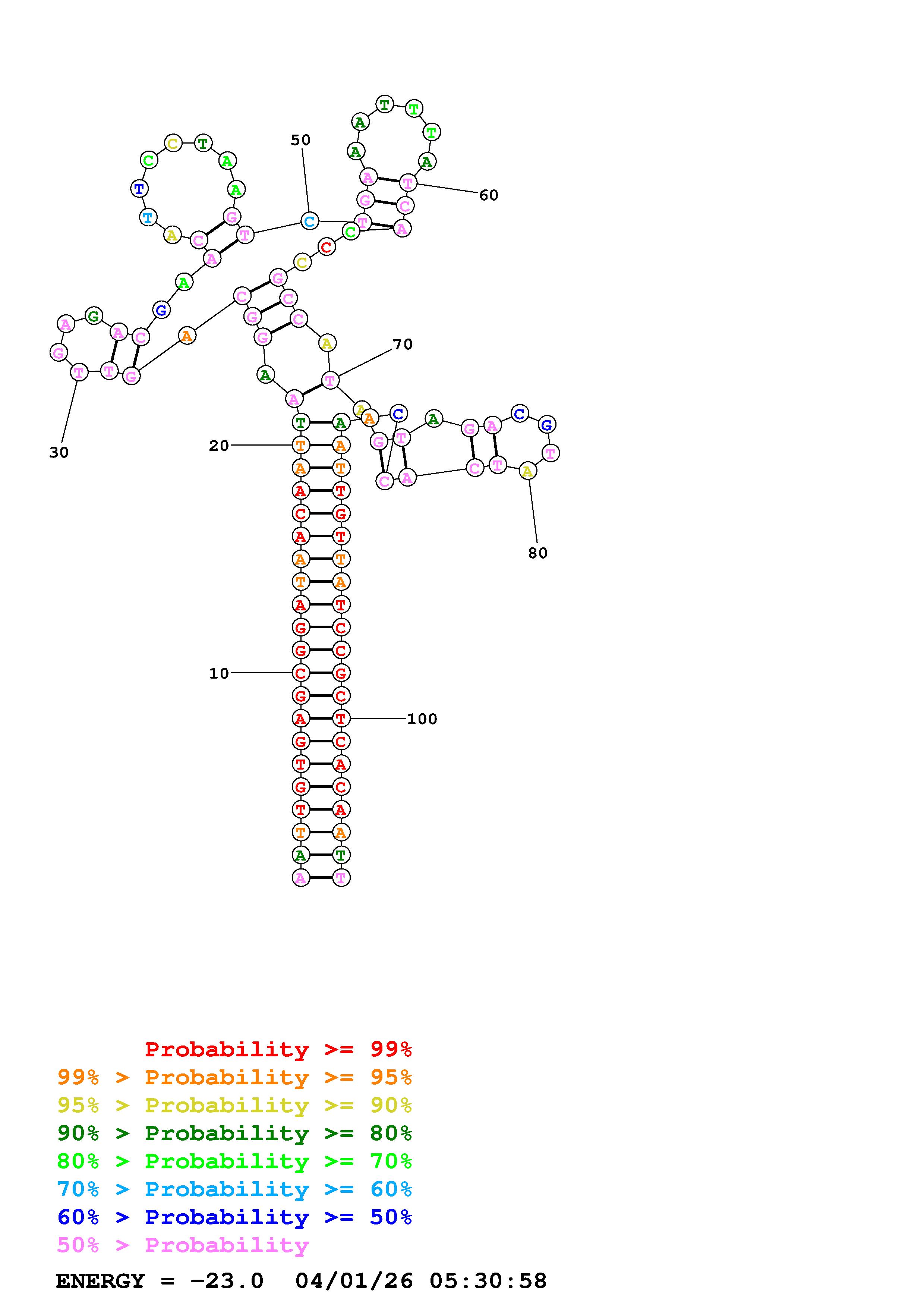 Fold Predict1.fasta Fold.ct --DNA --loop 30 --maximum 20 --percent 10 --temperature 310.15 --window 3