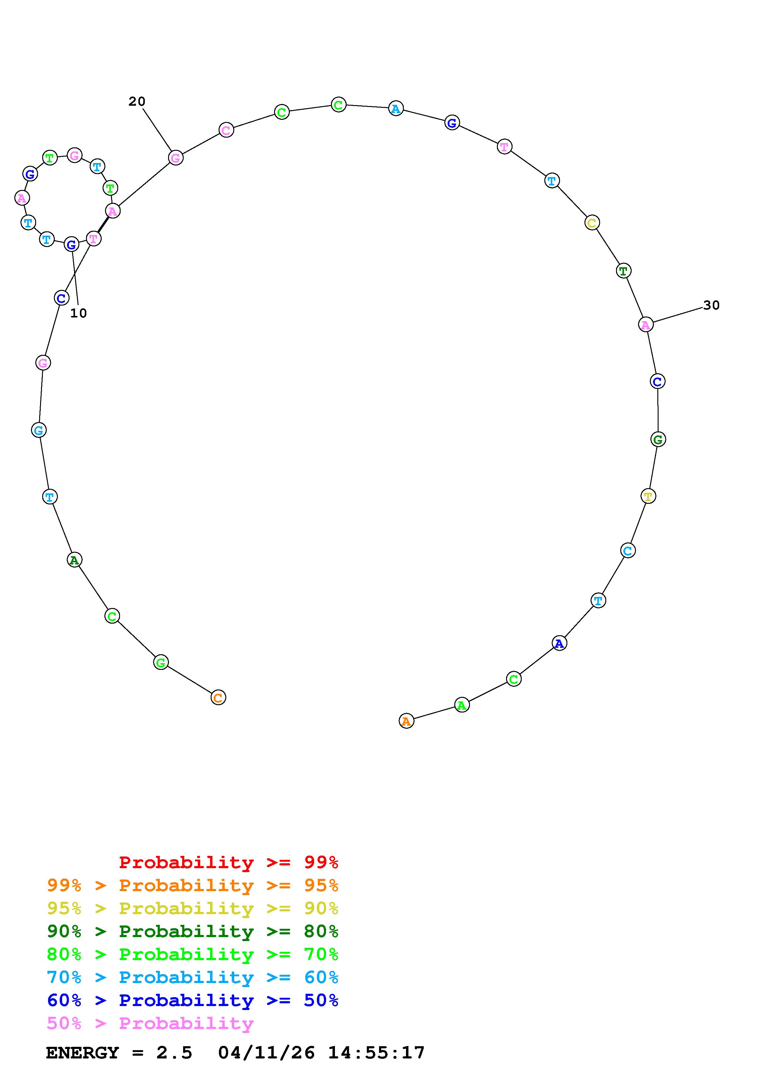 Fold Predict1.fasta Fold.ct --DNA --loop 30 --maximum 20 --percent 10 --temperature 343 --window 3