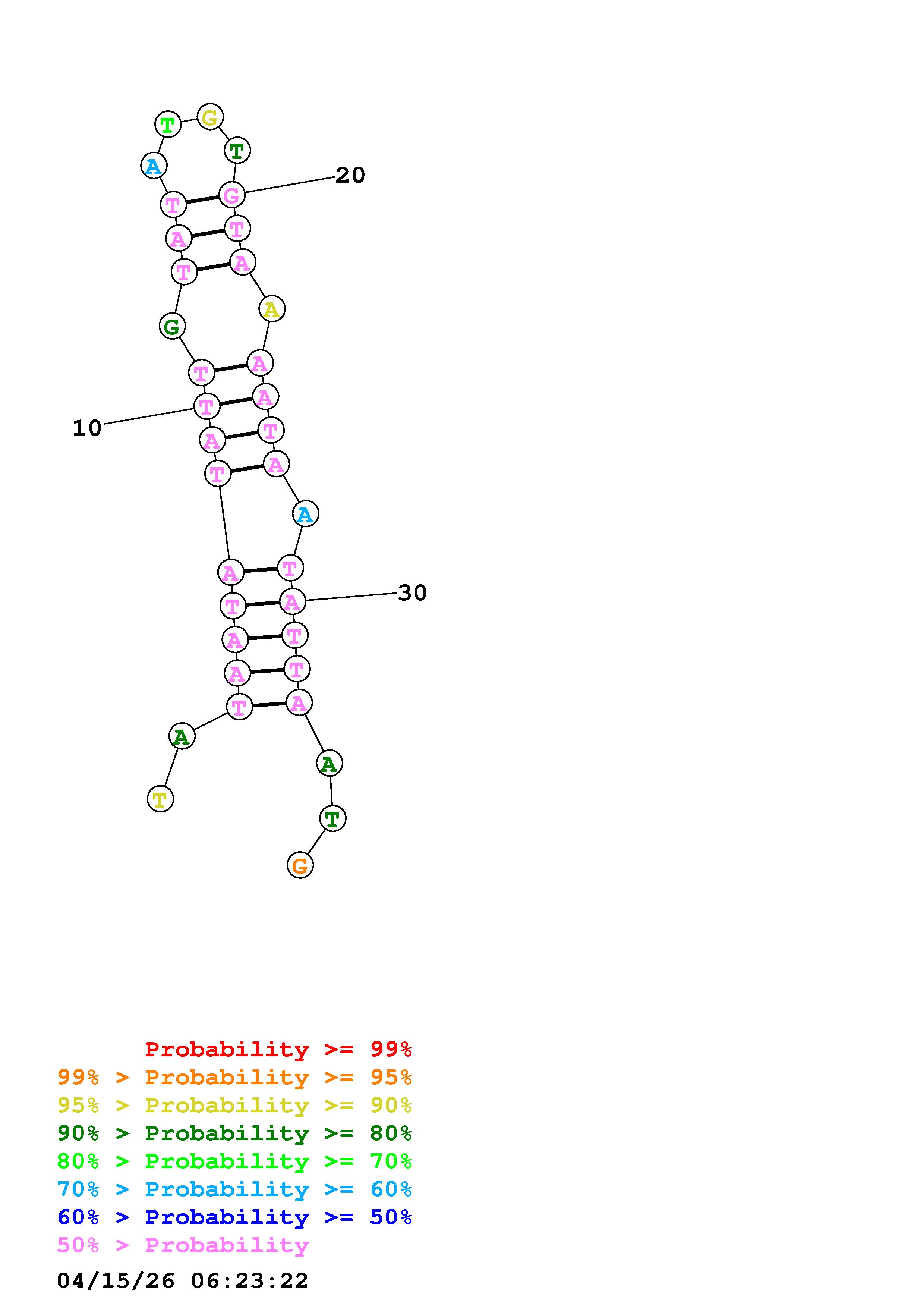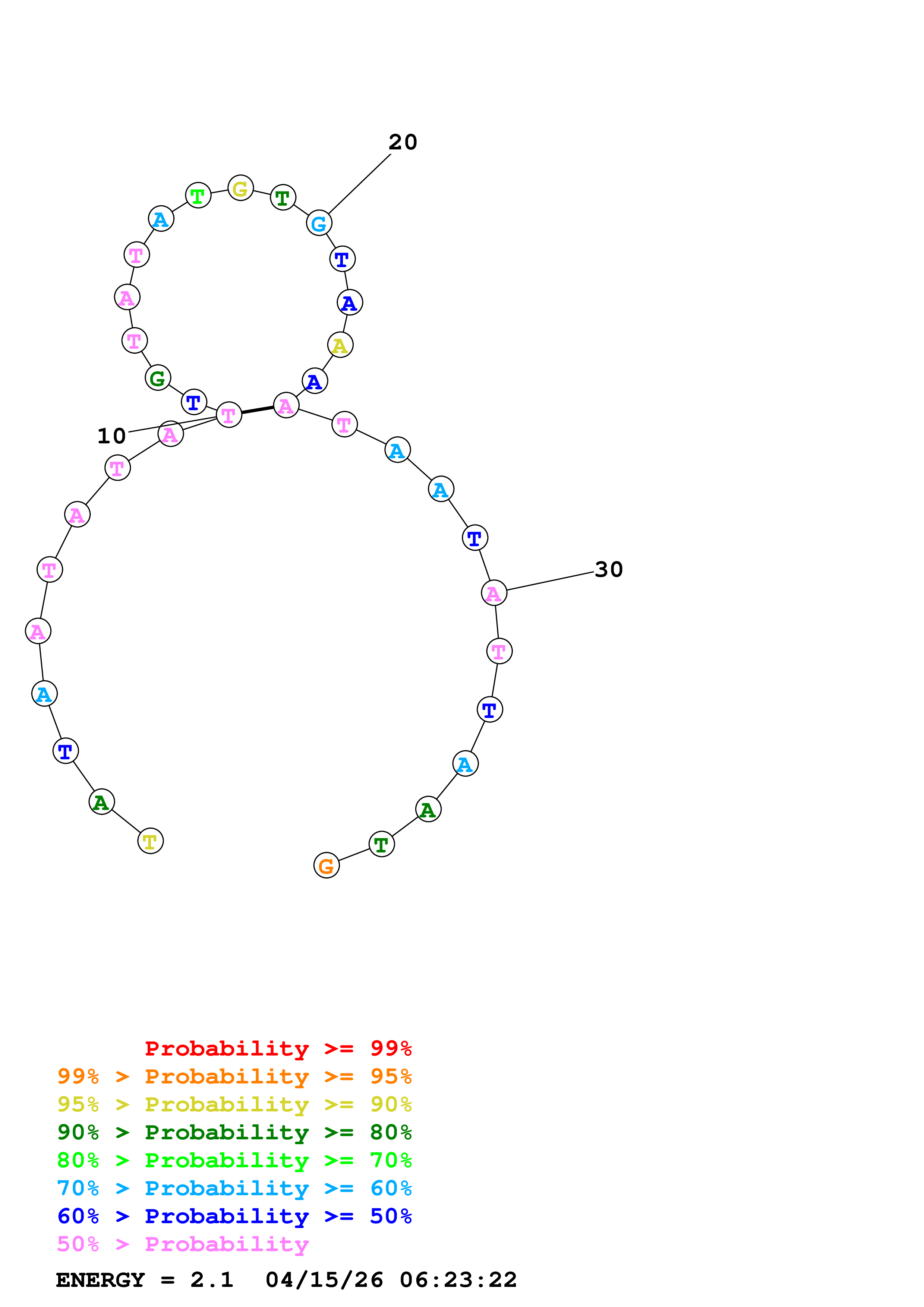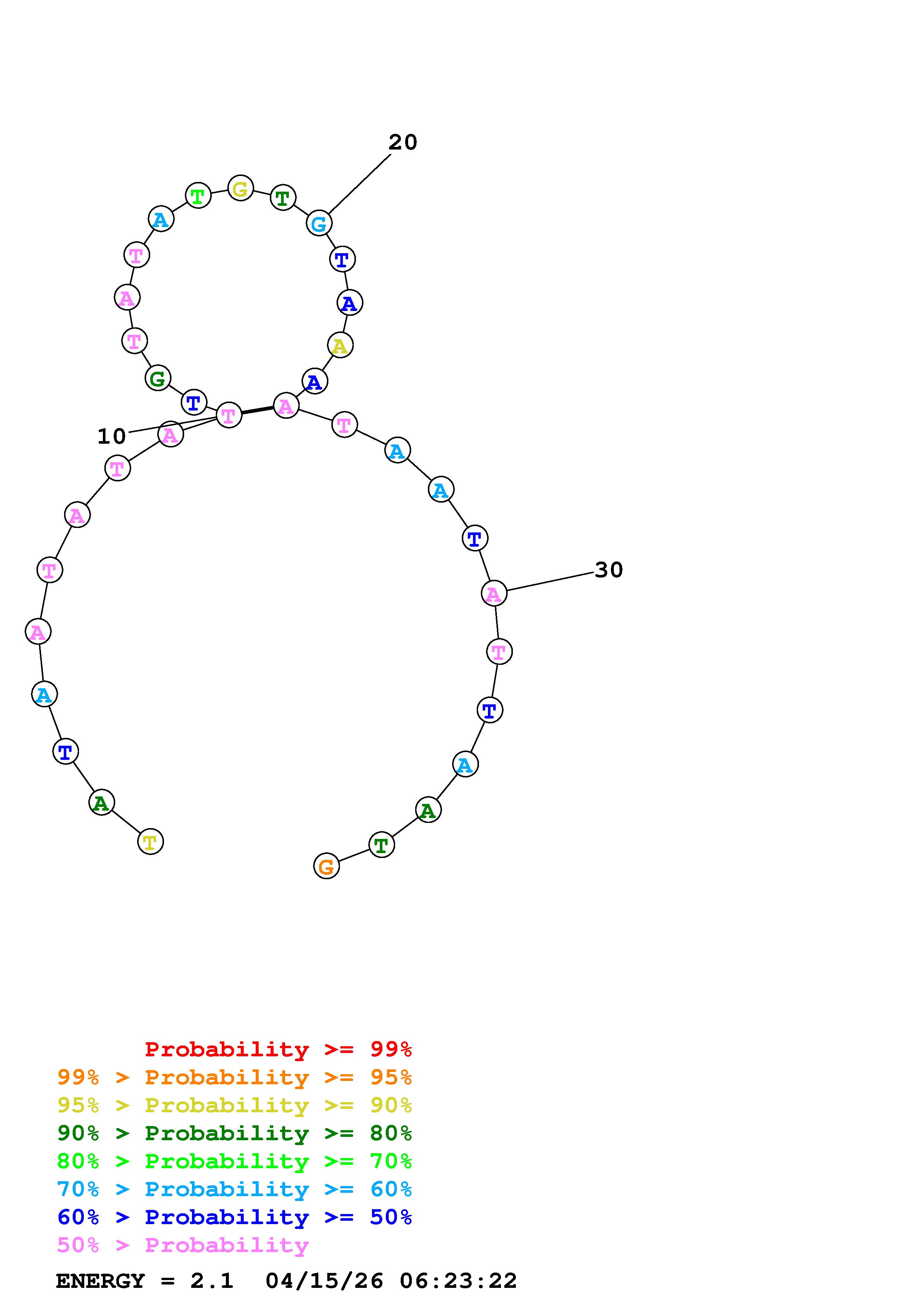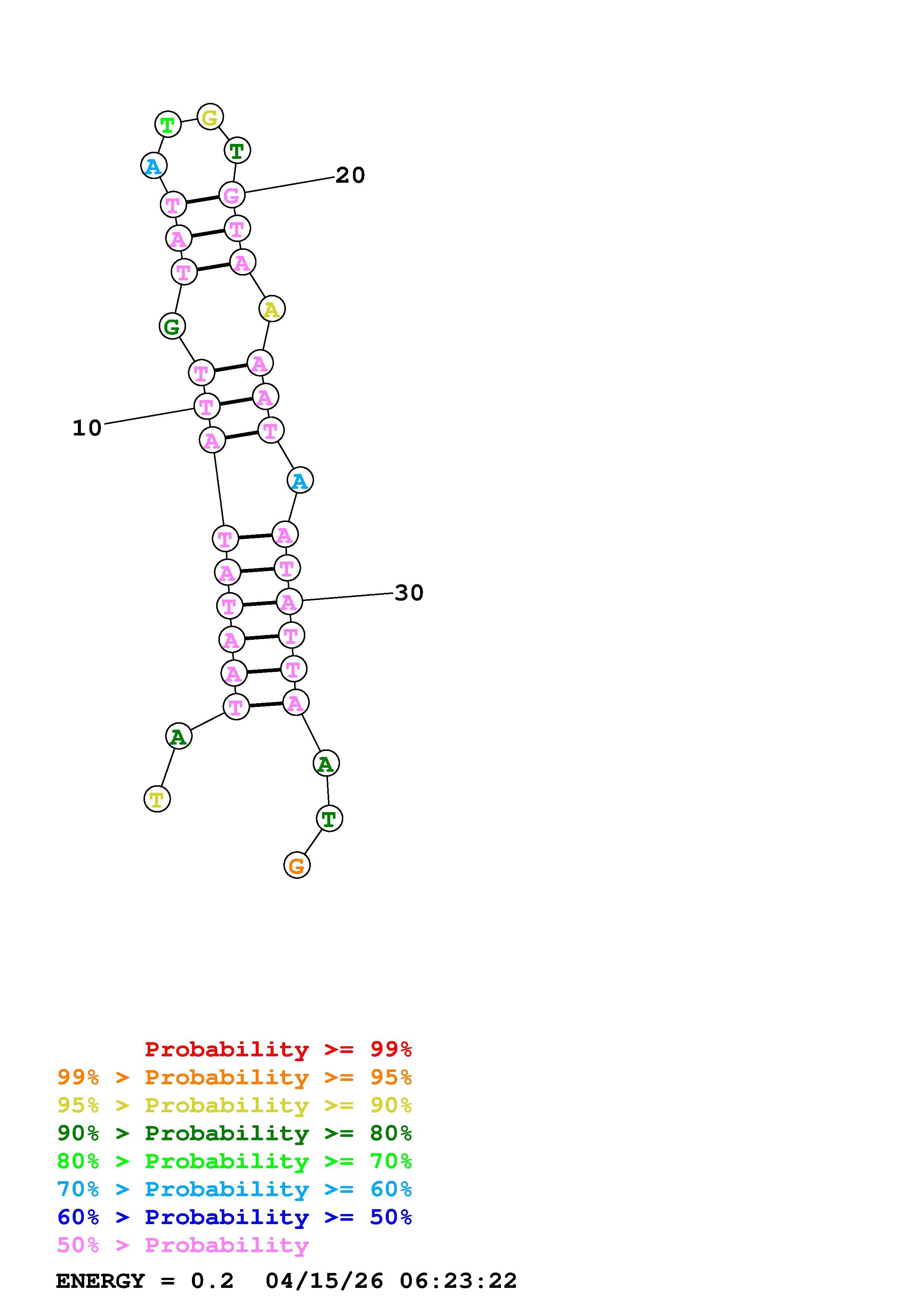 Fold Predict1.fasta Fold.ct --DNA --loop 30 --maximum 20 --percent 10 --temperature 323 --window 3