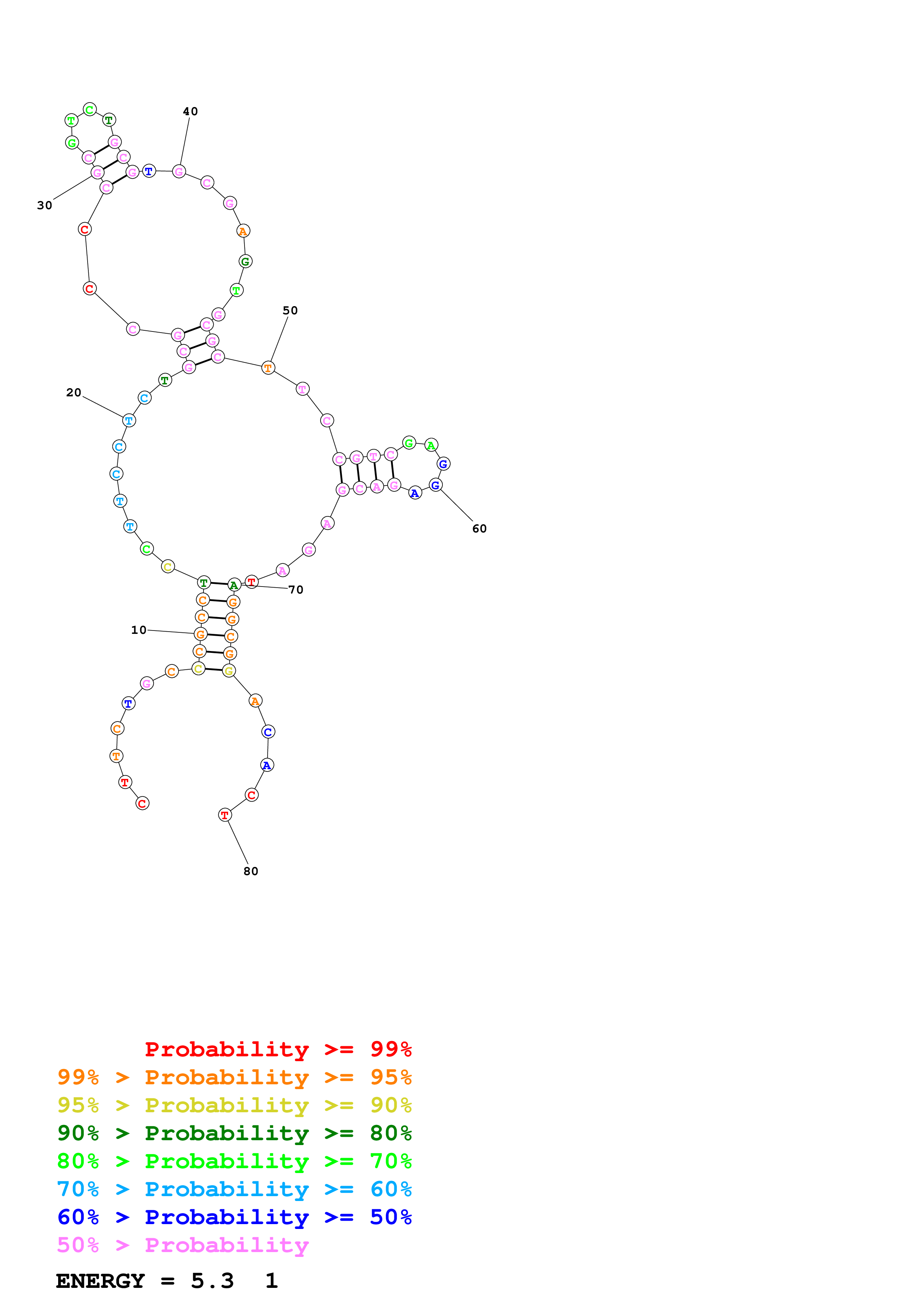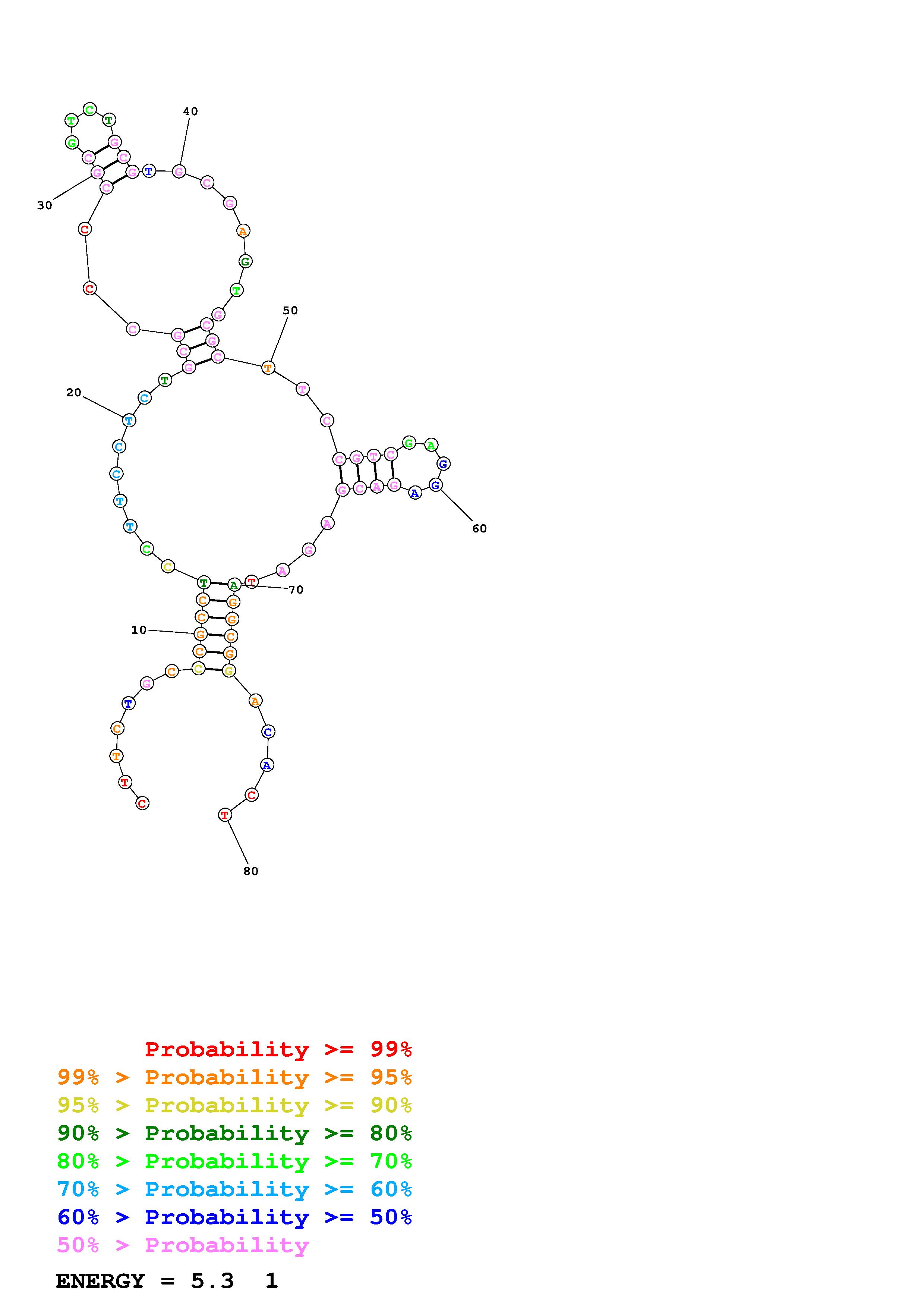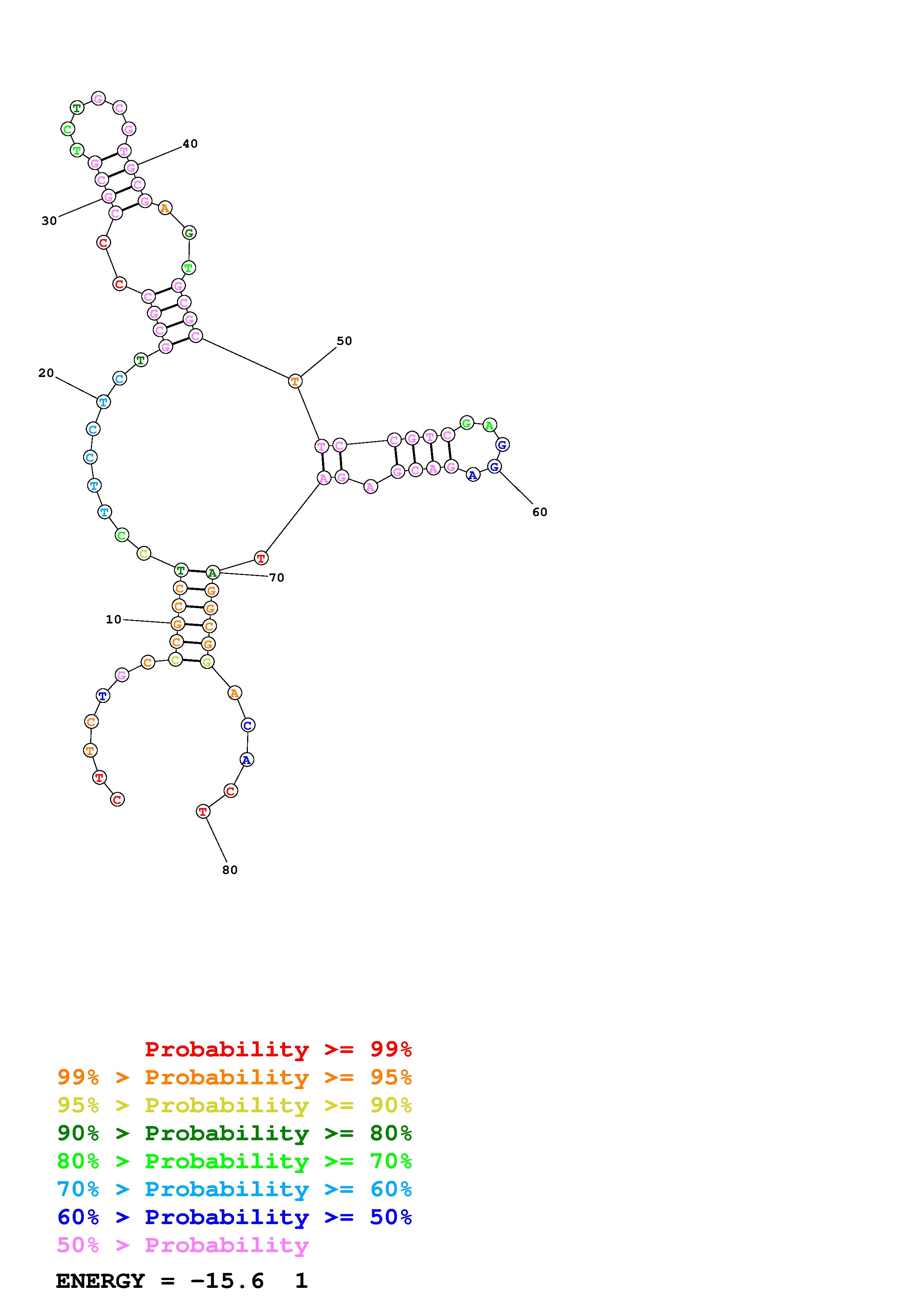 Fold Predict1.fasta Fold.ct --DNA --loop 30 --maximum 2 --percent 10 --temperature 310.15 --window 3